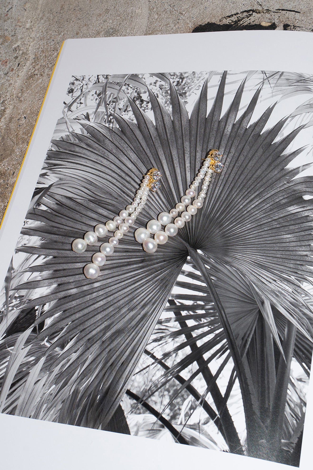 Handcrafted long pearl and zirconia recycled gold vermeil earrings. 18ct yellow gold-plated recycled sterling silver. Post back for pierced ears.