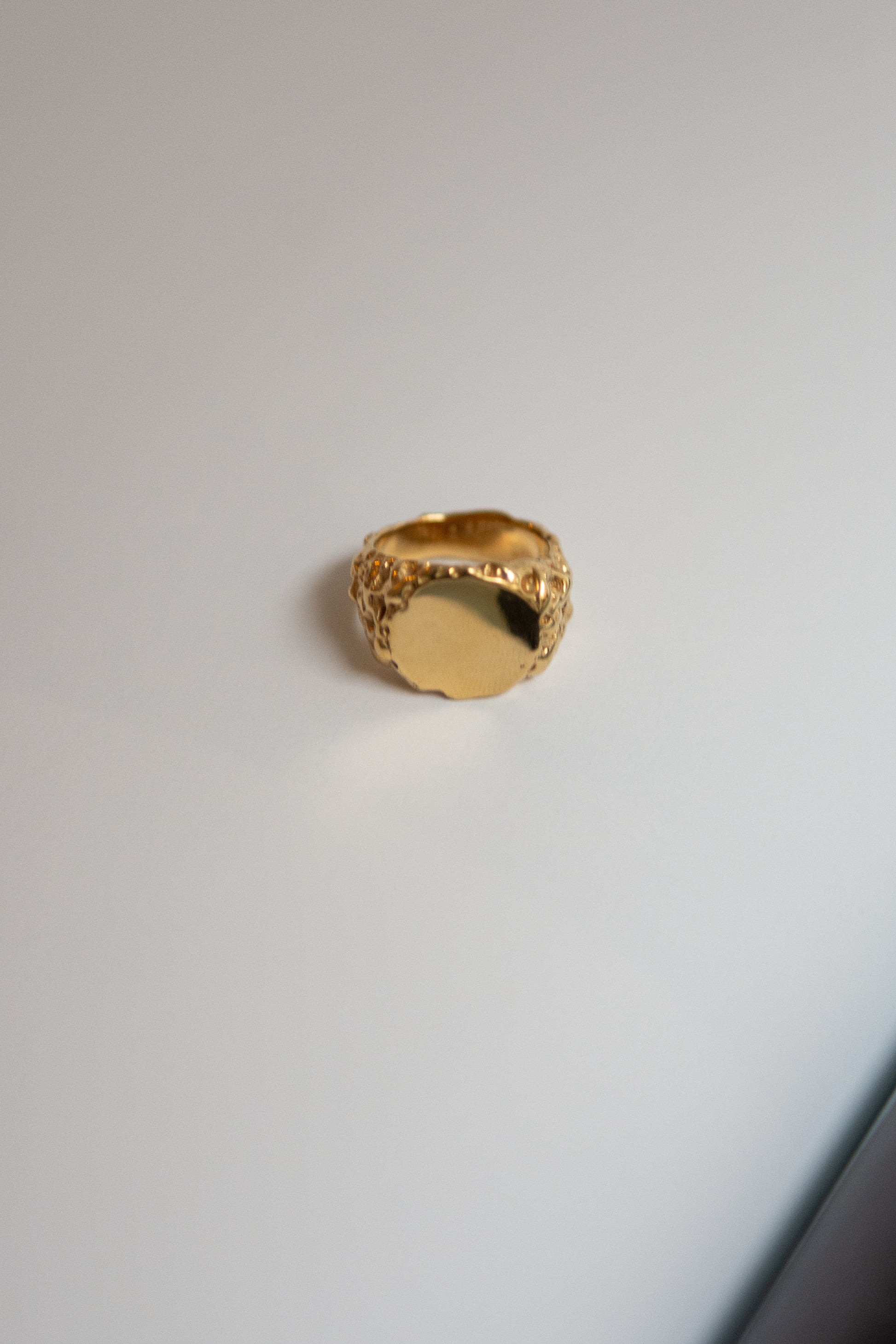 14K gold-plated signet ring with 15mm high-polished face. Texture band. 'FARIS' logo inside.