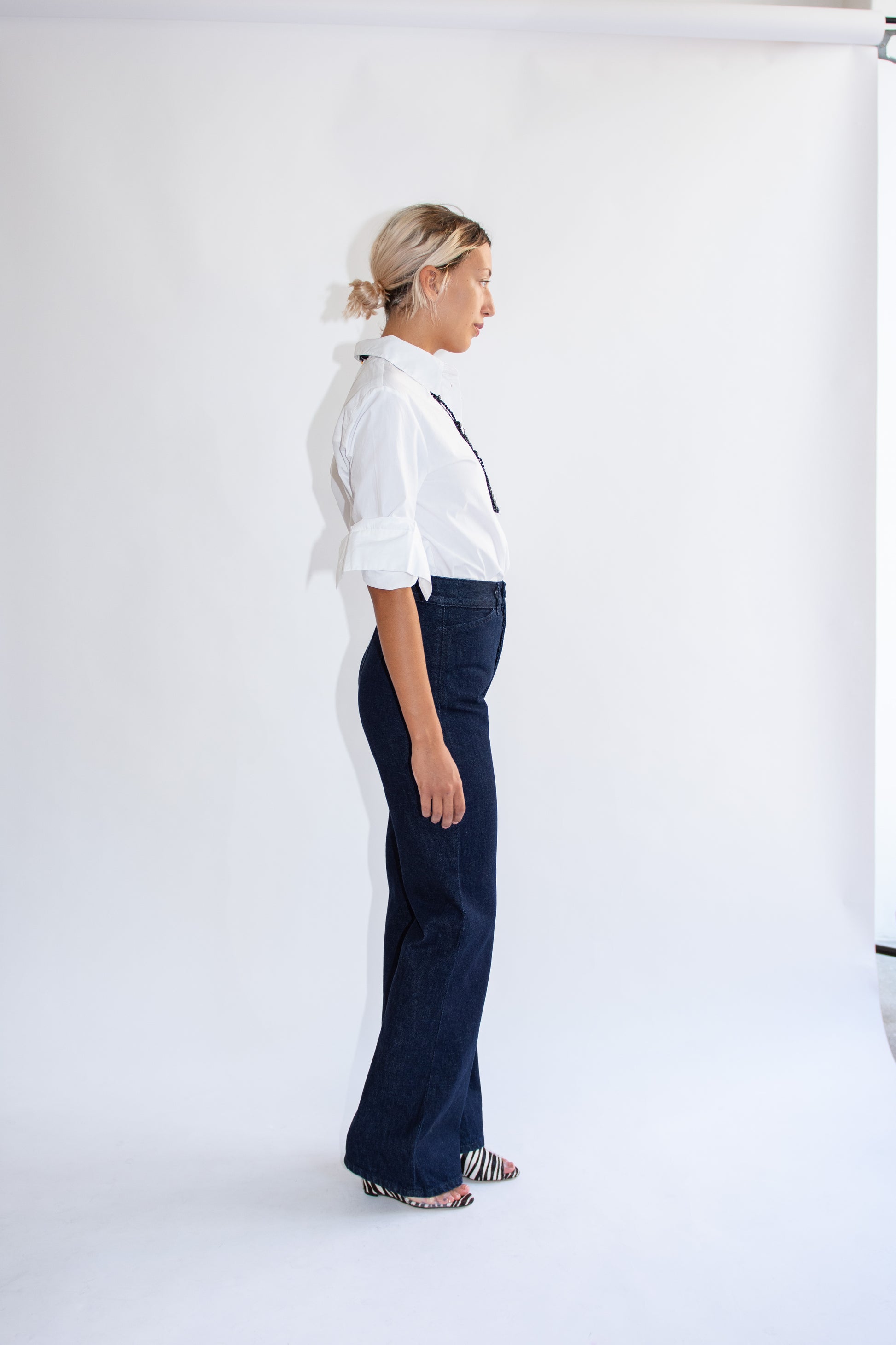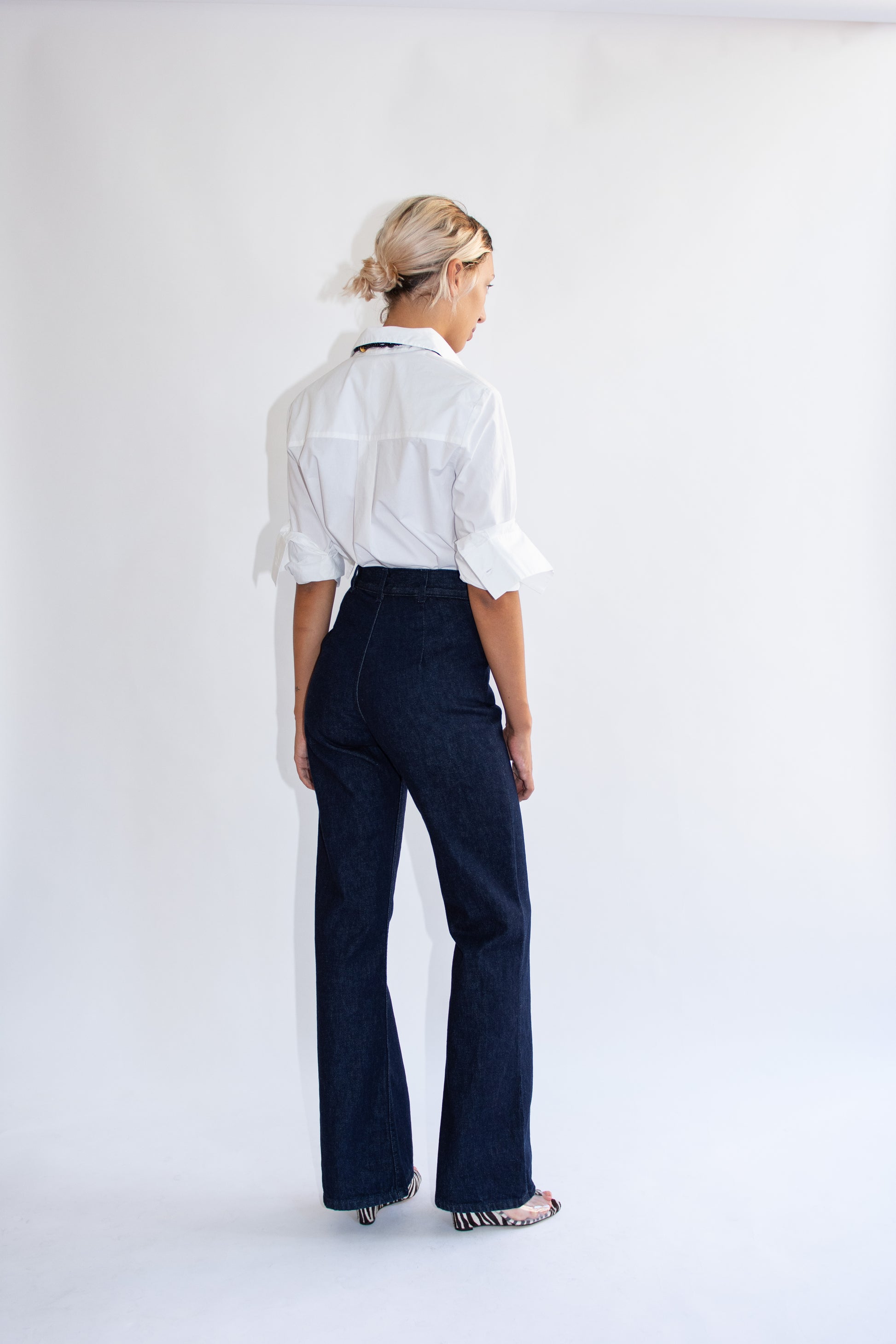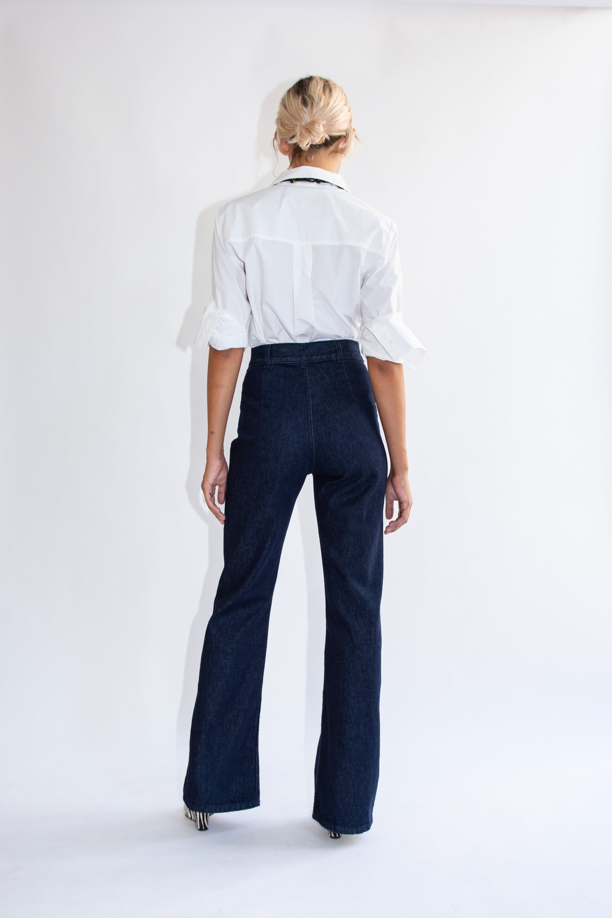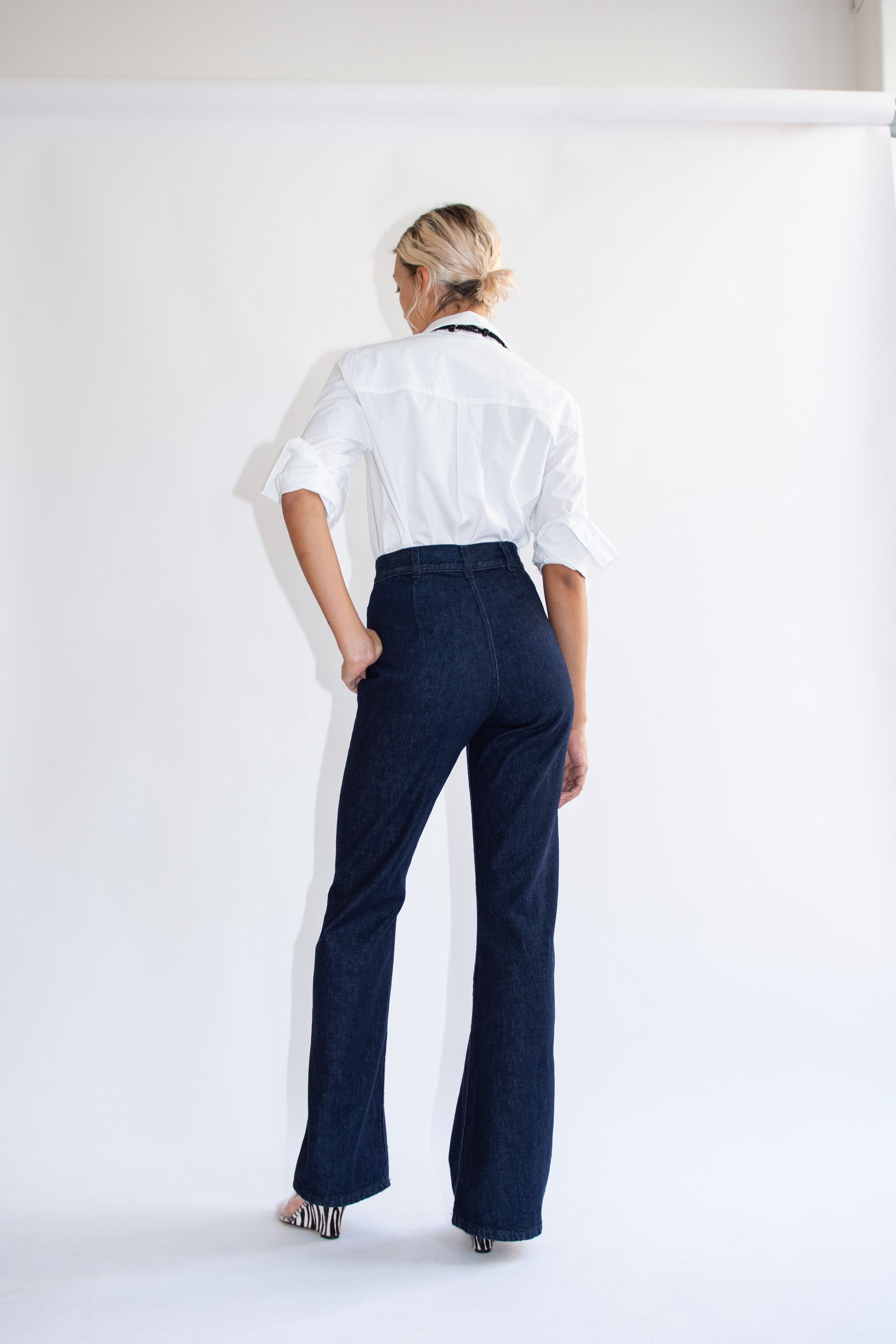 High waisted slim leg pant with long flared leg. Four pocket construction with stitched side seams, front pockets and a button front fly closure. Beltloops at waistband. Fitted long in the length.