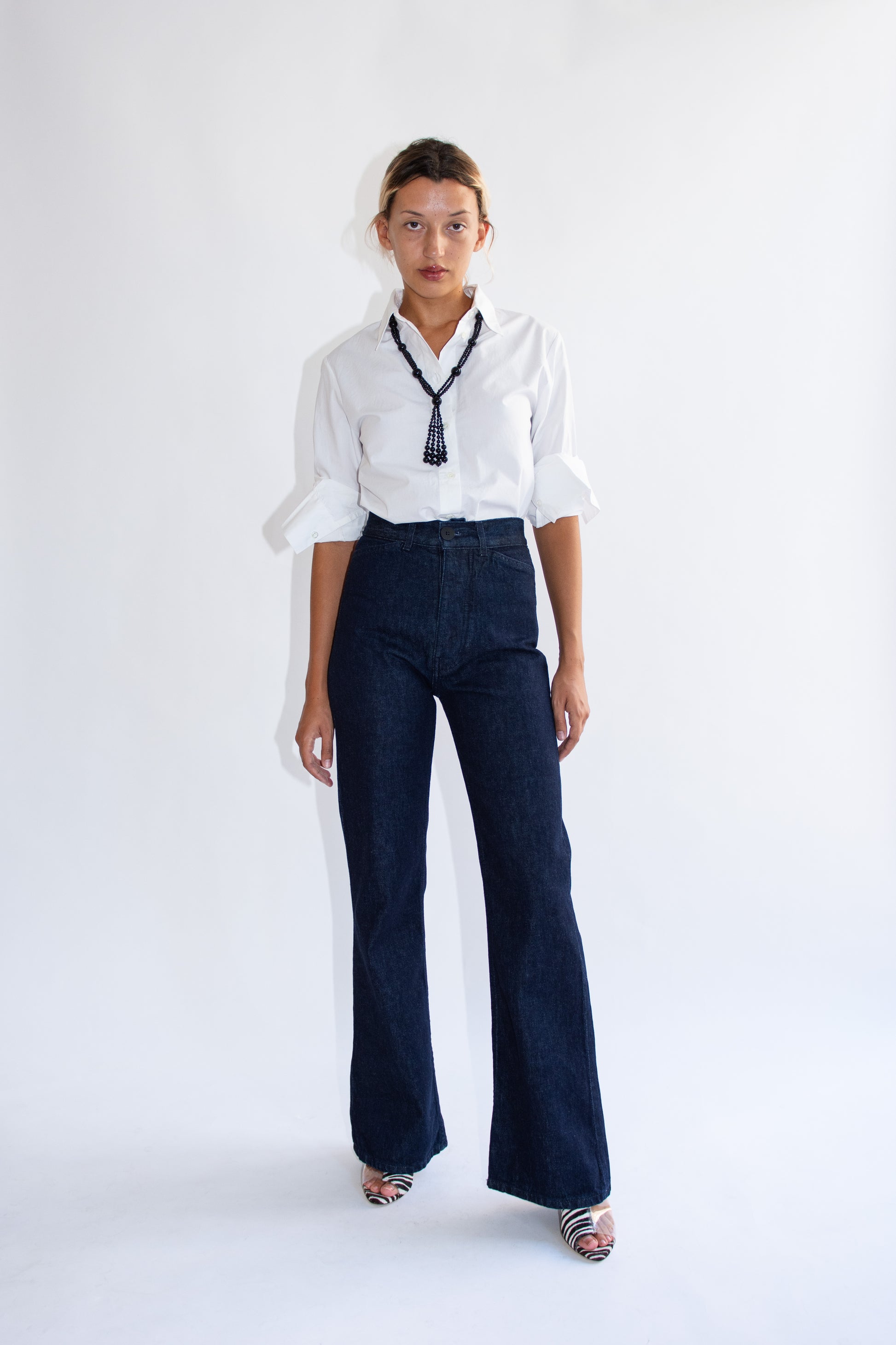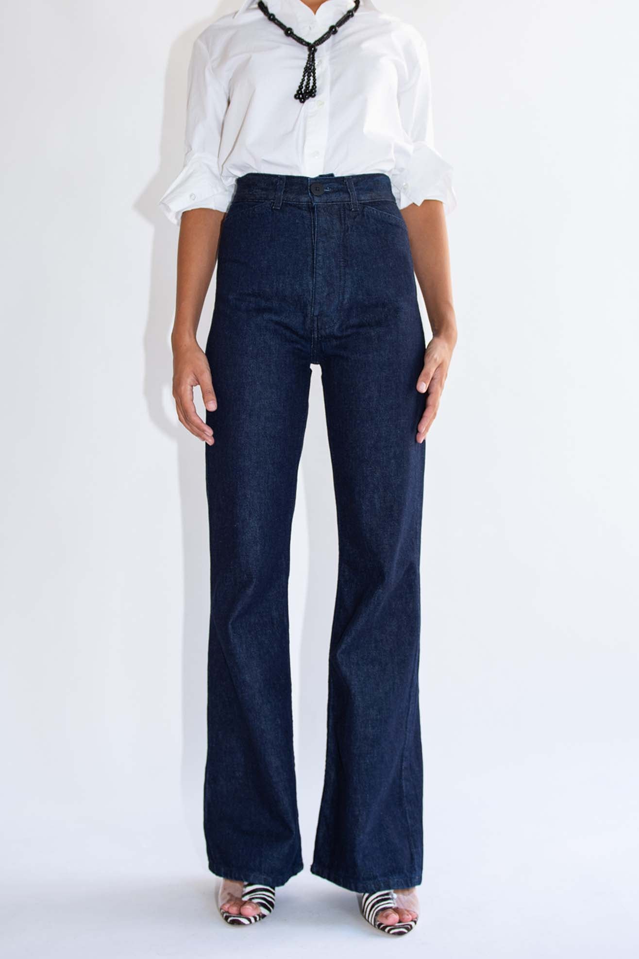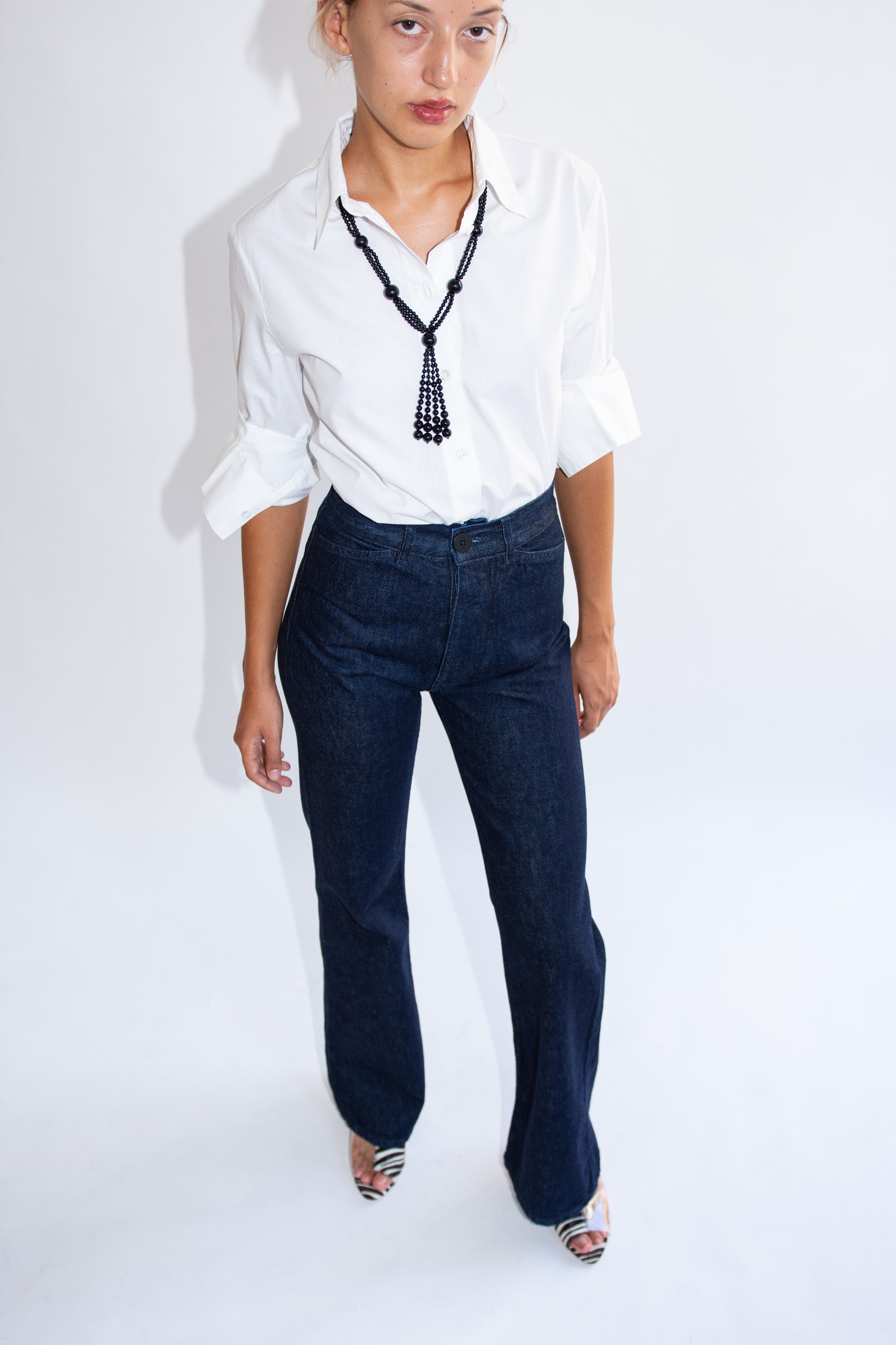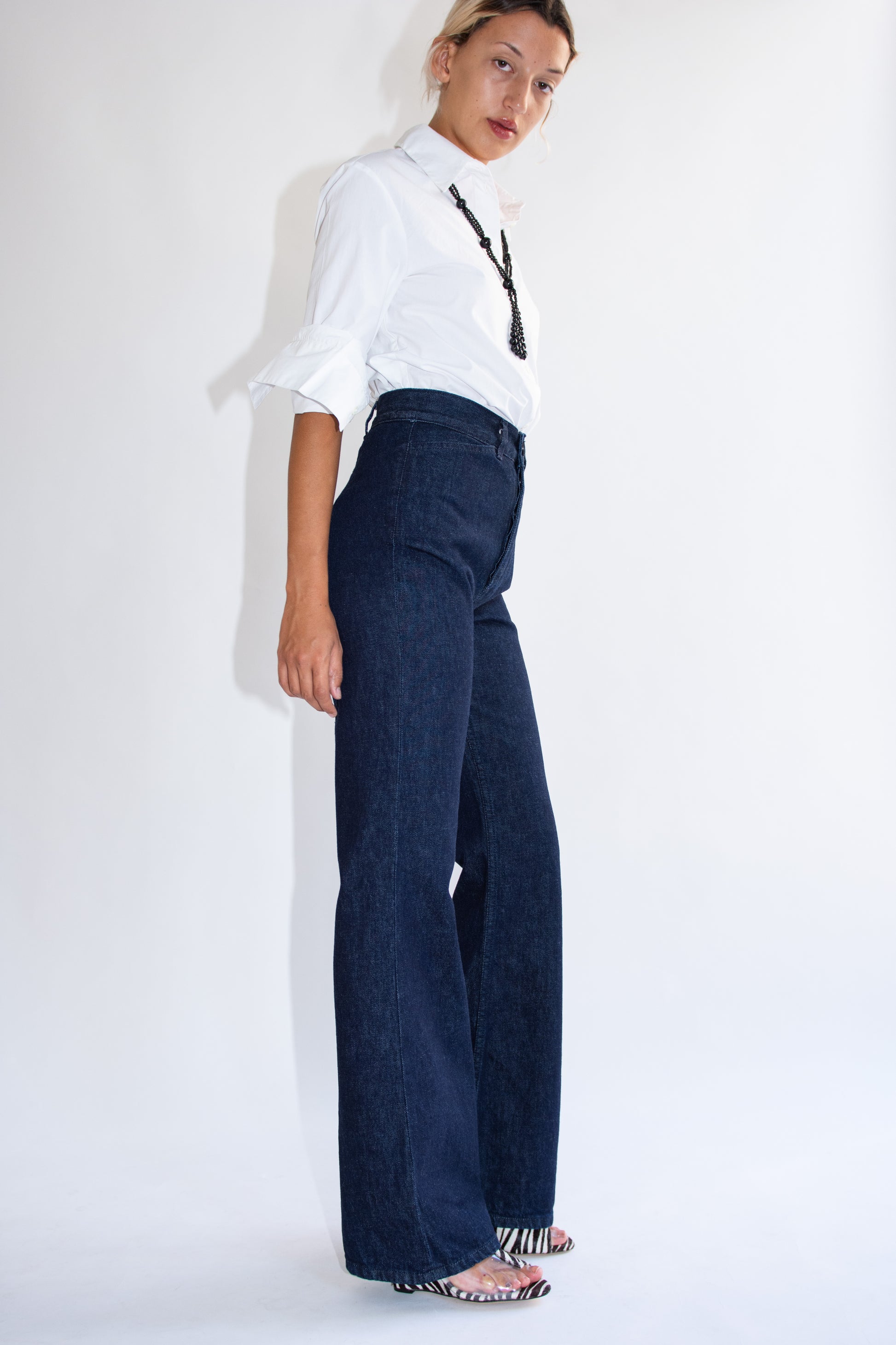 High waisted slim leg pant with long flared leg. Four pocket construction with stitched side seams, front pockets and a button front fly closure. Beltloops at waistband. Fitted long in the length.