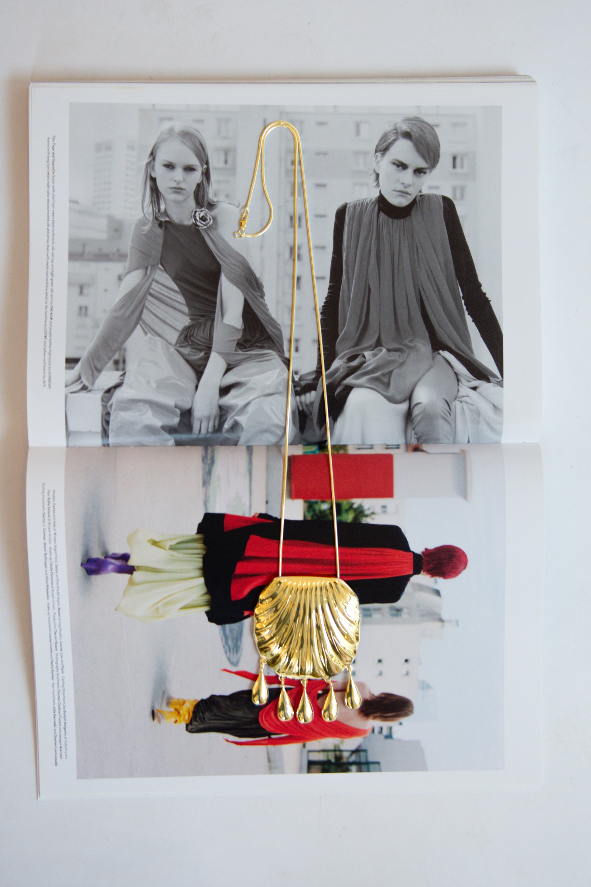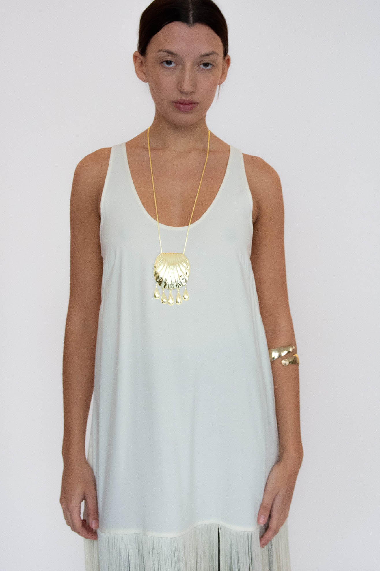 Handcrafted shell pendant necklace made from gold plated brass. Sculpted shell form with high-polish surface and dimensional ridges. Five teardrop charms attached at the base for fluid movement. Open loops on the back of the pendant to accommodate different chain styles. Includes matching chain designed for both front and reverse styling.