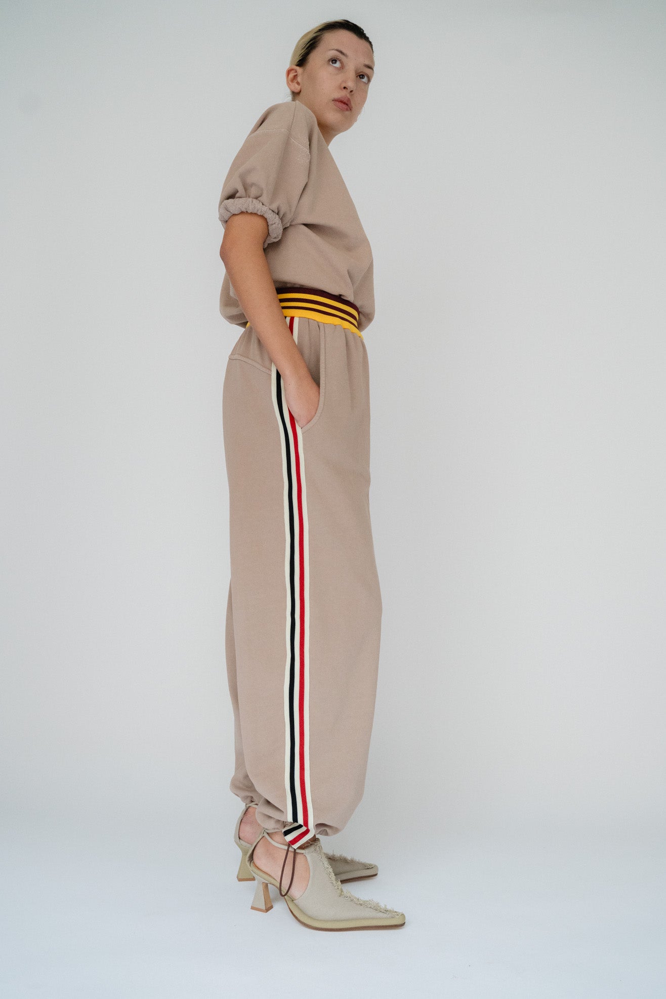 Ledisi pants in buff color. Relaxed fitted pants made in soft, overdyed fleece terry. Striped elastic waistband and side stripe detailing. Side slip pockets. Drawstring cuffs at the ankles.