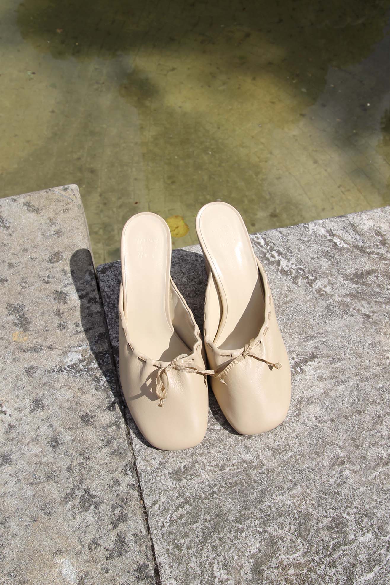 Ballet-inspired wedge in a beige nappa leather. Made in soft beige leather with threaded ribbon detail. Round toe.