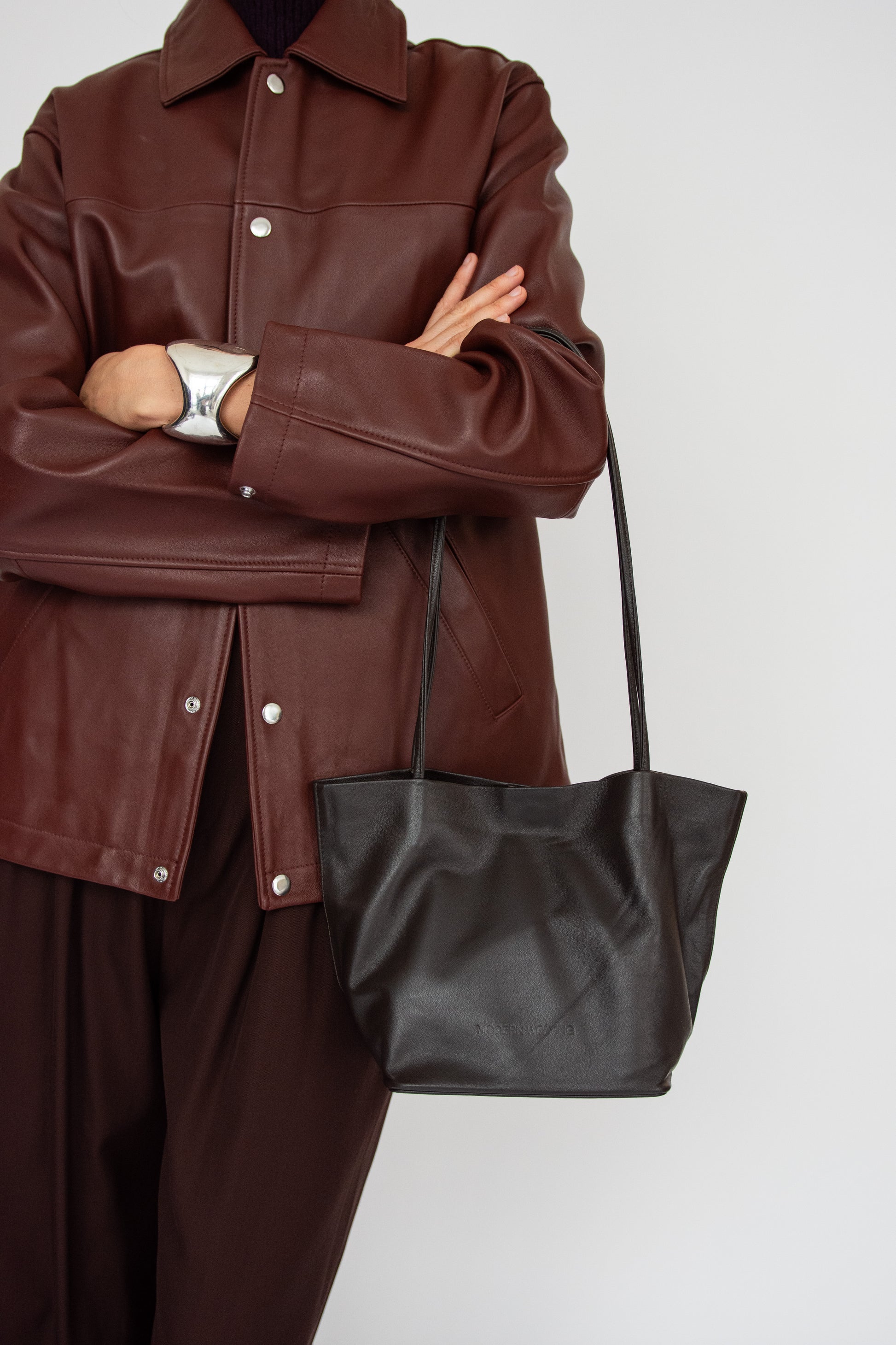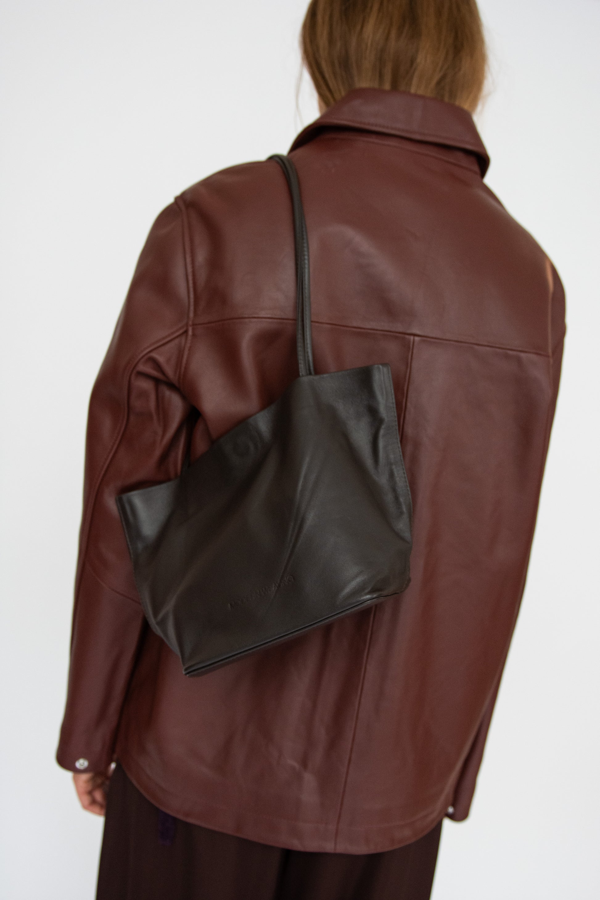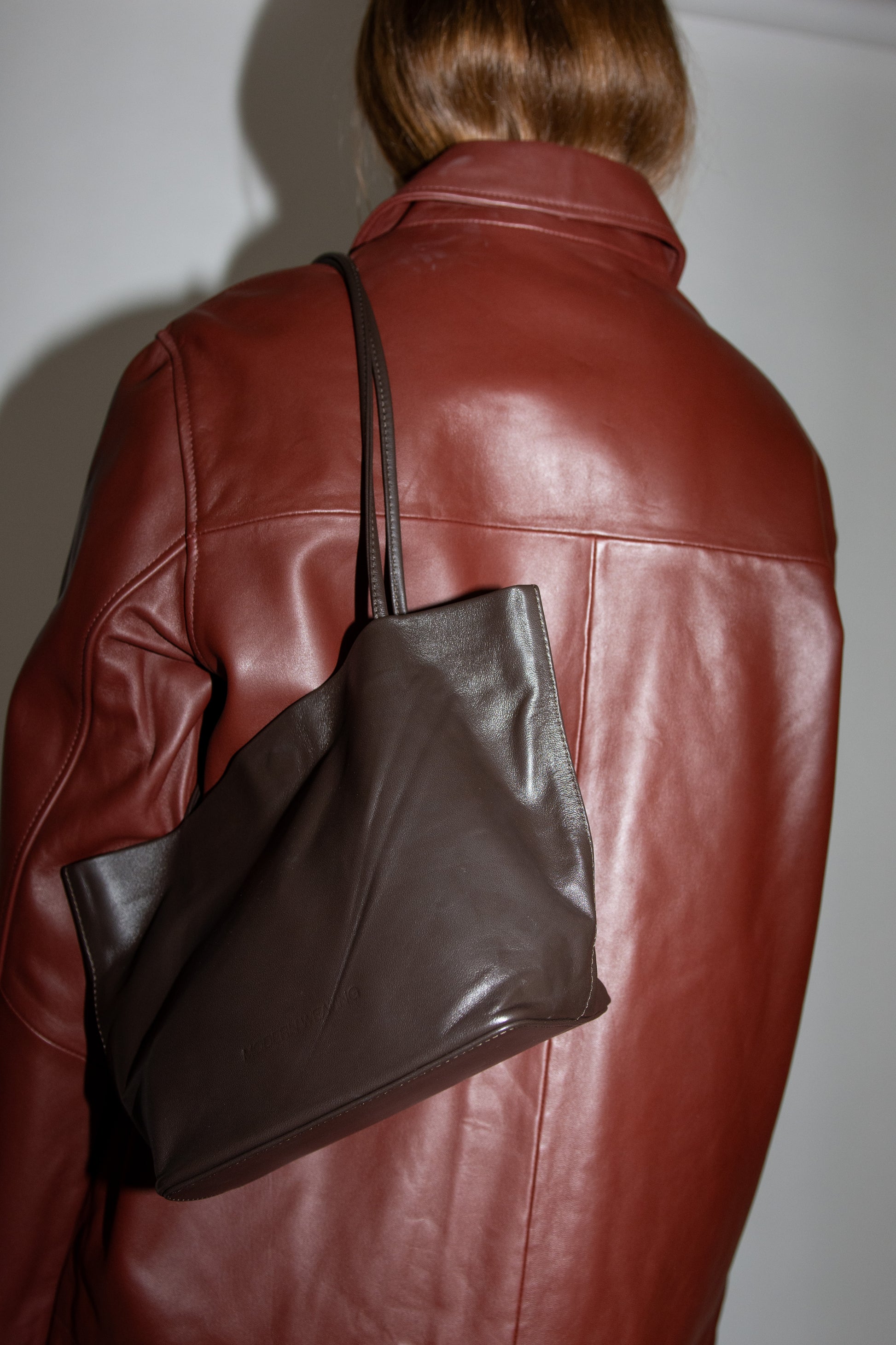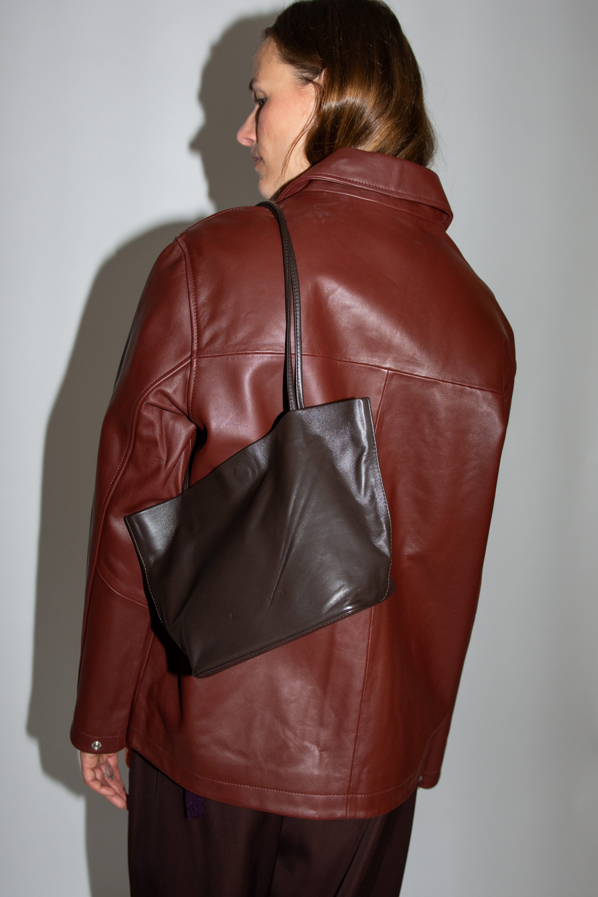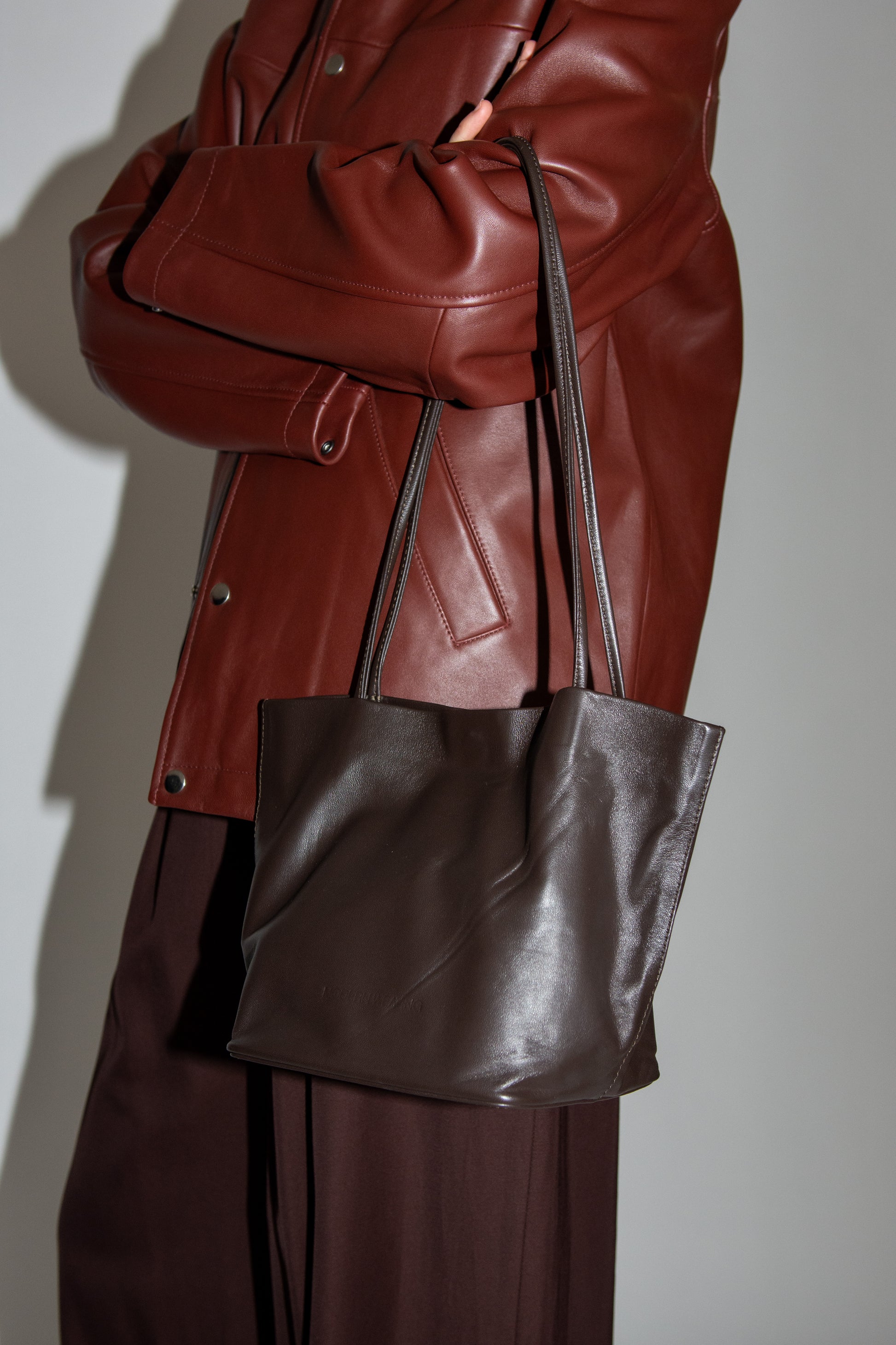 Small tote bag in dark Brown leather. Unlined. Slim straps.