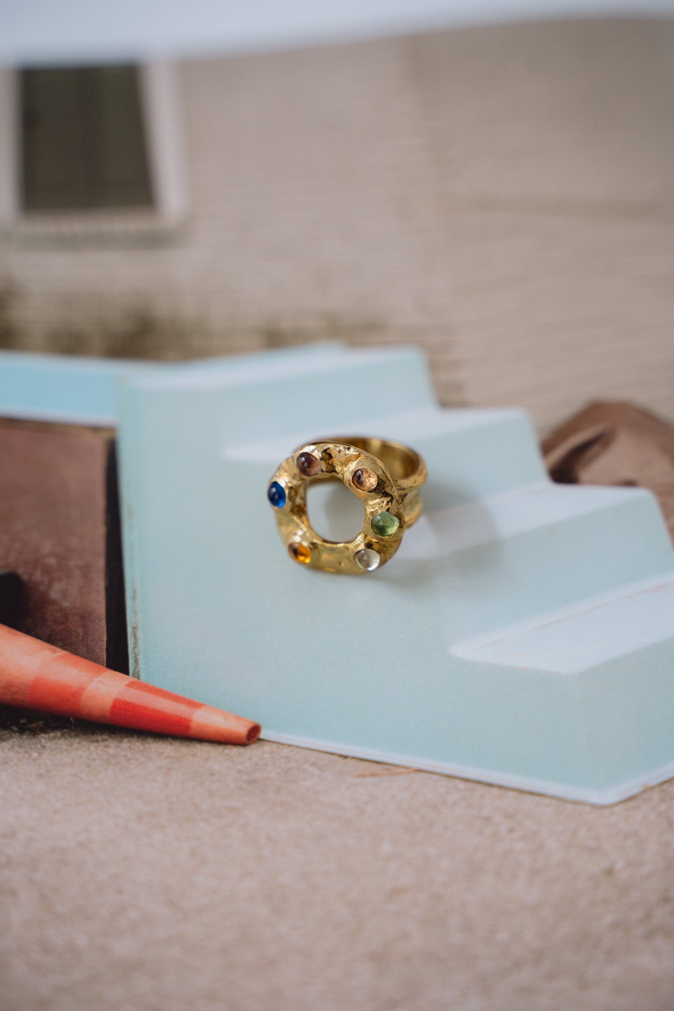Chunky six-stoned finger ring, made in hammered gold-toned brass. Diffrent colored cabochons glass stones at circular face. Engraved MONDO MONDO logo at inner band.