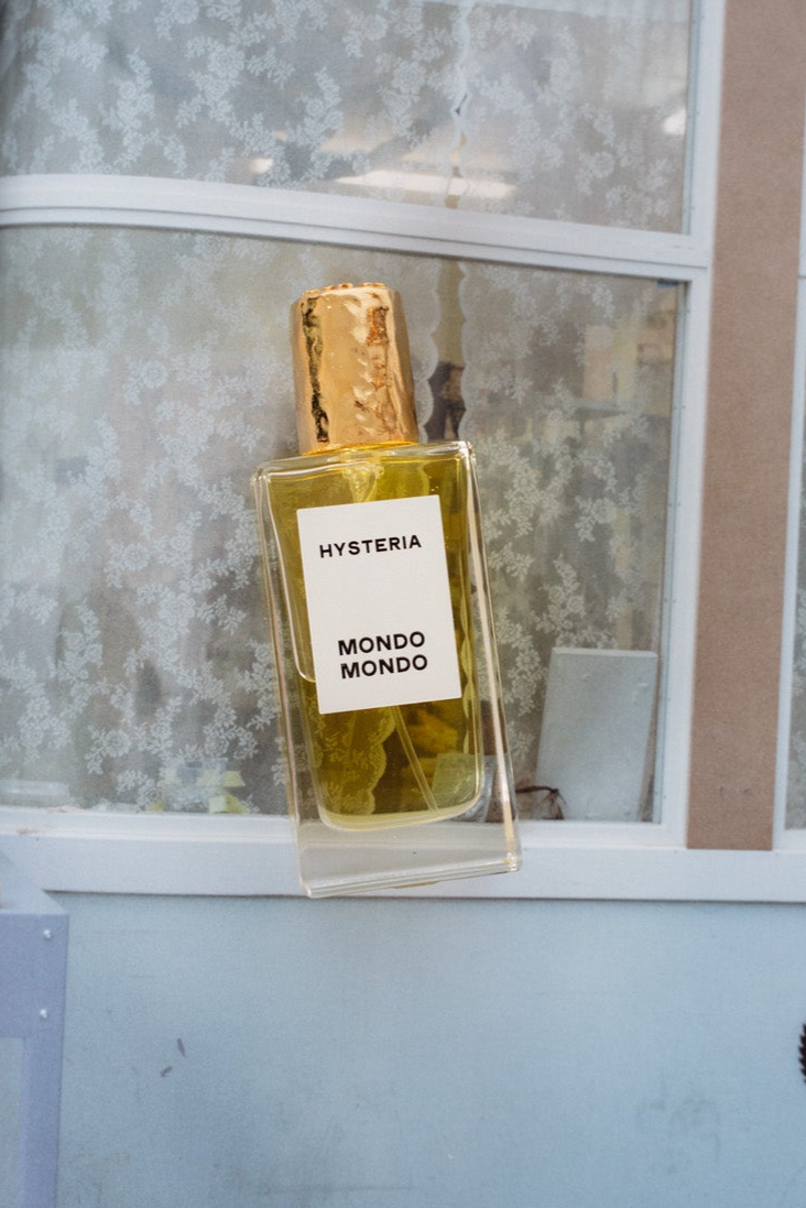A fragrance from Los Angeles-based Mondo Mondo bearing a signature hand-casted metal cap plated in 18-karat gold. Notes of Indian tuberose, Indian jasmine, palo santo, coconut, sunscreen & musk. 50 ML.