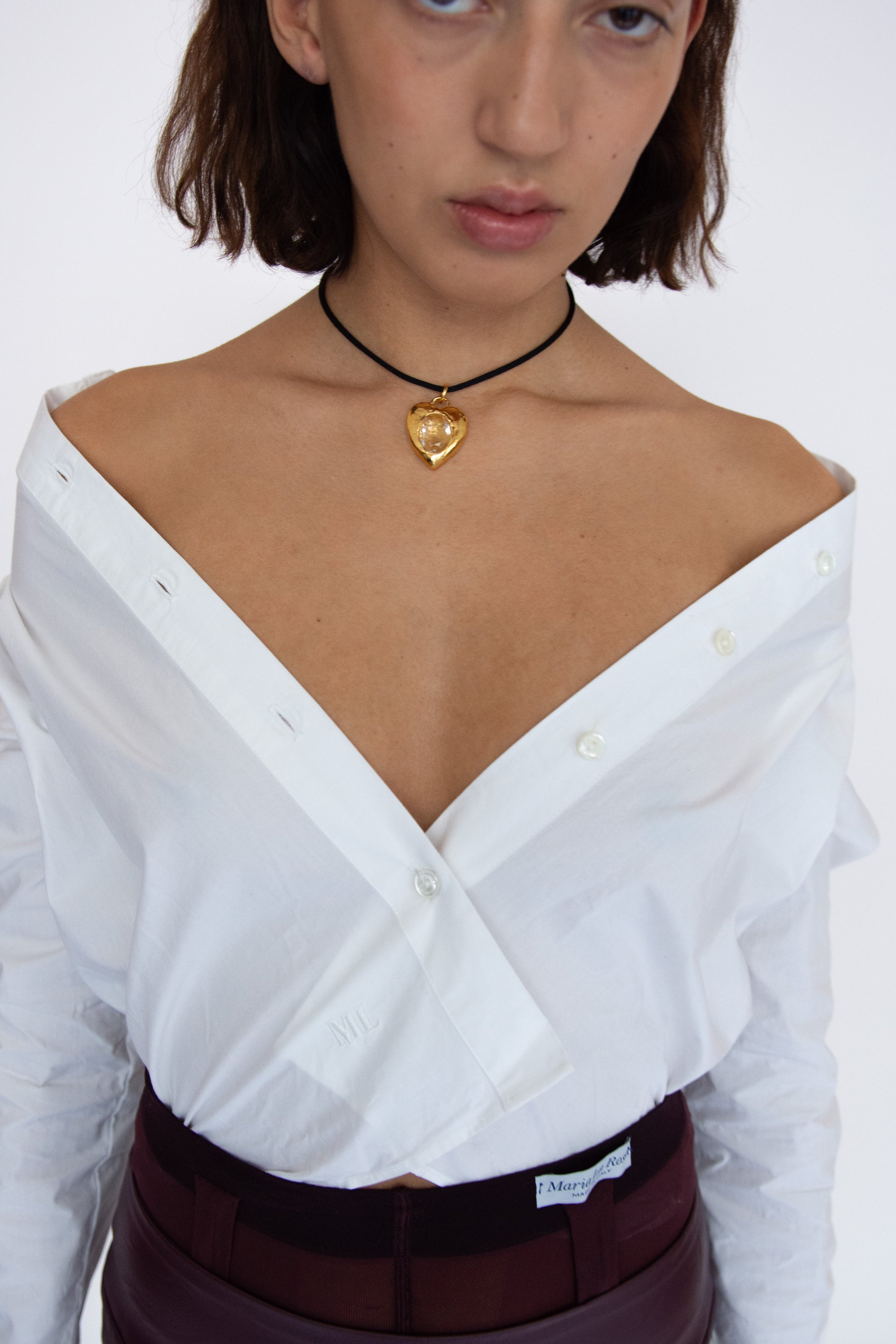 18k gold plated heart necklace set with clear glass stone on black satin cotton cord. Ties at back. Can both be worn as a necklace and belt.
