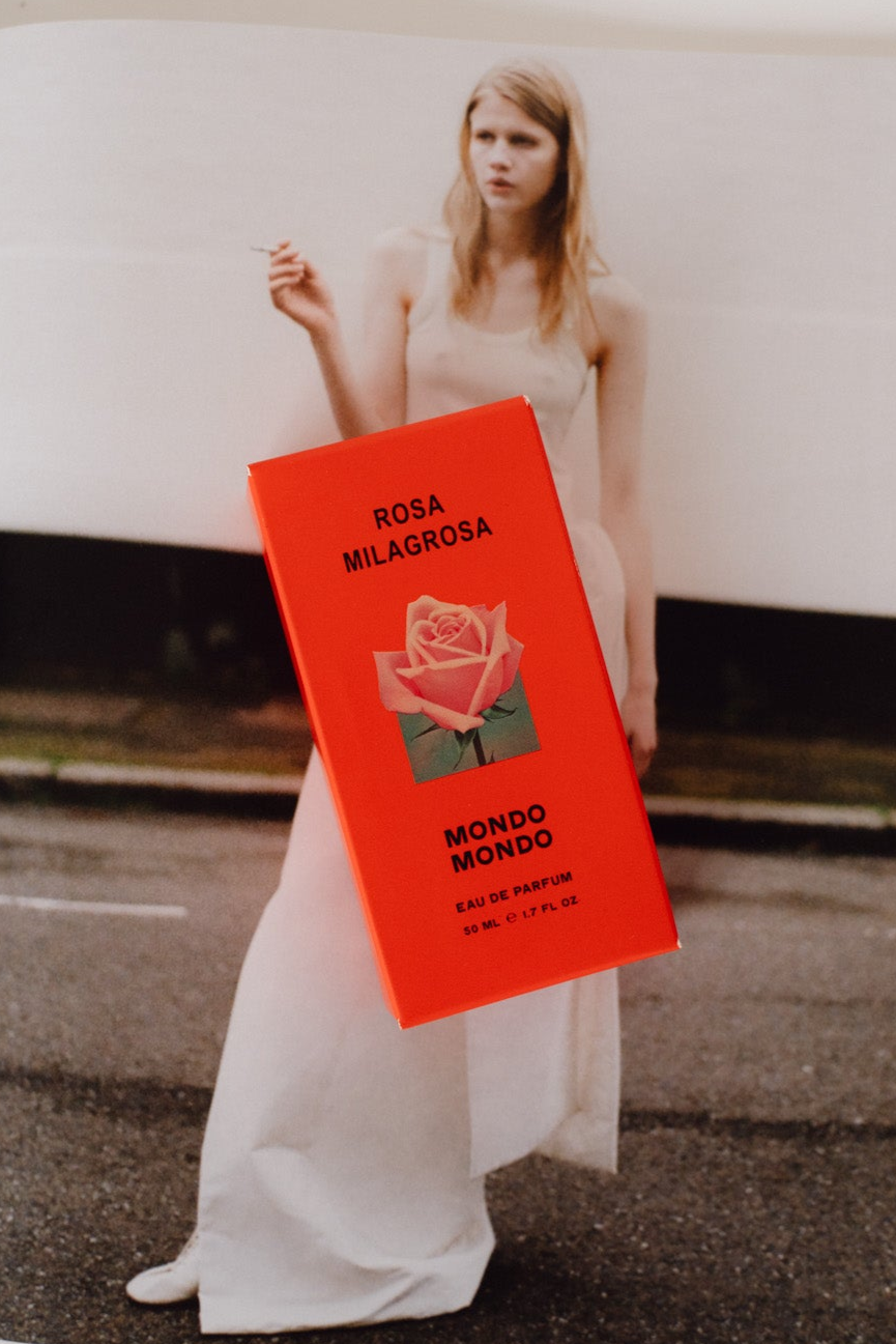 A fragrance from Los Angeles-based Mondo Mondo bearing a signature hand-casted metal cap plated in 18-karat gold. Notes of Red roses & Soap. 50 ML.
