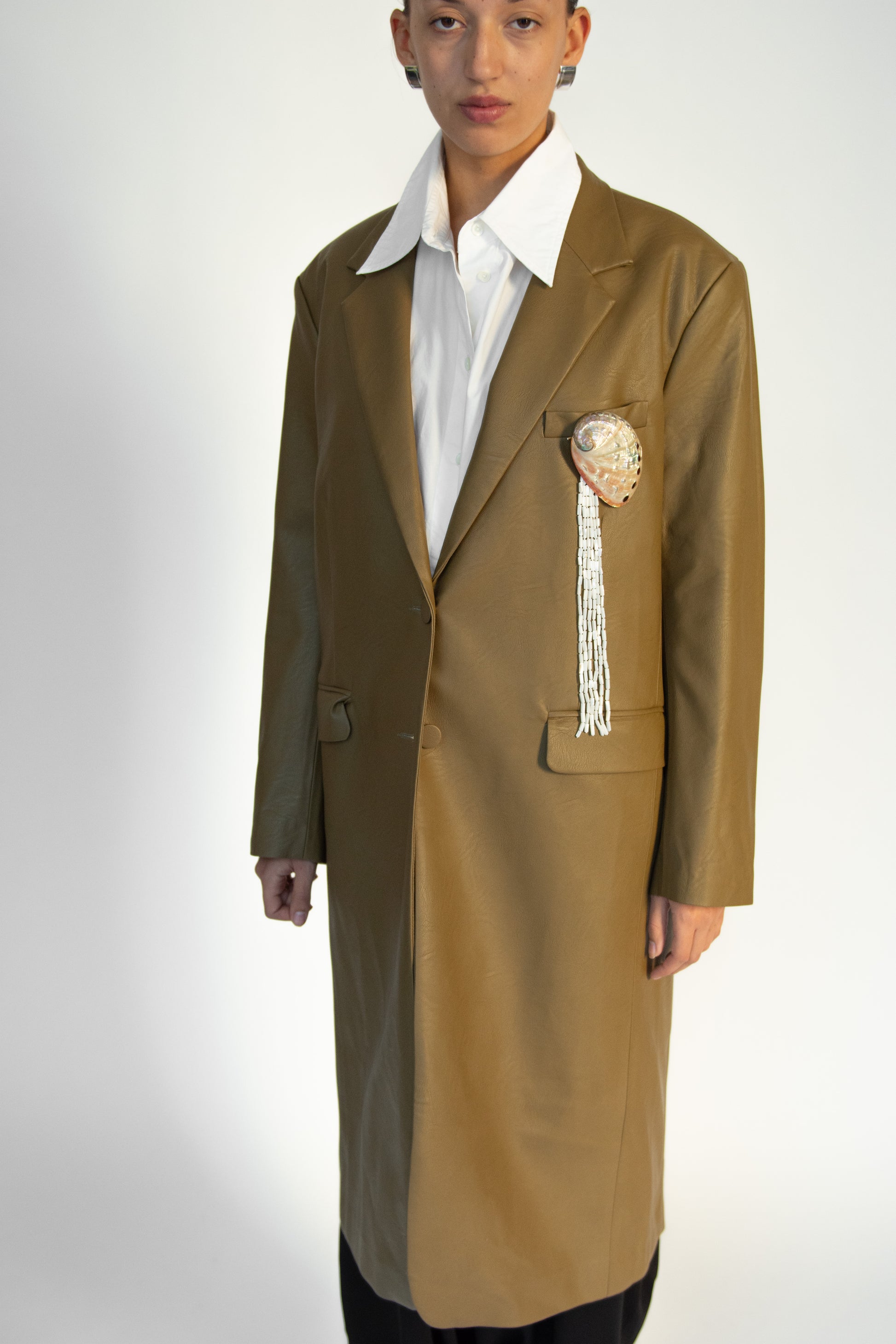 Abelone shell brooch with hand beaded fringe made of mother of pearl seed beads. Gold plated brooch latch pin back with locking clutch.
