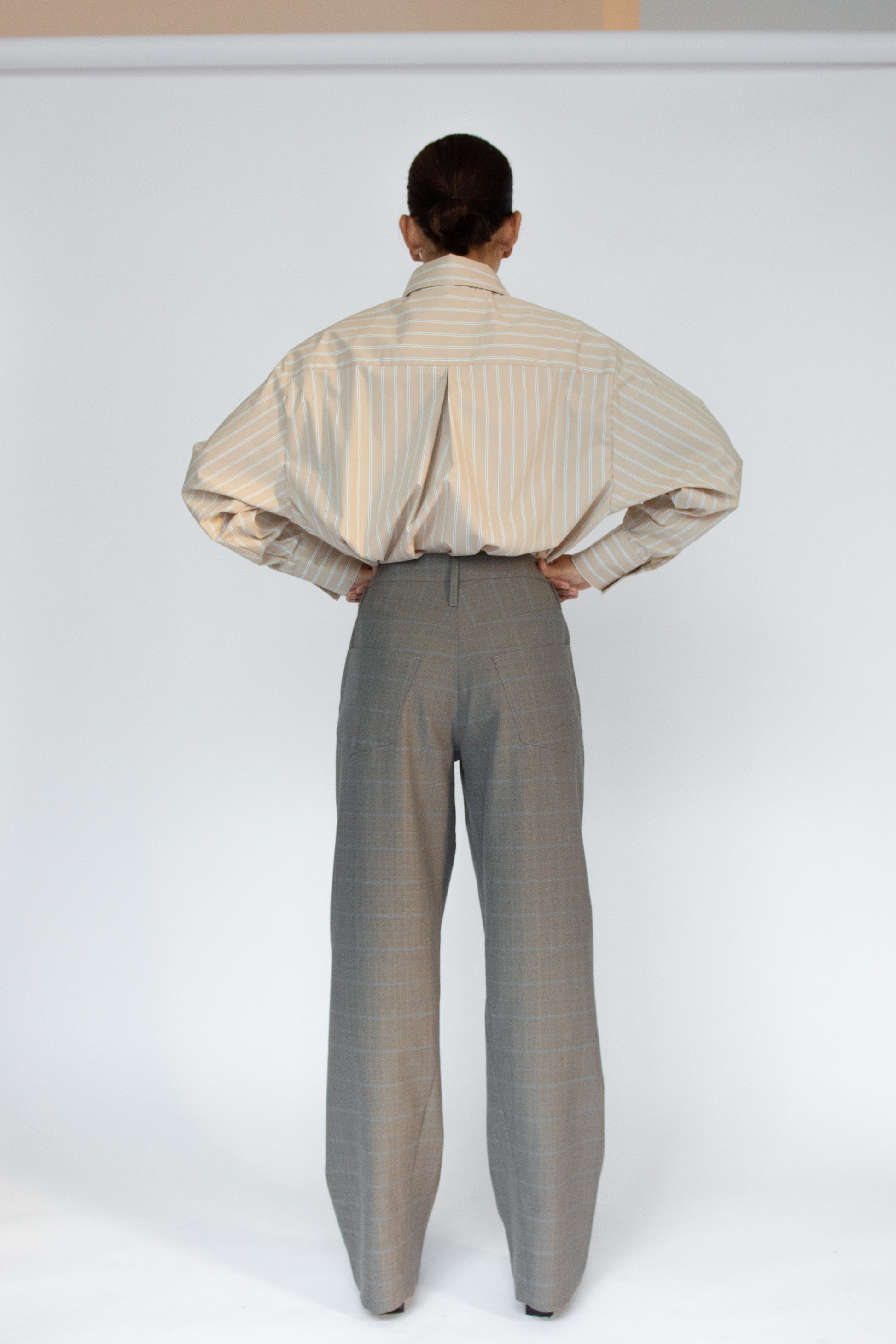 Menswear-inspired, 5-pocket relaxed pants with a twisted hem in a Poly/Wool blend plaid suiting. Front zip fly with button closure at waist. Half lining.