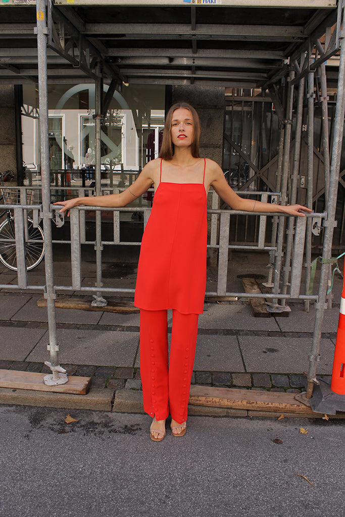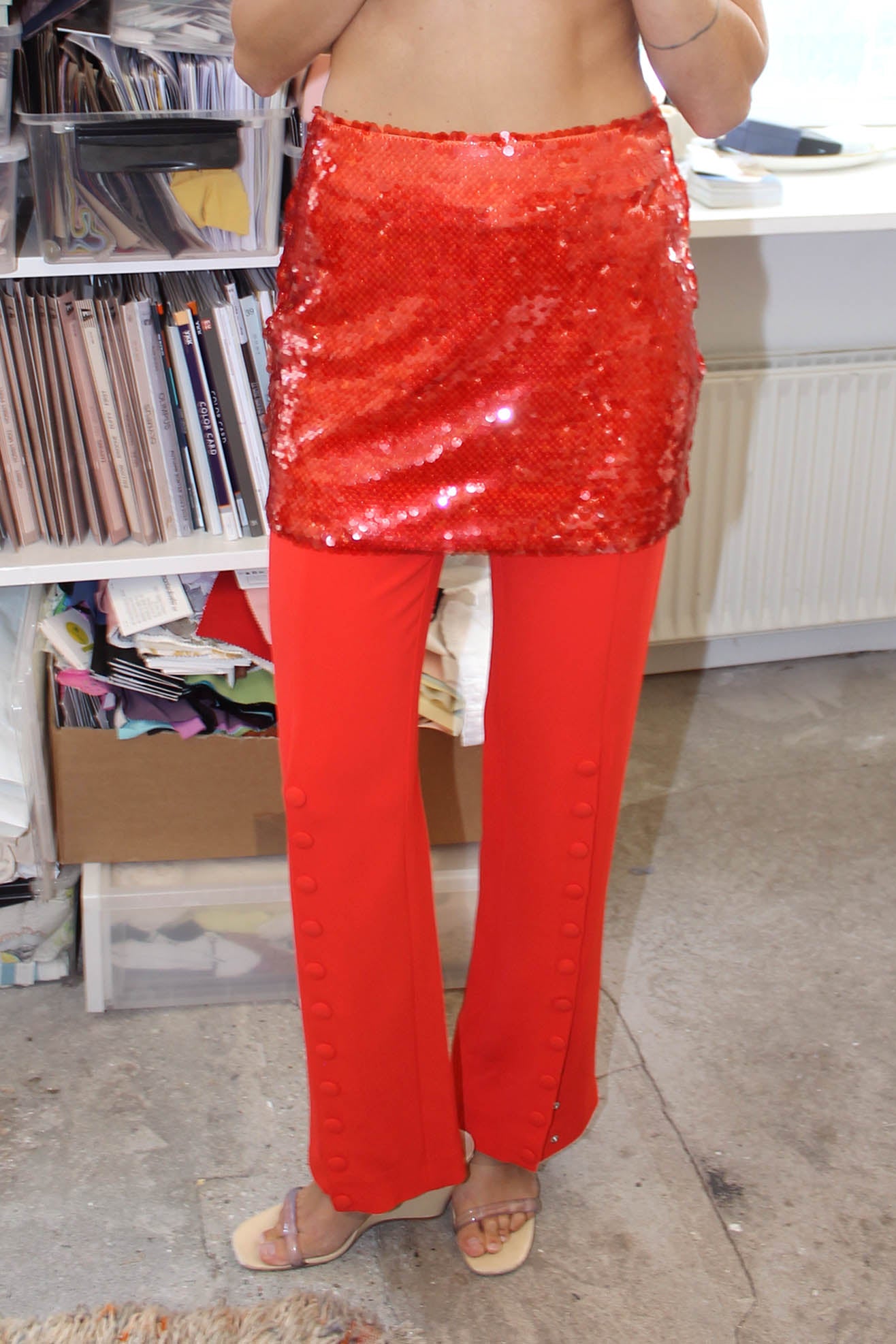 Long straight leg pants with snaps at front leg made in a lipstick red viscose stretch crepe from deadstock fabric. Functional fabric covered snaps at front from knee to hem. Fly zip closure with invisible metal clasp fastening.