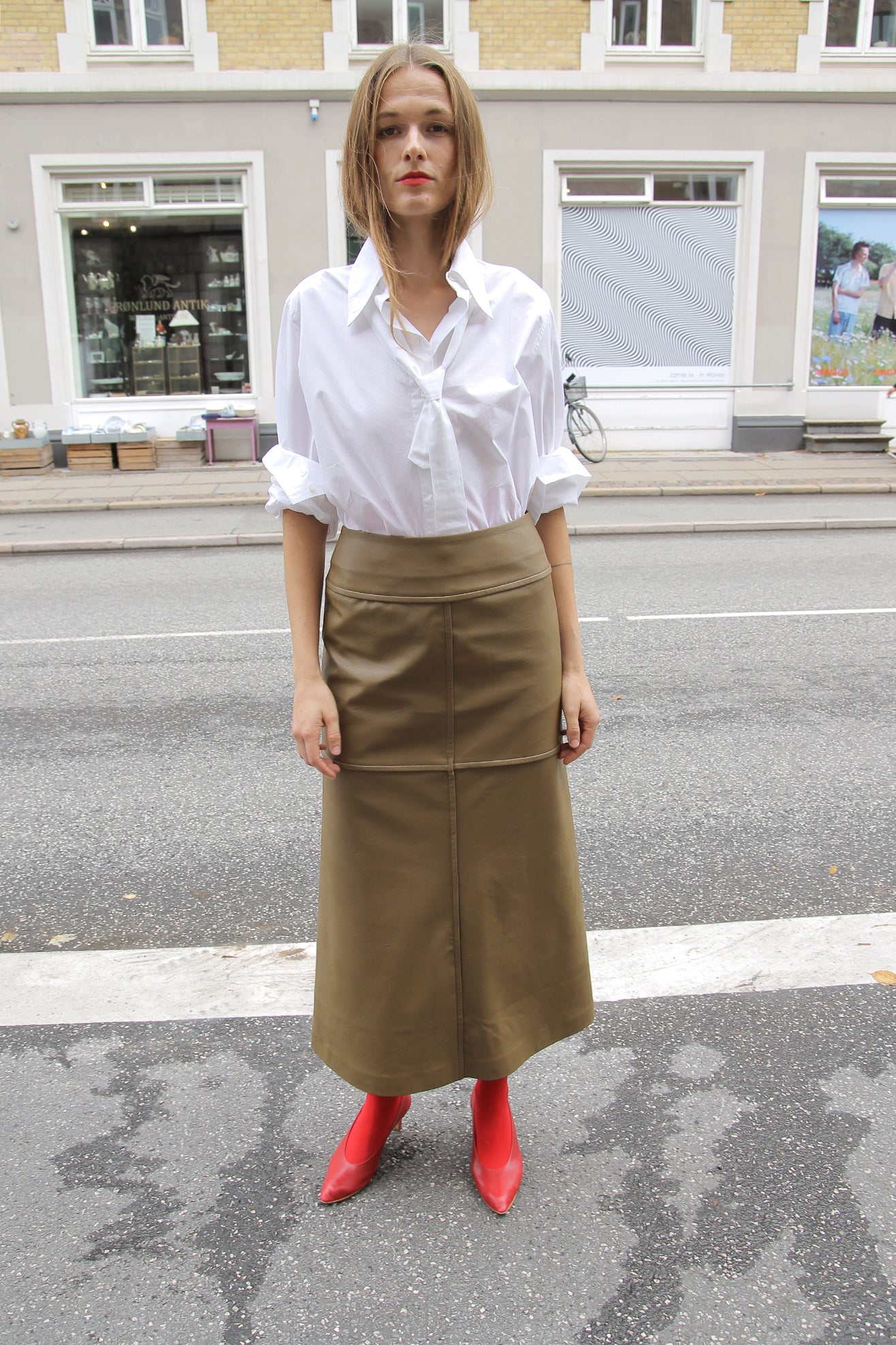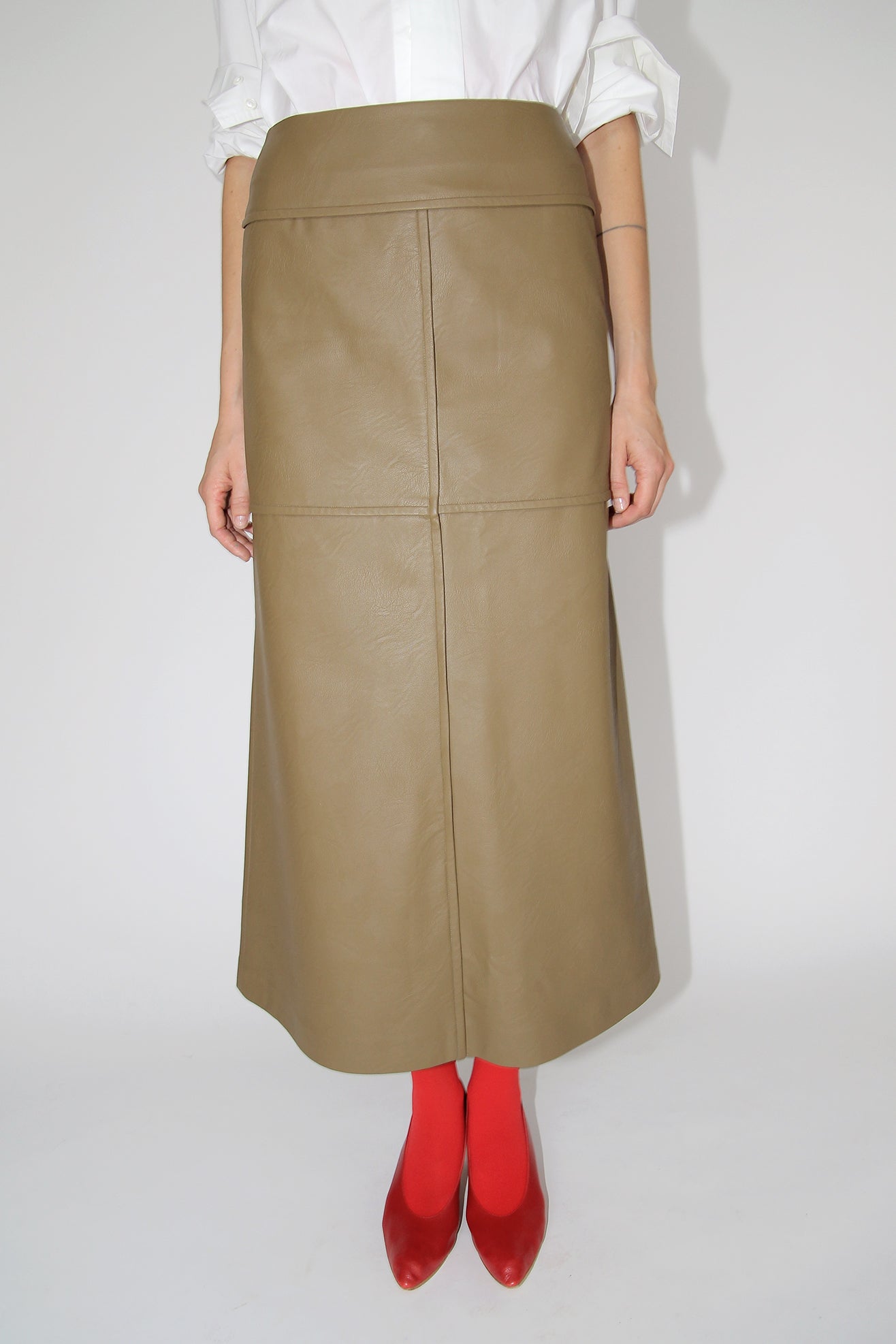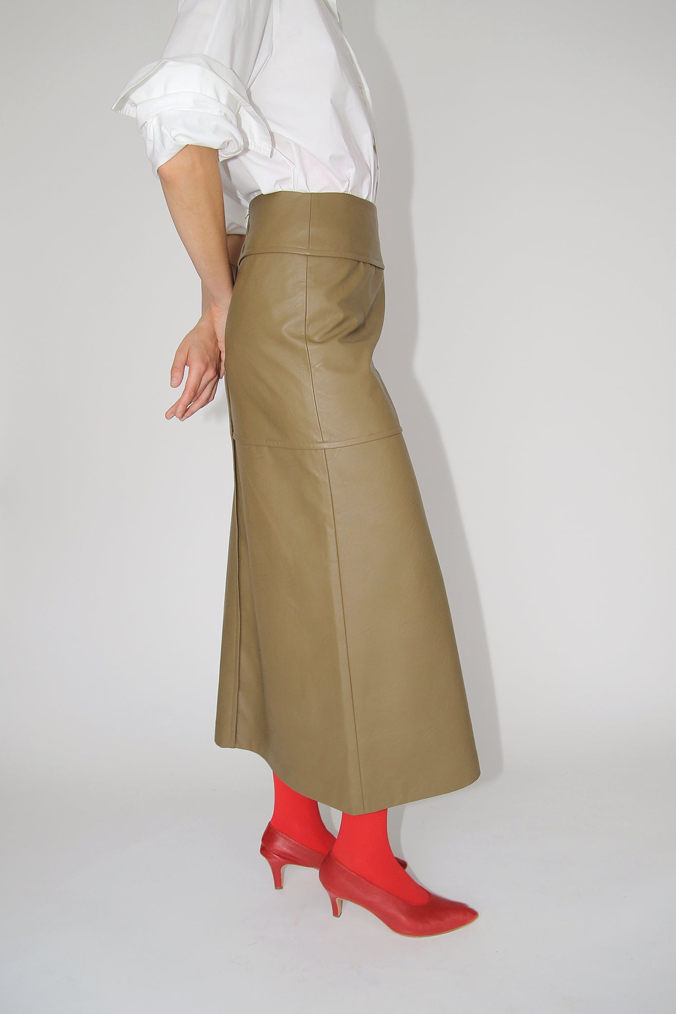 Long Olive Green straight skirt in faux leather. Slight flare at hem. Visible waistband. Fully lined. Invisible side seam zipper closure at center back.