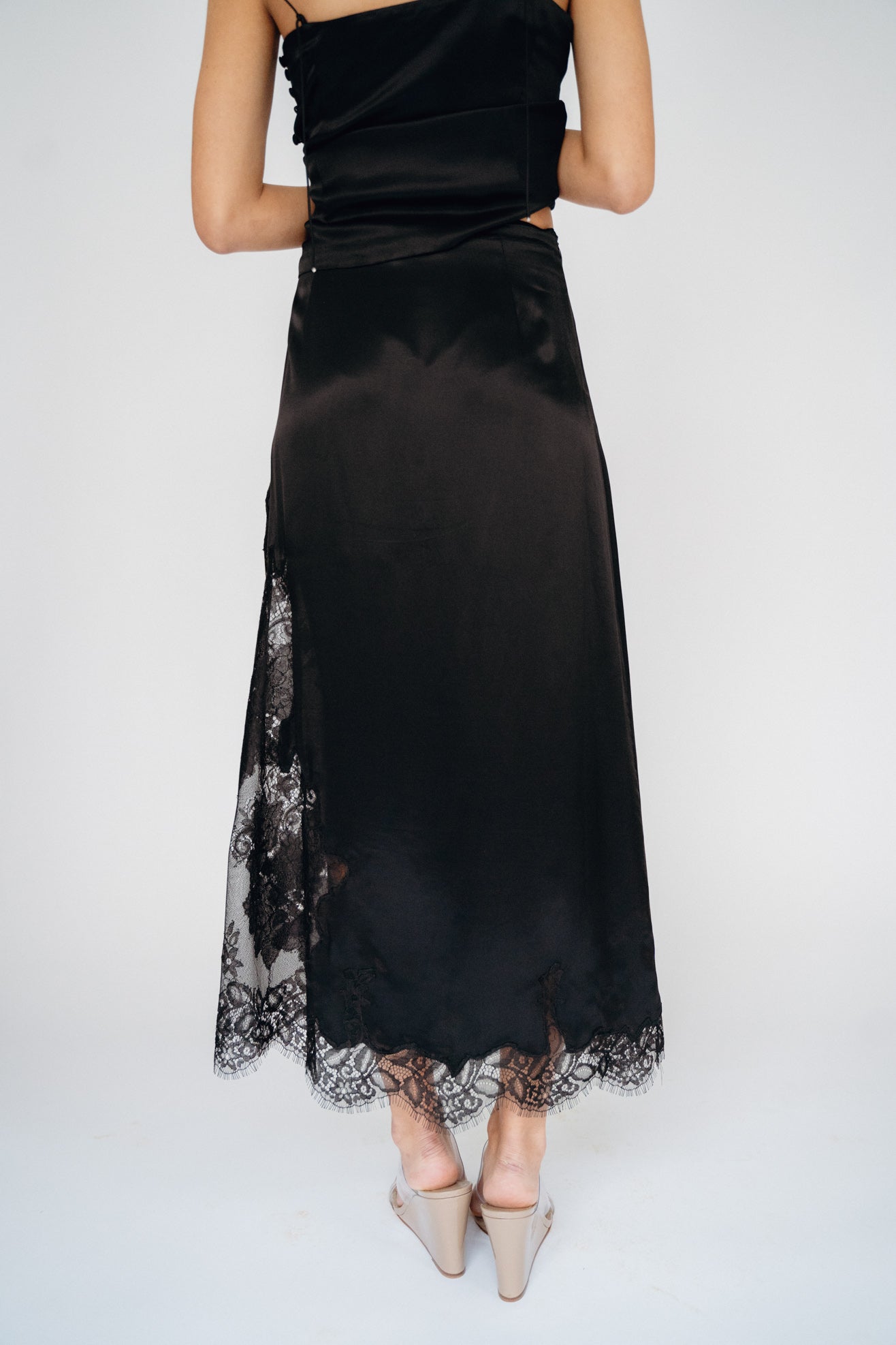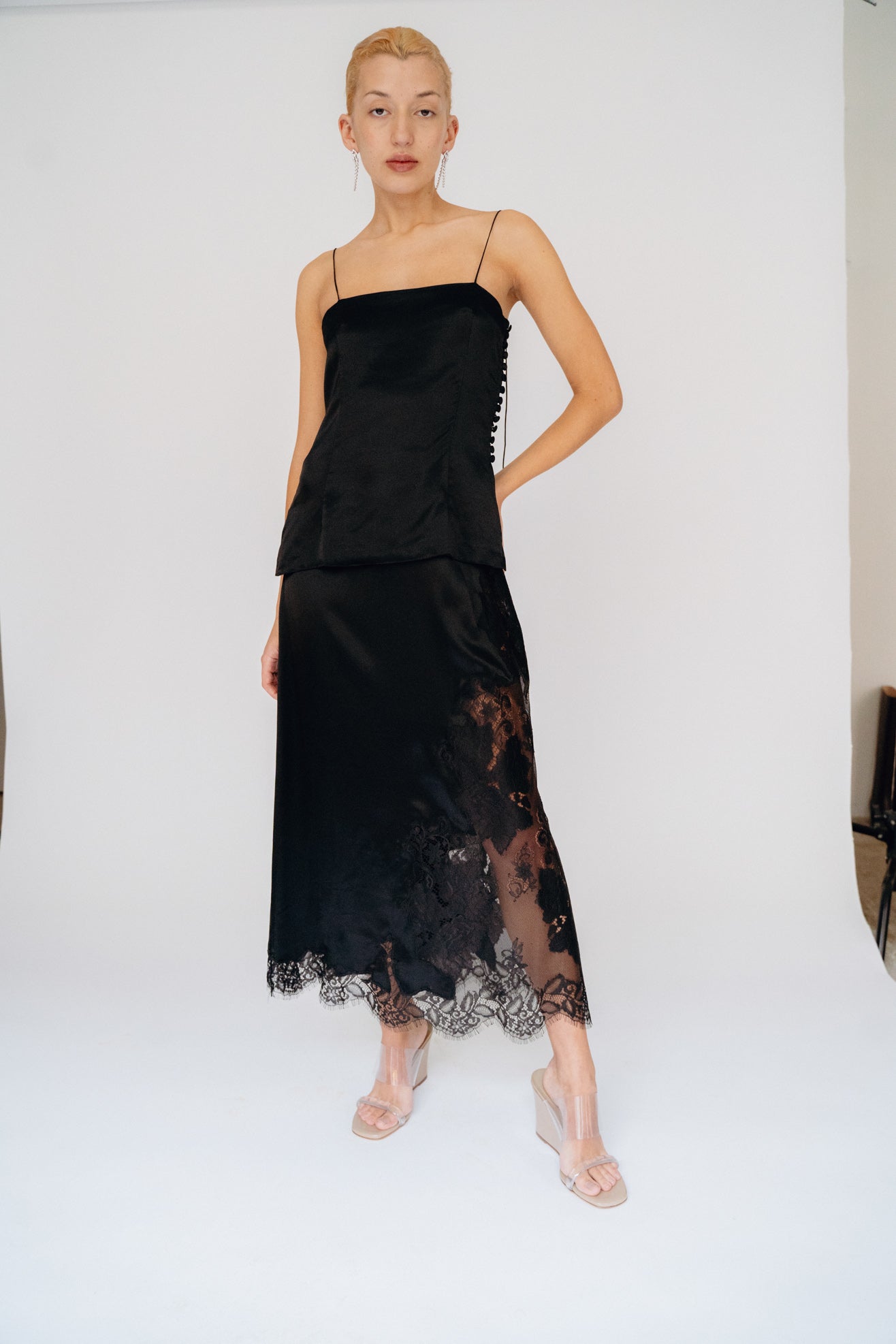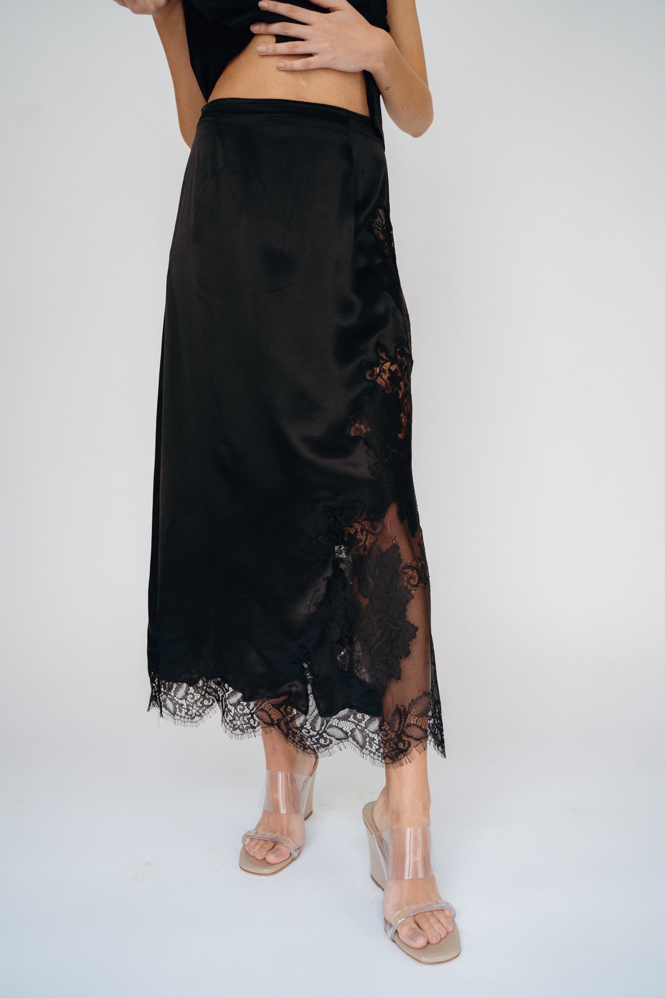 Midi length half slip-inspired skirt in black viscose satin with a high lace inset at side. Invisible zipper closure at side seam. Unlined.