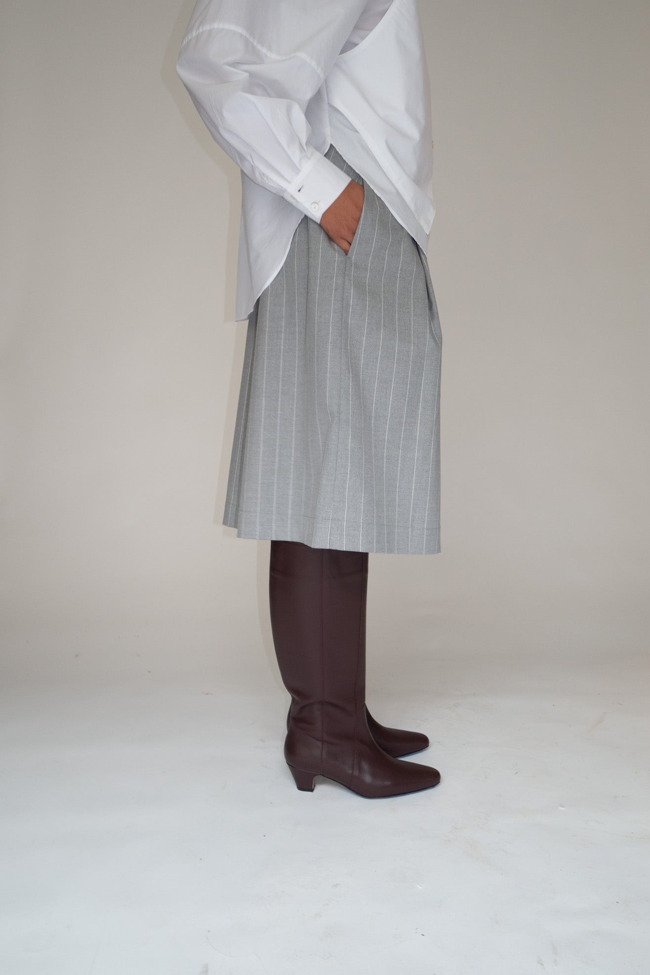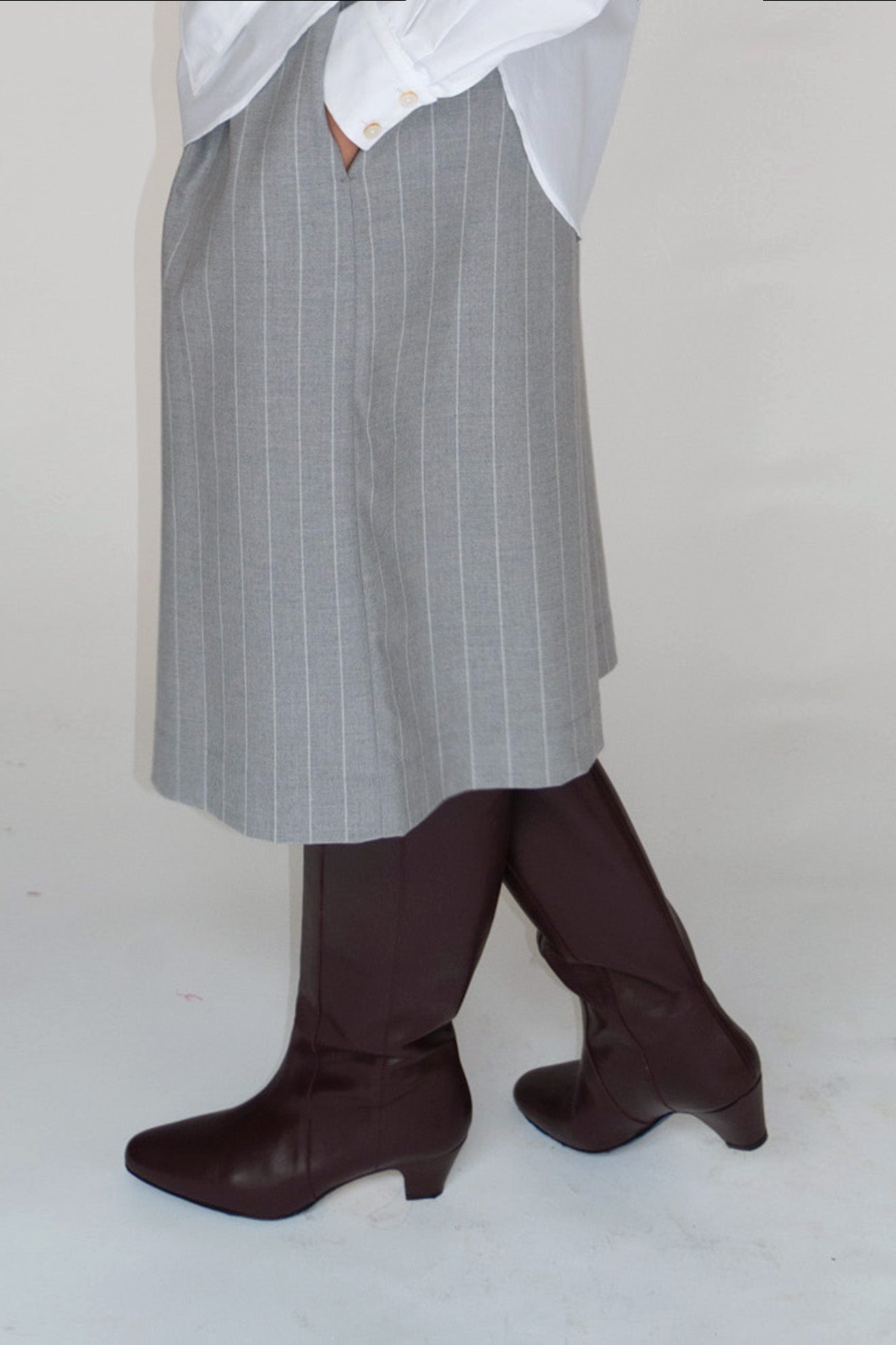 Knee high boot in Bordeaux Nappa Calf Leather. Pointy rounded toe. Pull on to be worn. Fully lined.