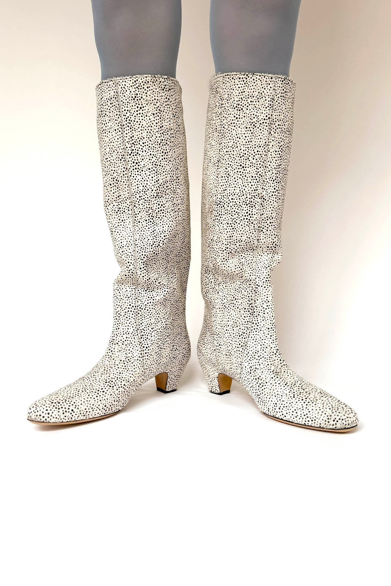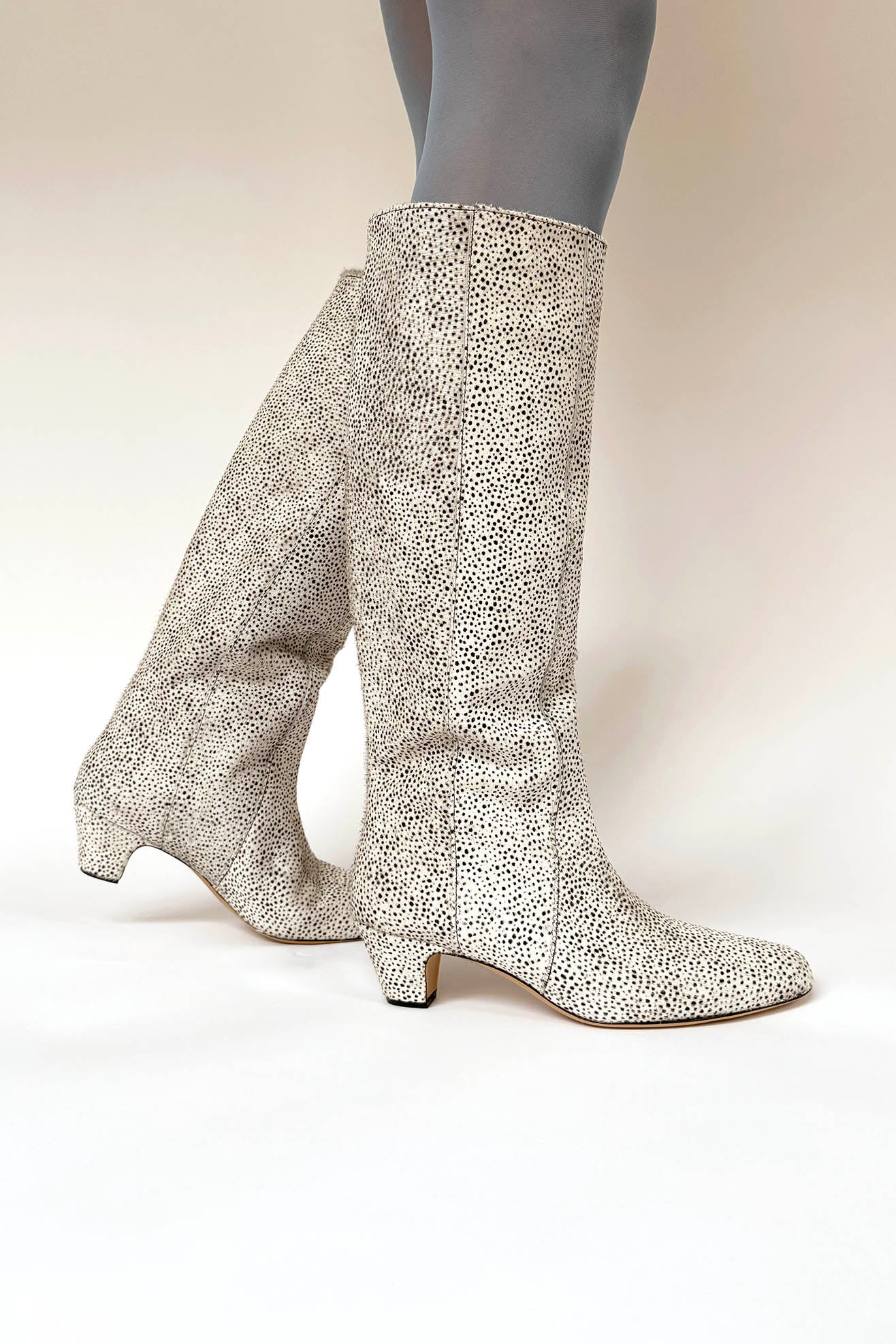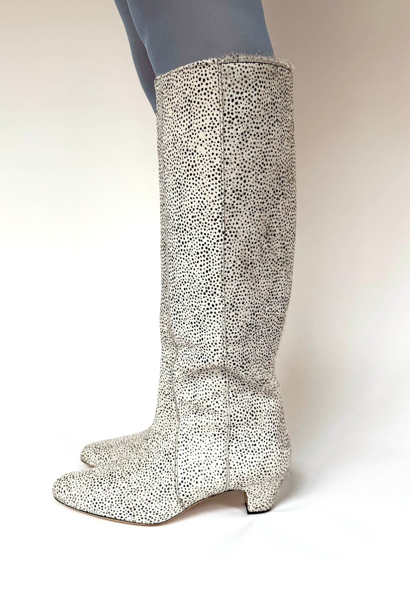Knee high boot with low heel in a tiny cheetah printed, chrome-free, ponyhair calf leather. Almond point toe. Front seaming details. Pulls on to be worn. Fully lined. Capped heel.