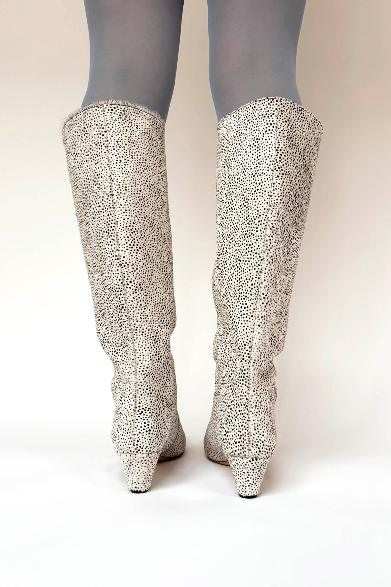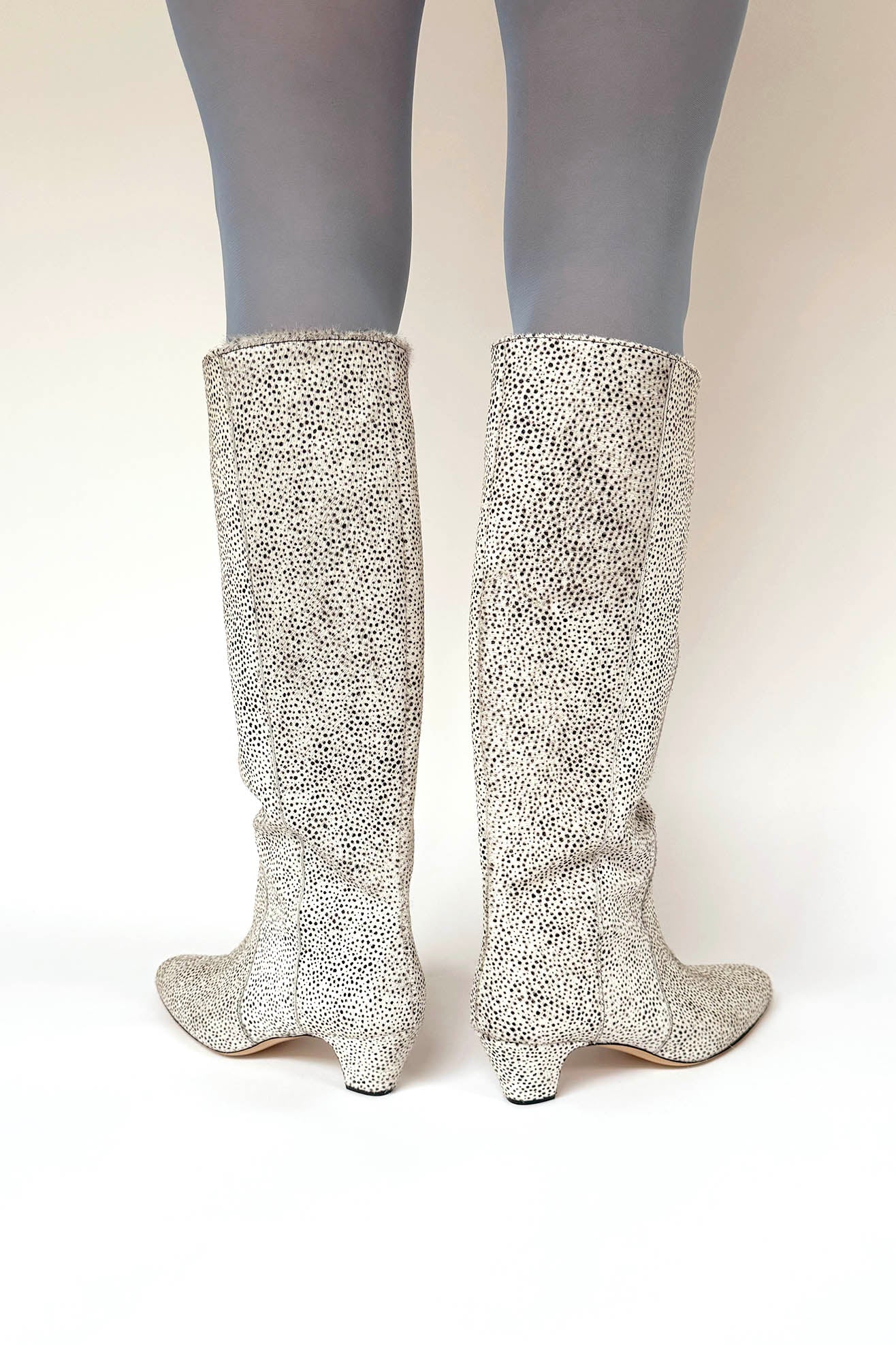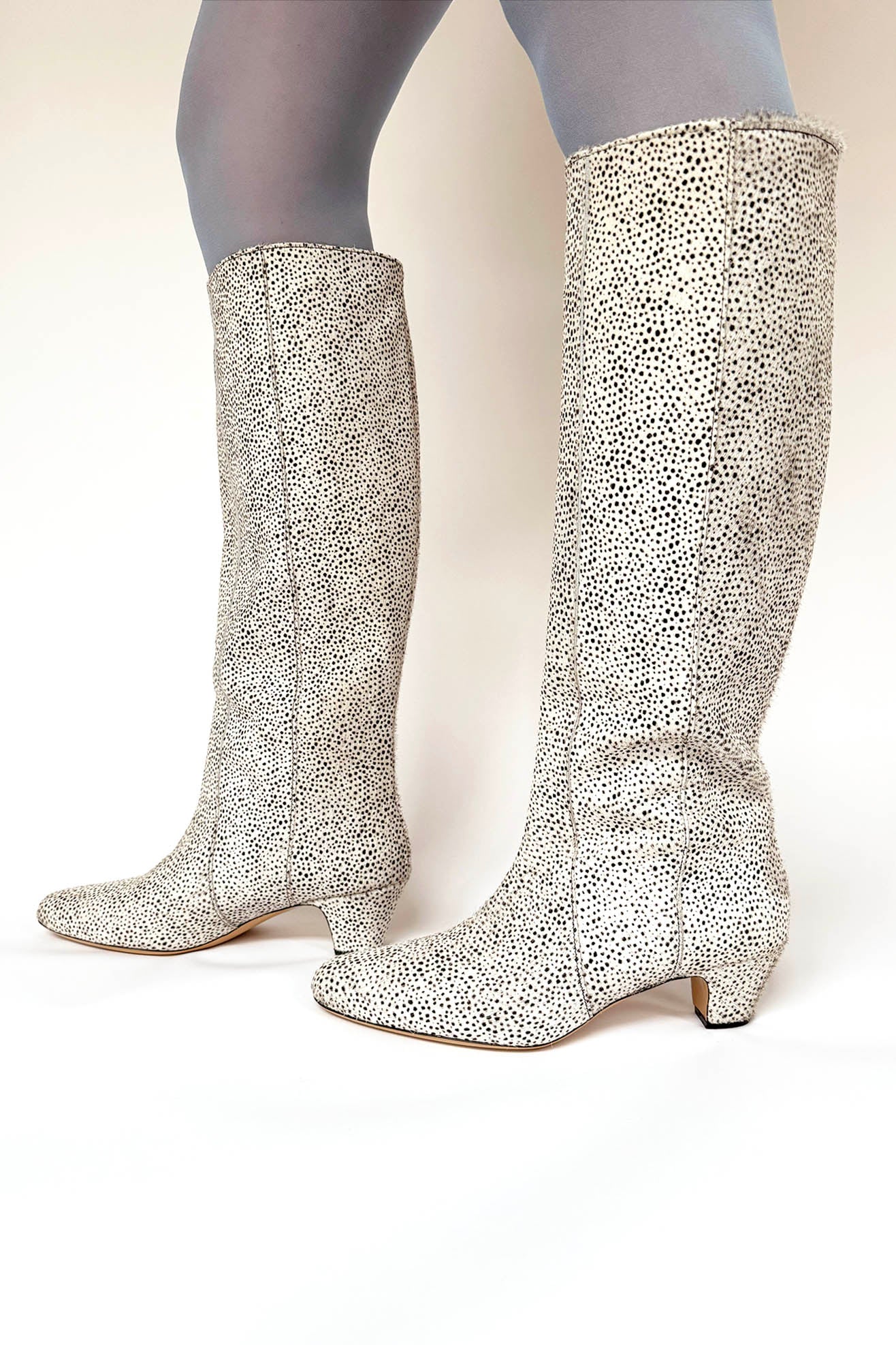 Knee high boot with low heel in a tiny cheetah printed, chrome-free, ponyhair calf leather. Almond point toe. Front seaming details. Pulls on to be worn. Fully lined. Capped heel.