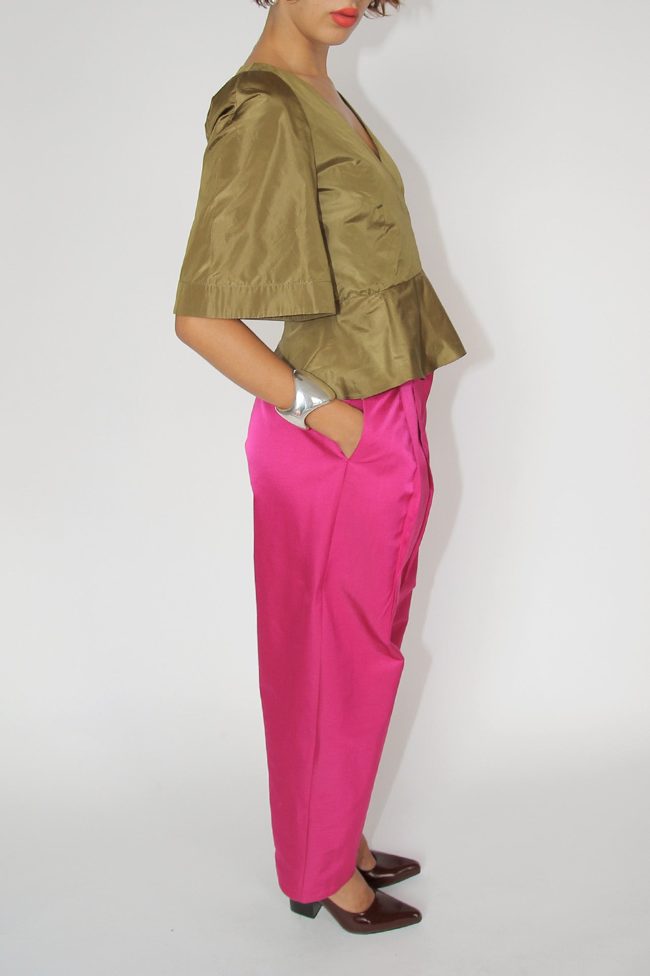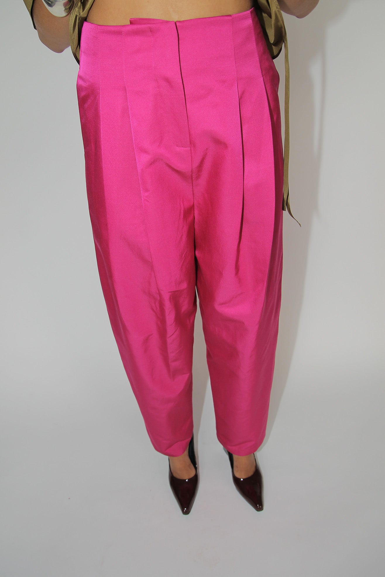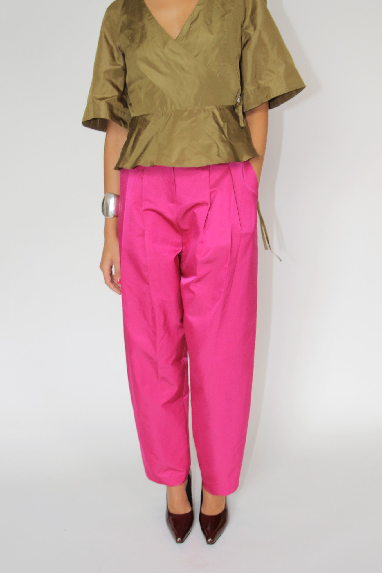Wide leg, pleat front pant in Fuchsia wool/silk blend. Wide leg with slight taper. Zip fly opening with hook and eye closure. Side seam pockets.