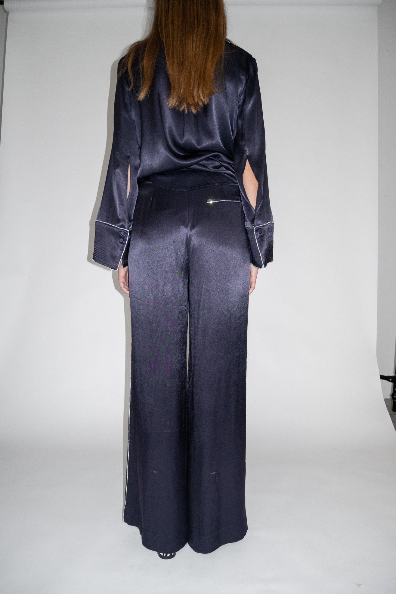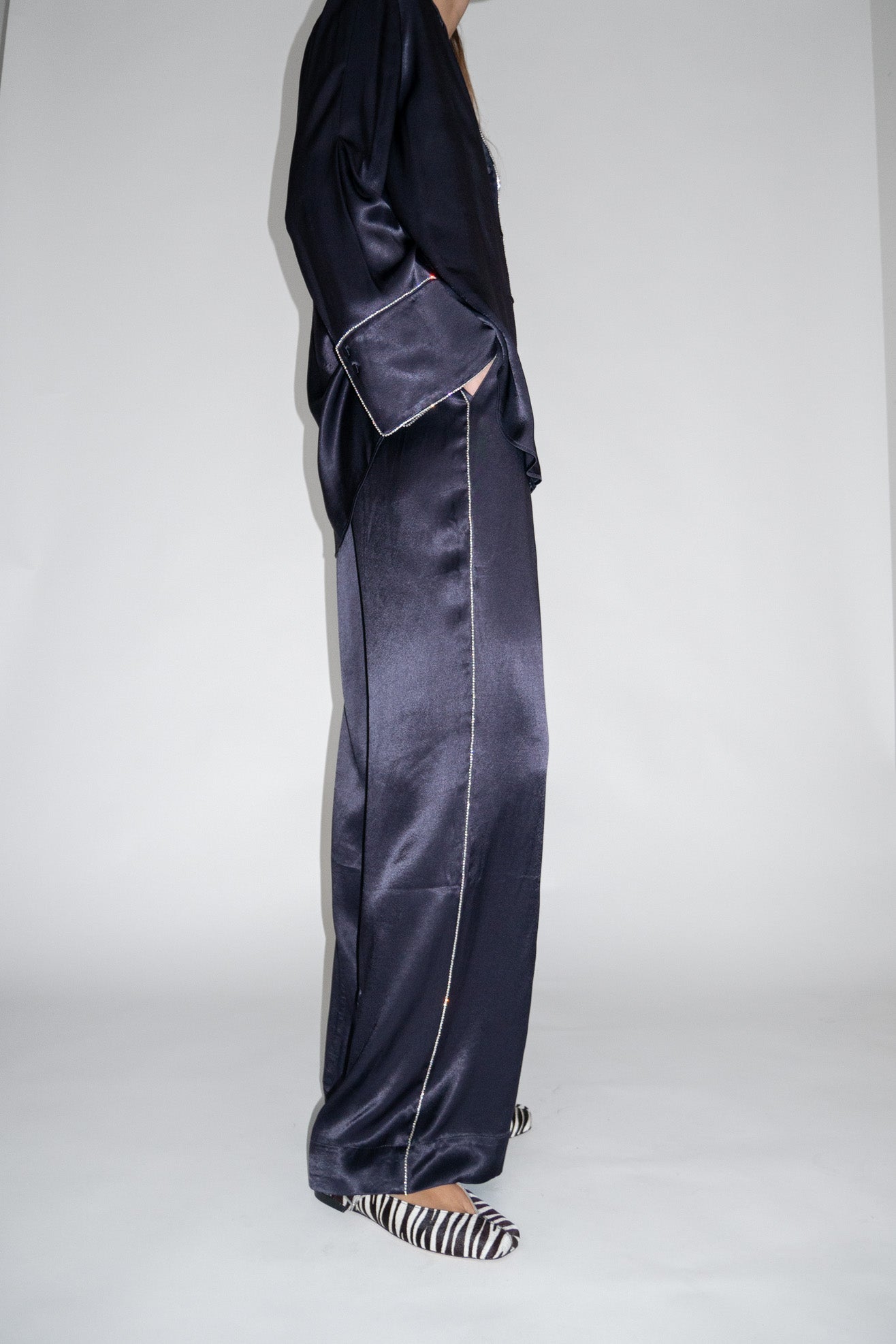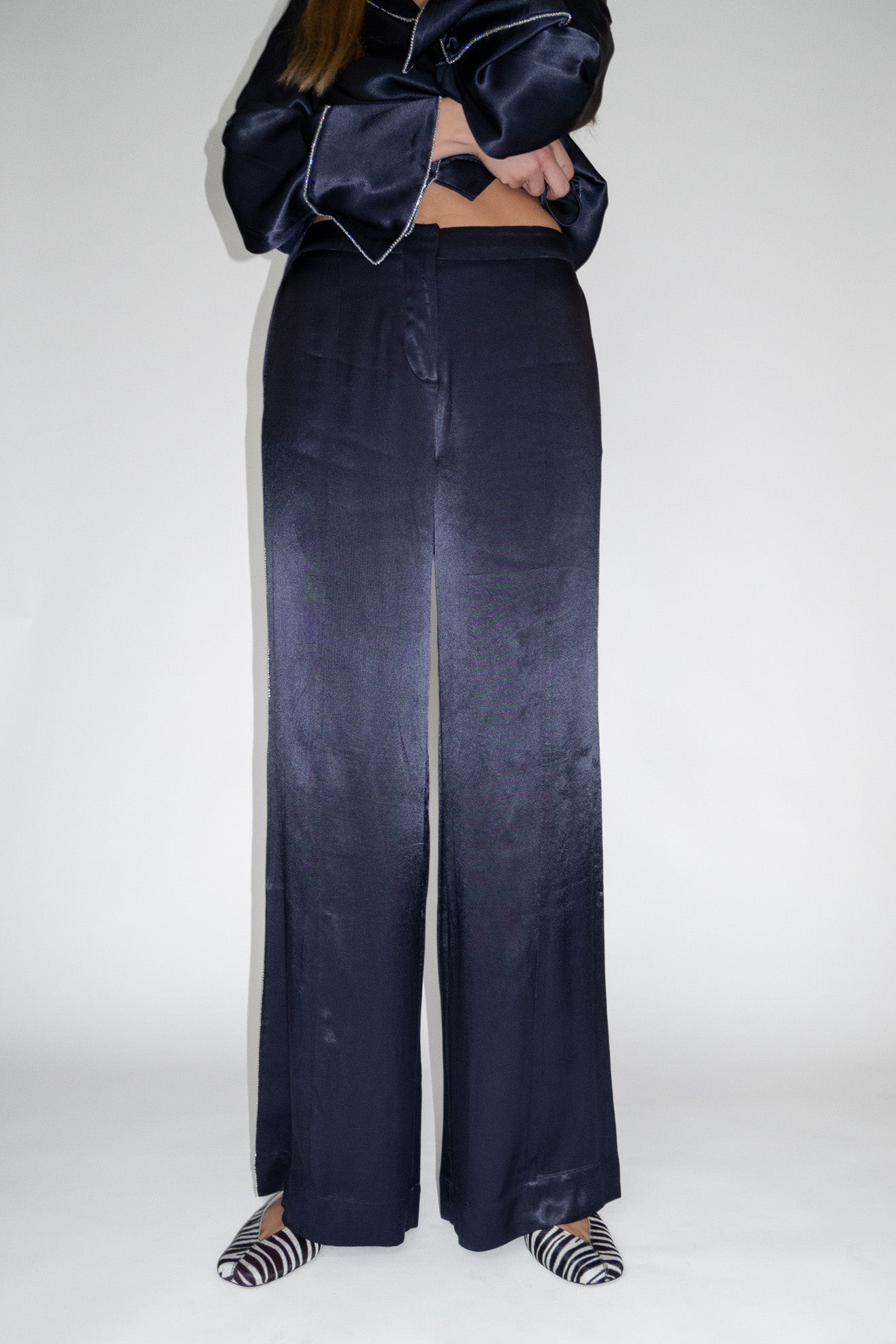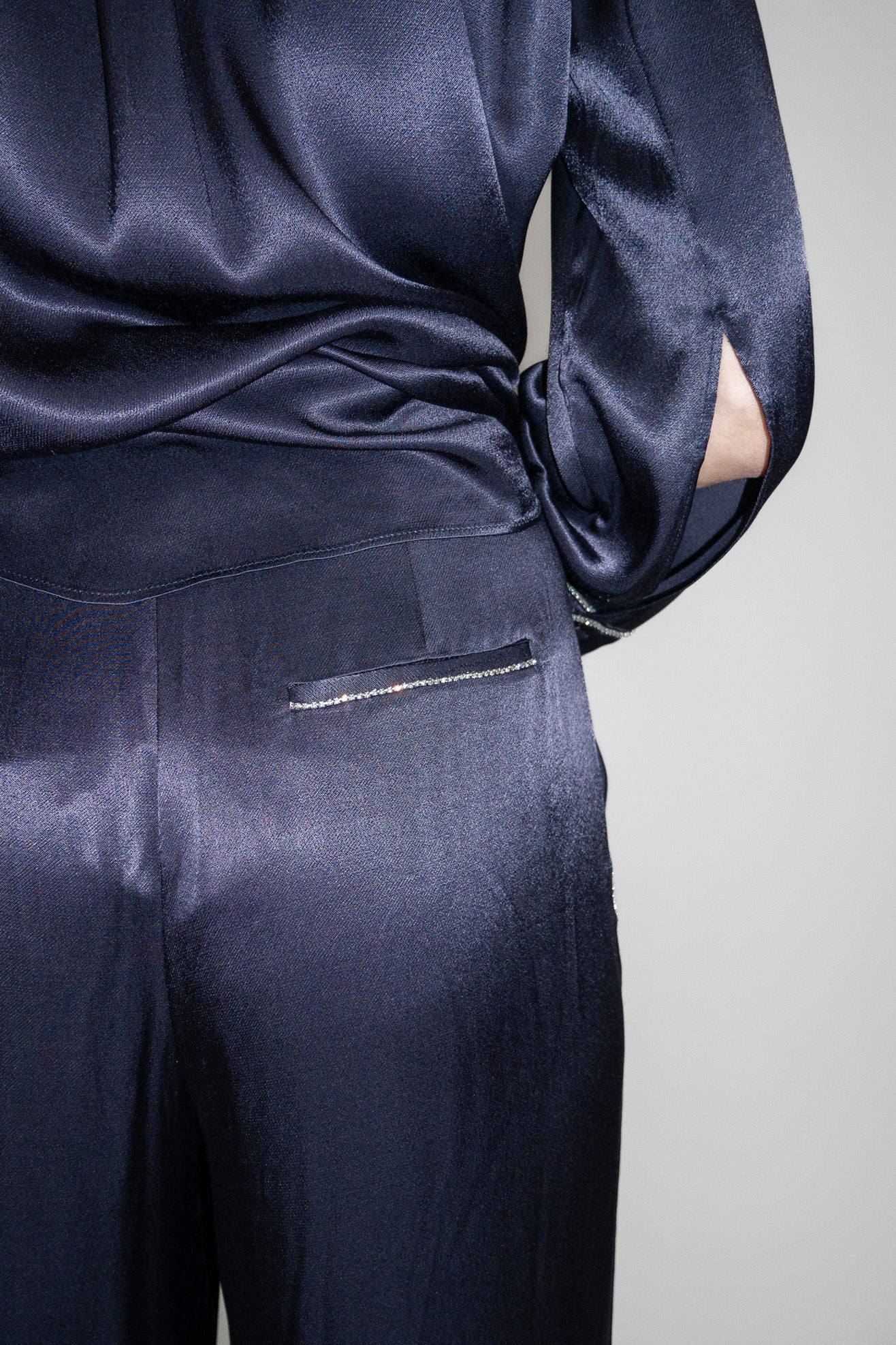 Our signature pant in Midnight viscose satin with rhinestone trim at side seams. Long, wide leg pant. Zip fly closure with invisible metal clasp fastening. Back welt pocket with rhinestone trim. Inner snap detail at back hem for easy hemming.
