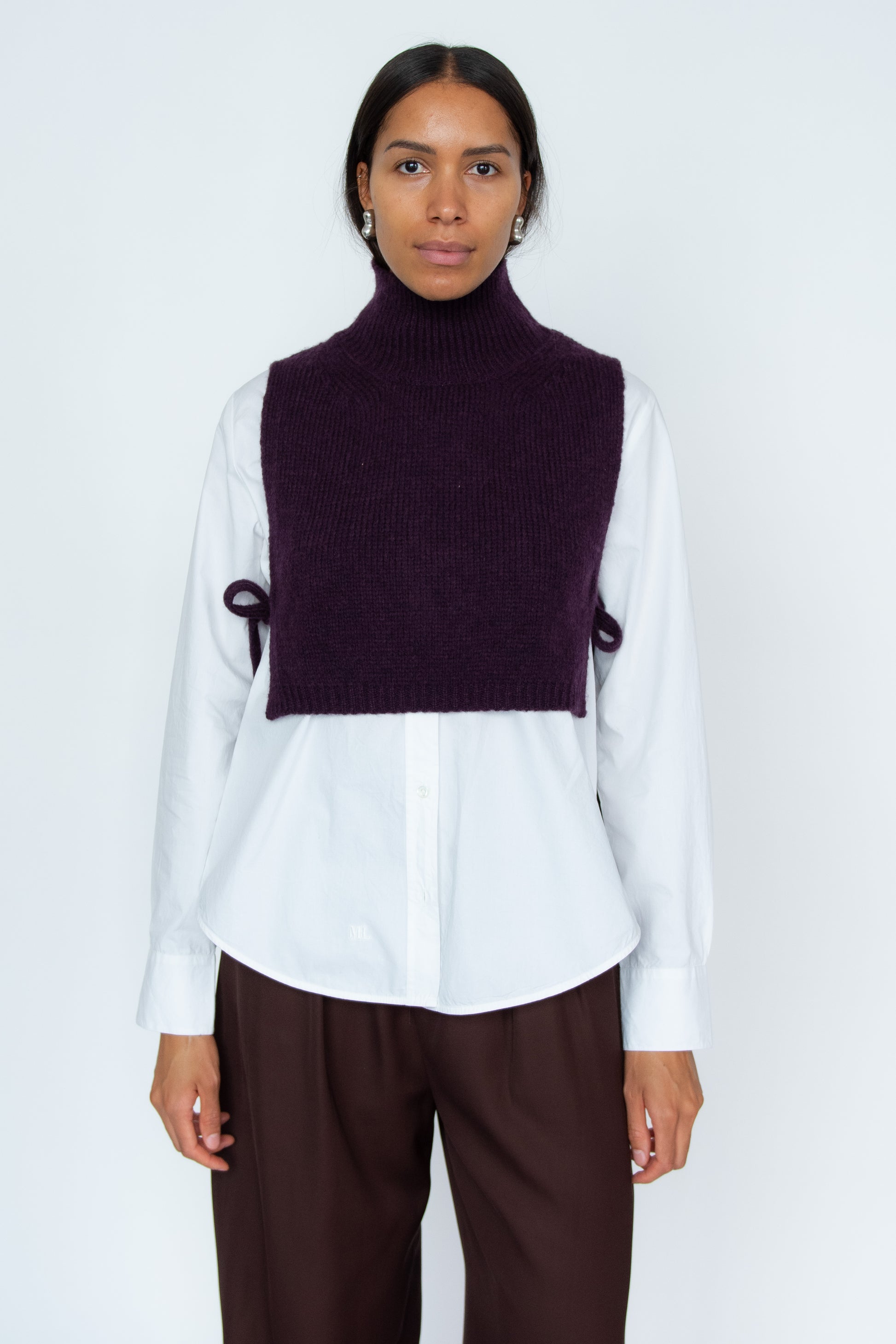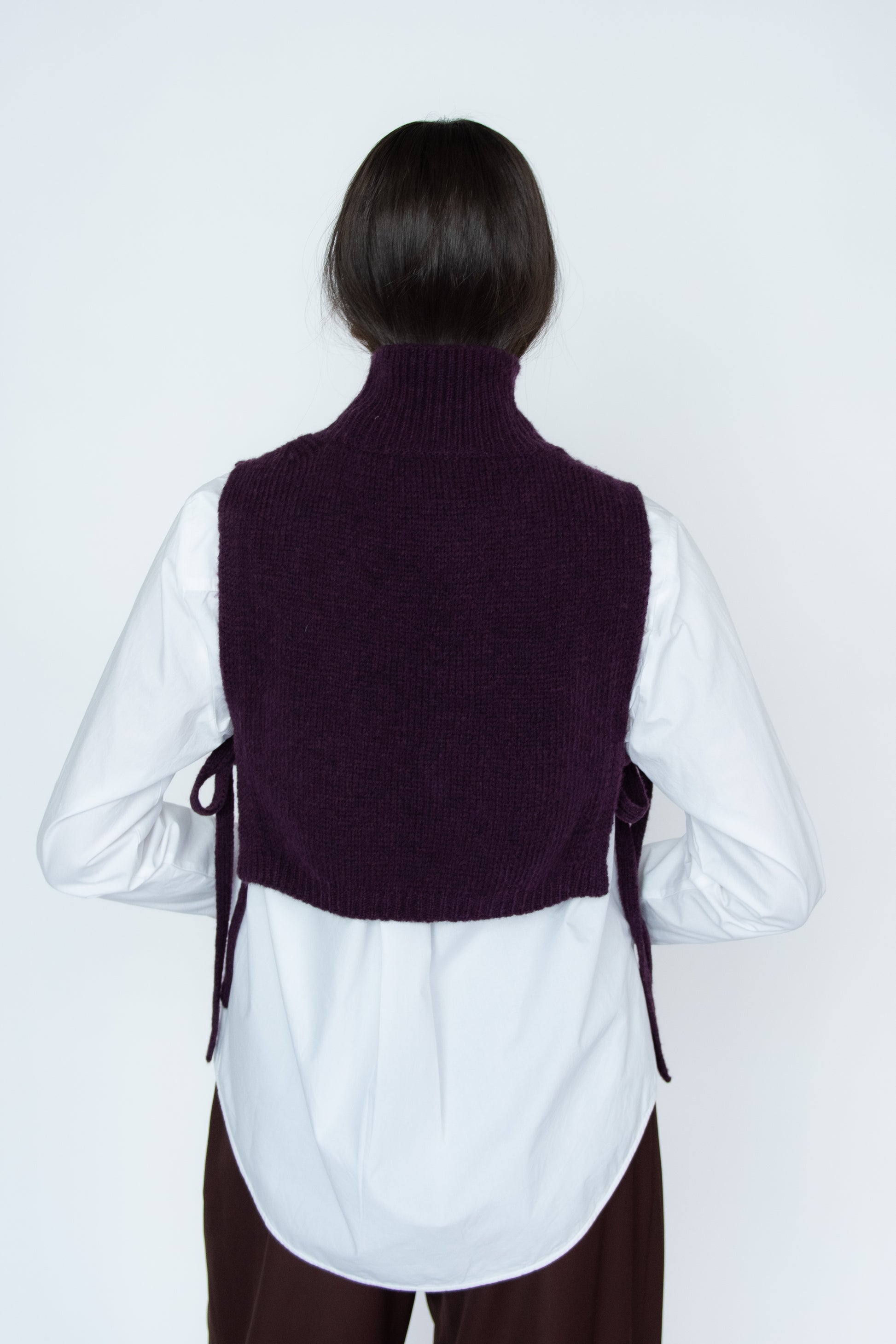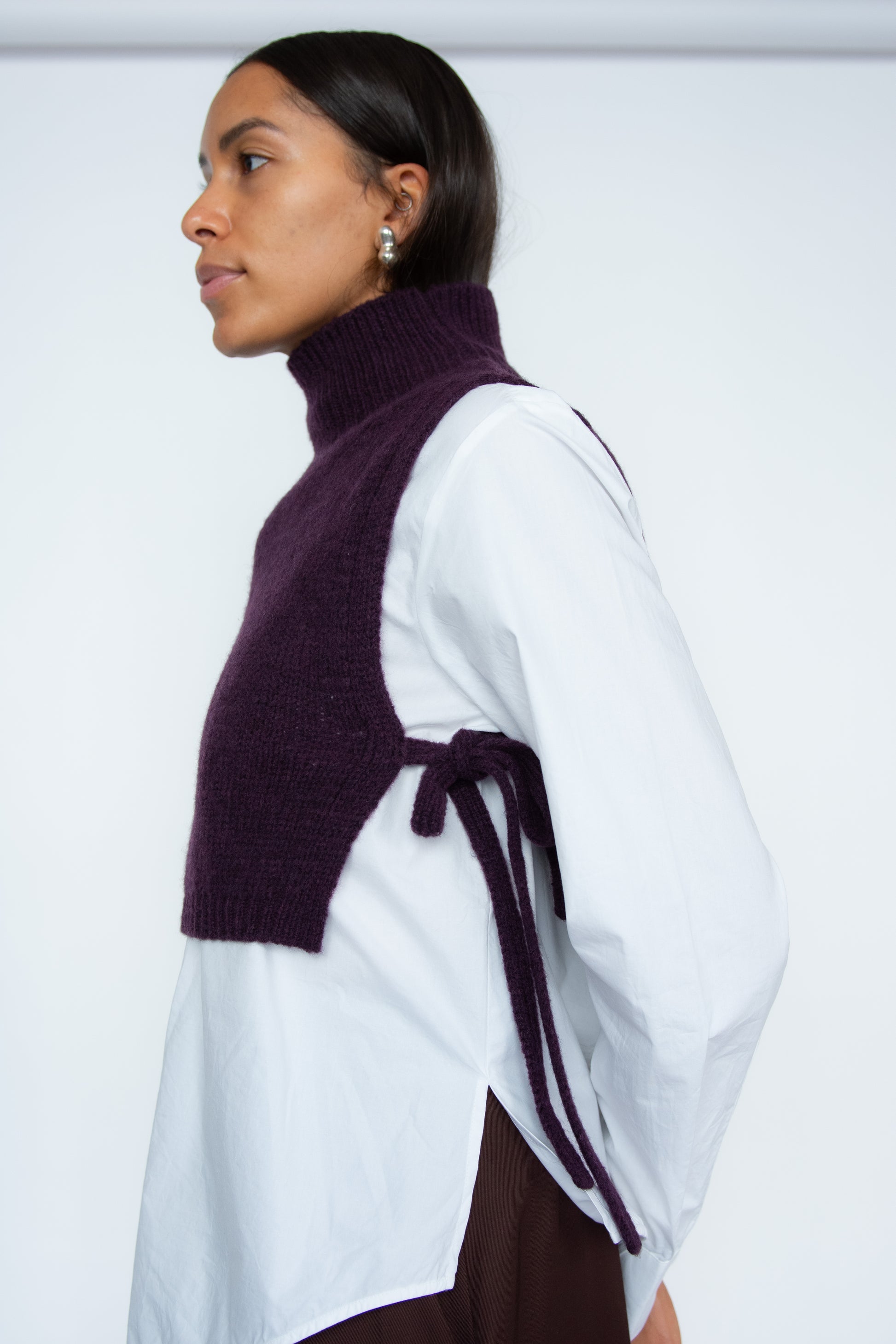 O/S. Relaxed fit, adjustable ties at sides. High neck. Hits at high waist. Very little to no itch in yarn and easy to wear for sensitive skin.