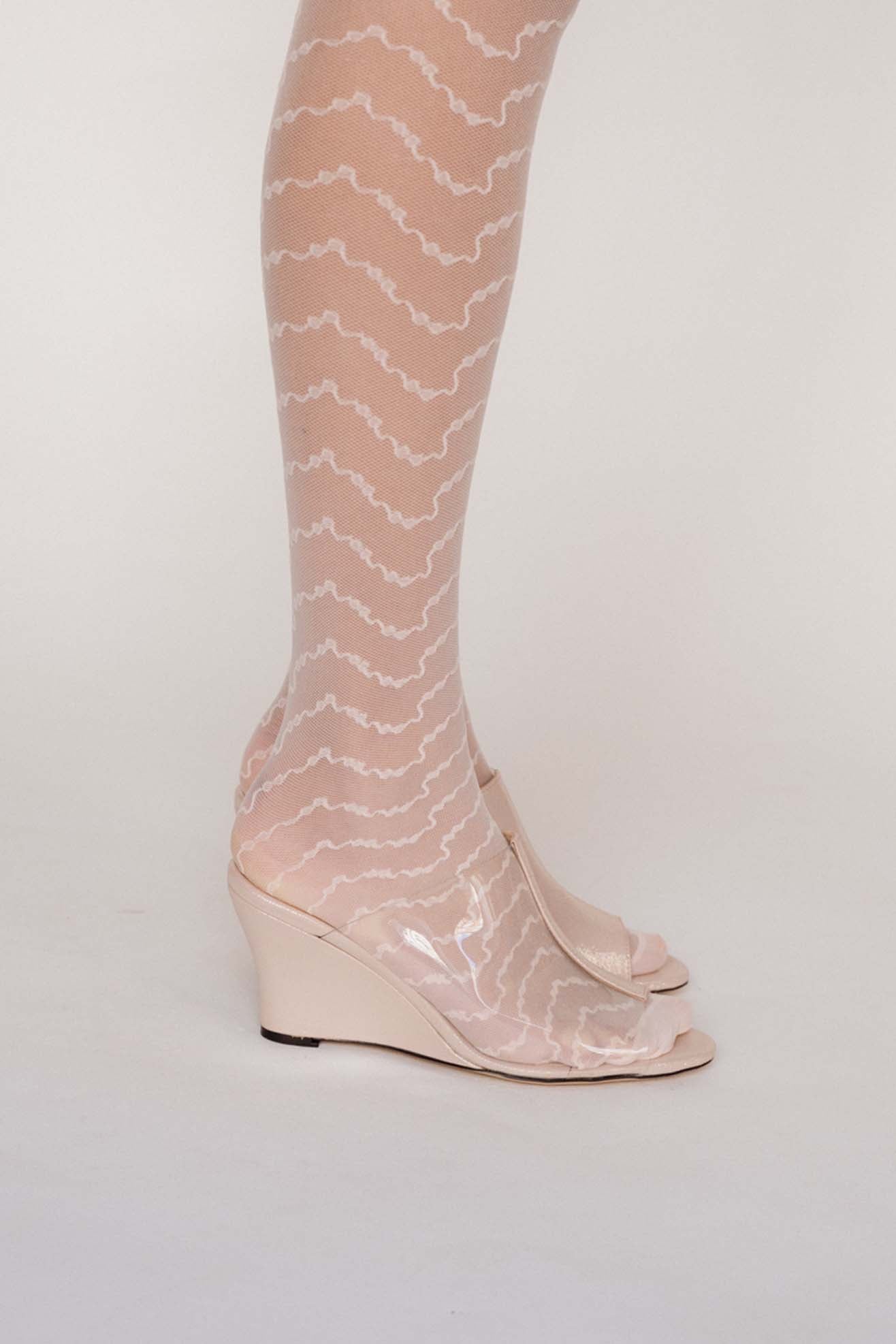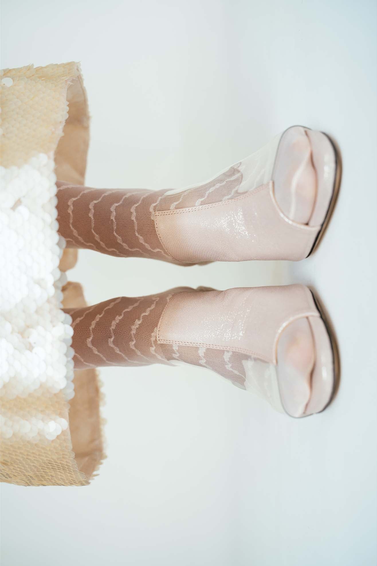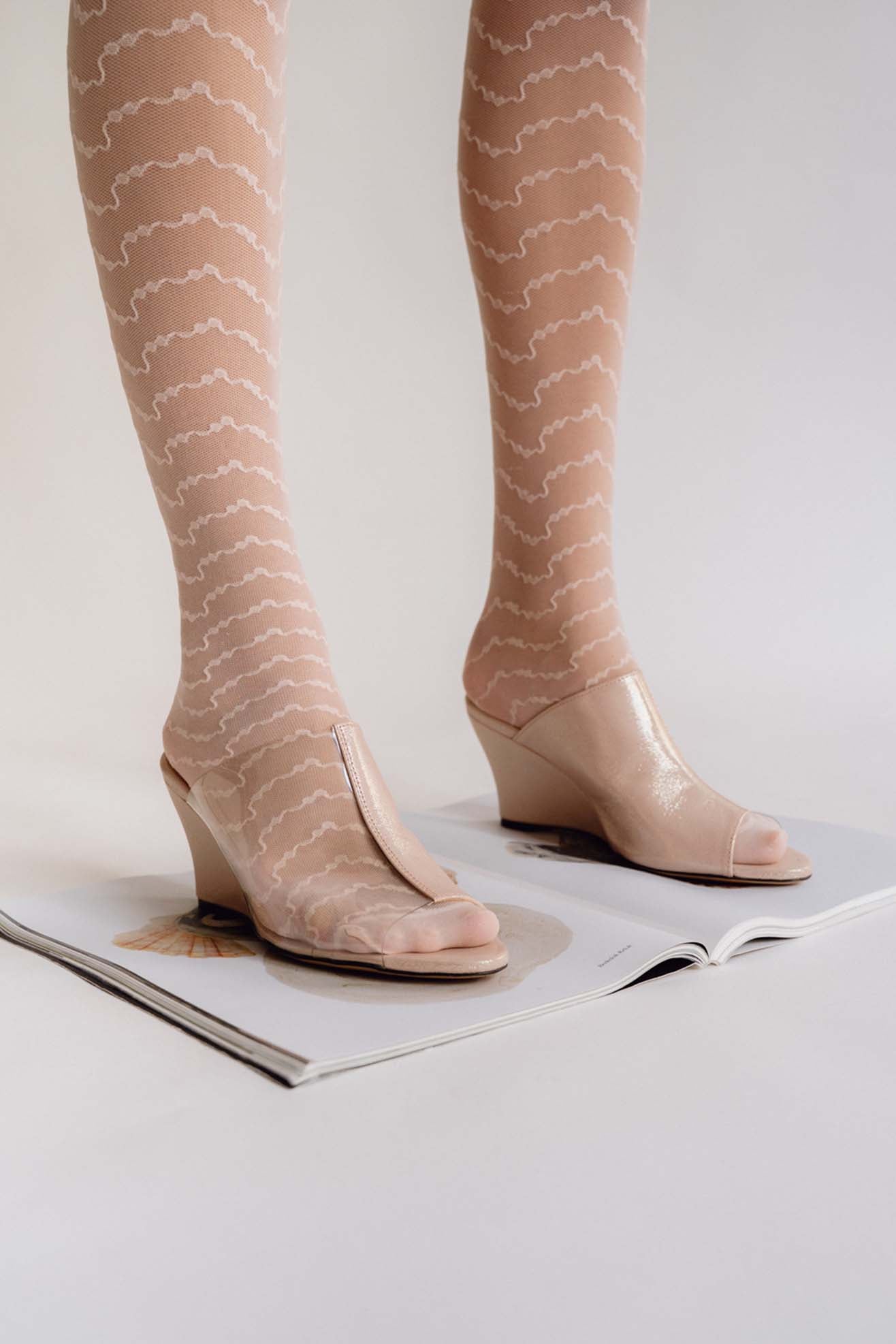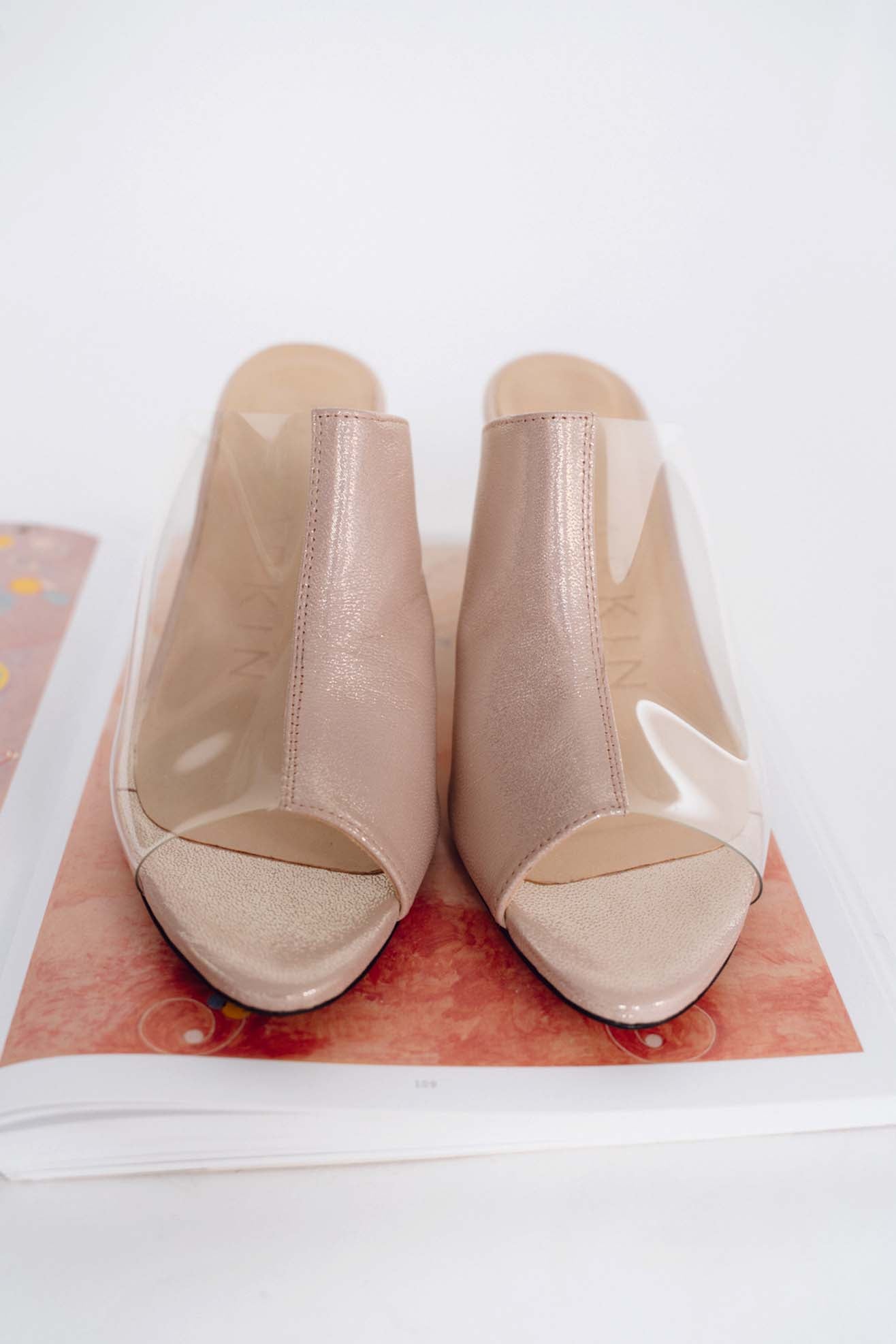 Wedge heel mules in metallic glitter nappa calf leather with. Split upper with transparent PVC and nappa calf leather. Seaming detail at front. Pointed almond toe. Slips on to be worn. Leather lined sole and heel.