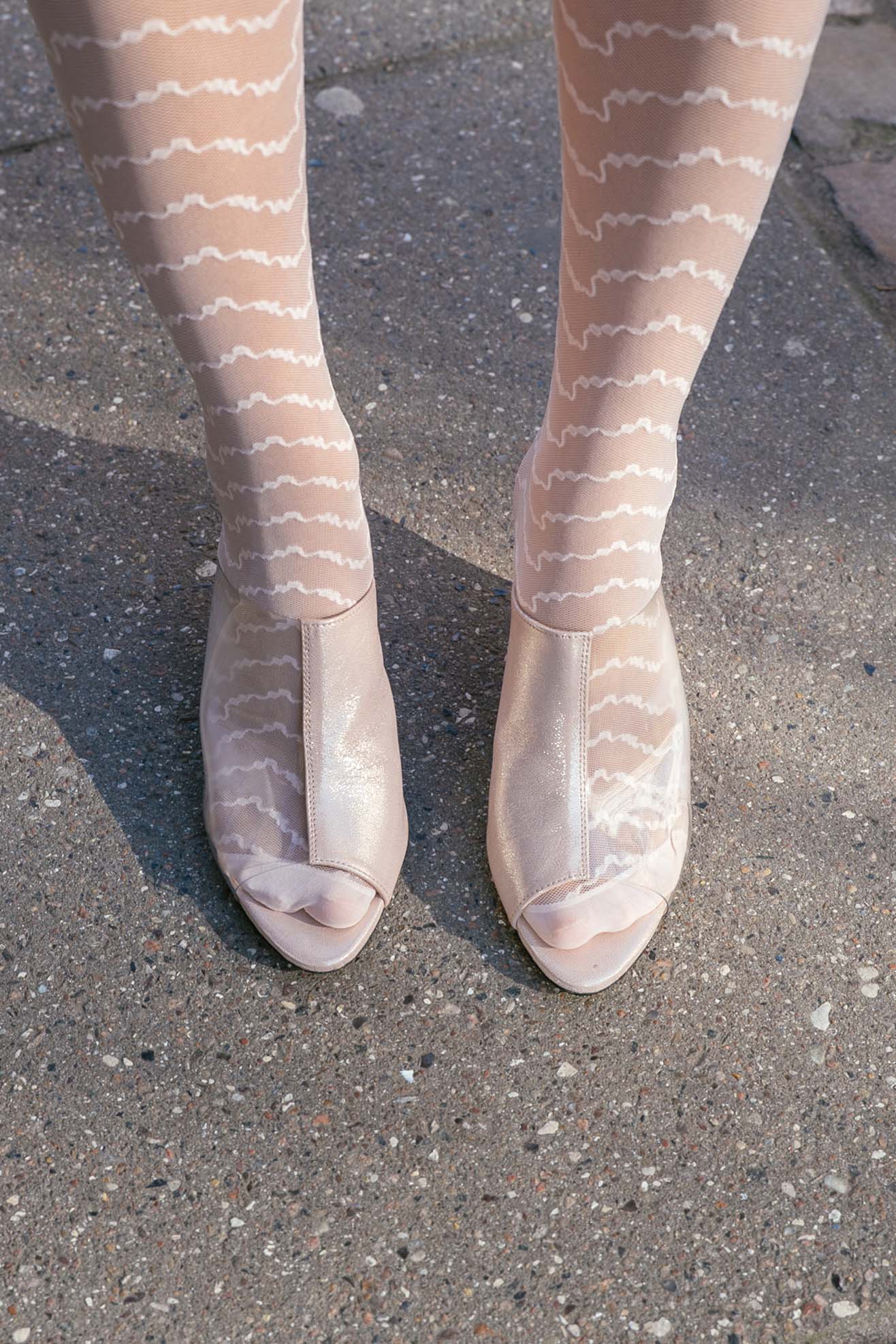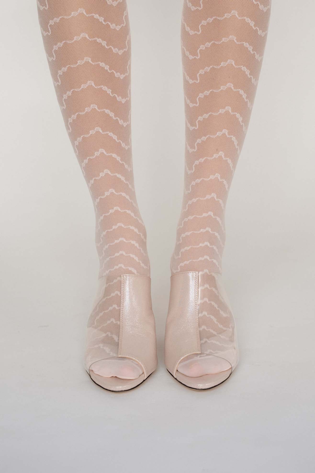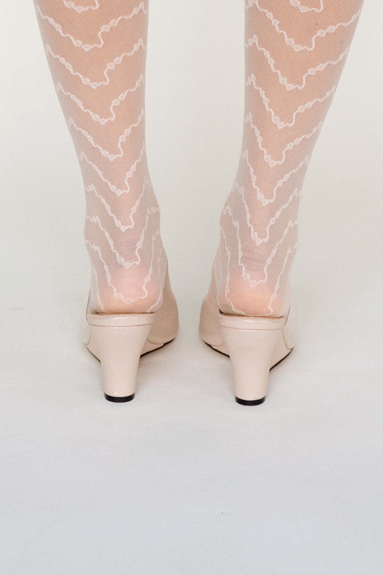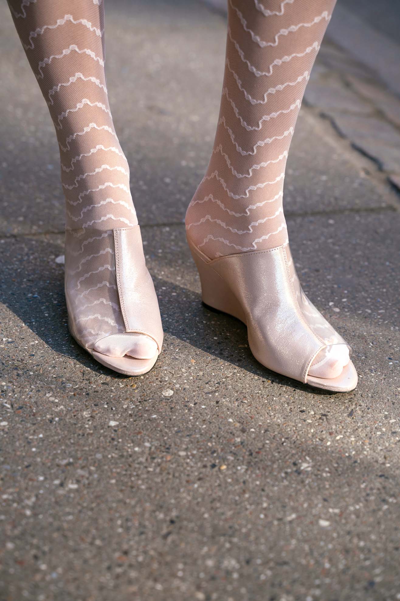 Wedge heel mules in metallic glitter nappa calf leather with. Split upper with transparent PVC and nappa calf leather. Seaming detail at front. Pointed almond toe. Slips on to be worn. Leather lined sole and heel.