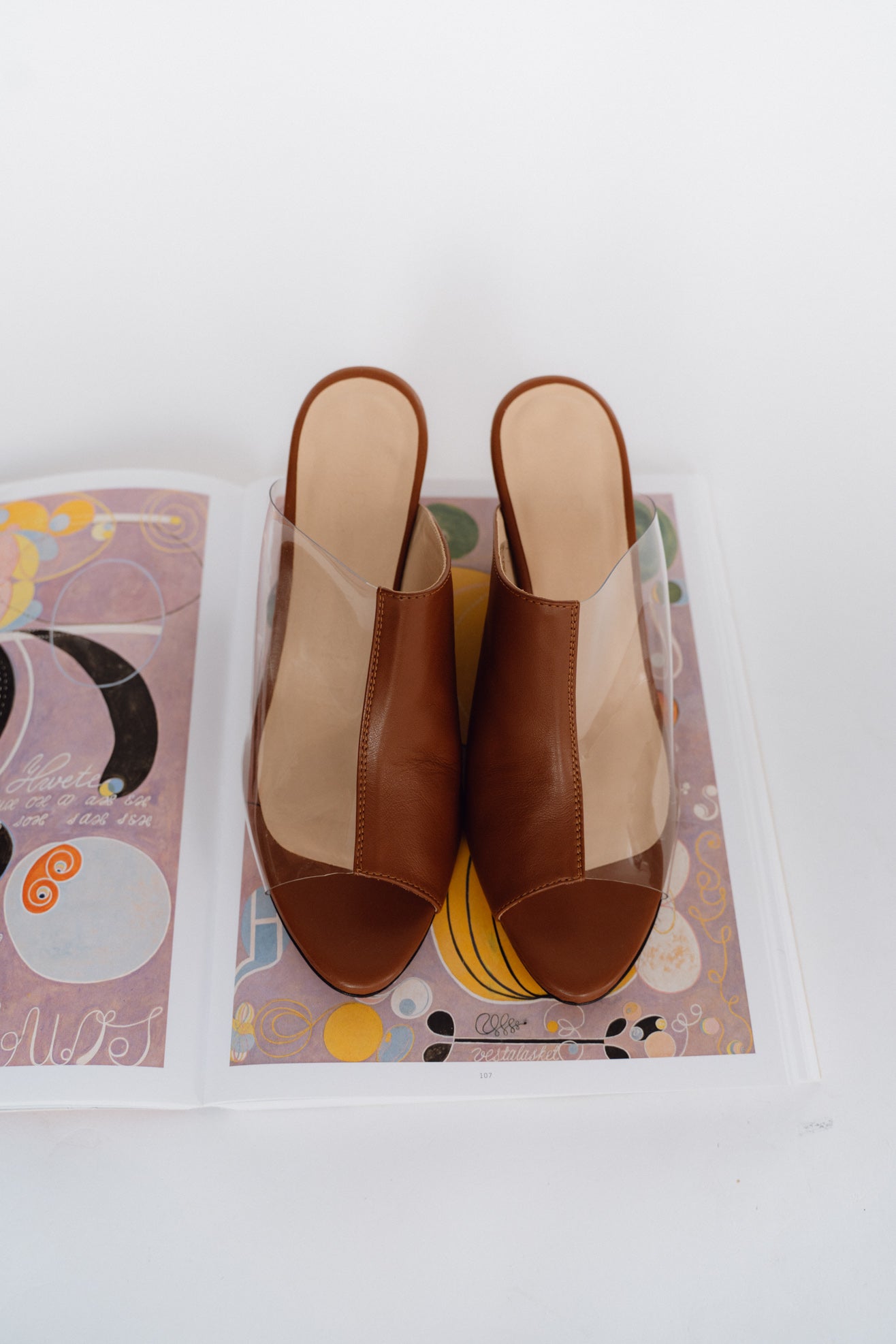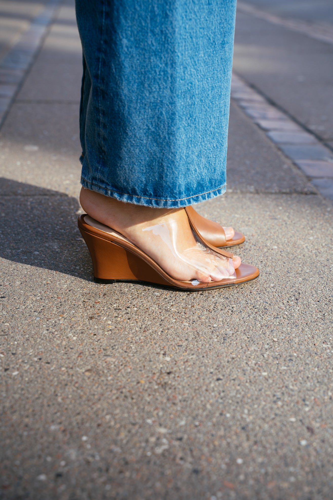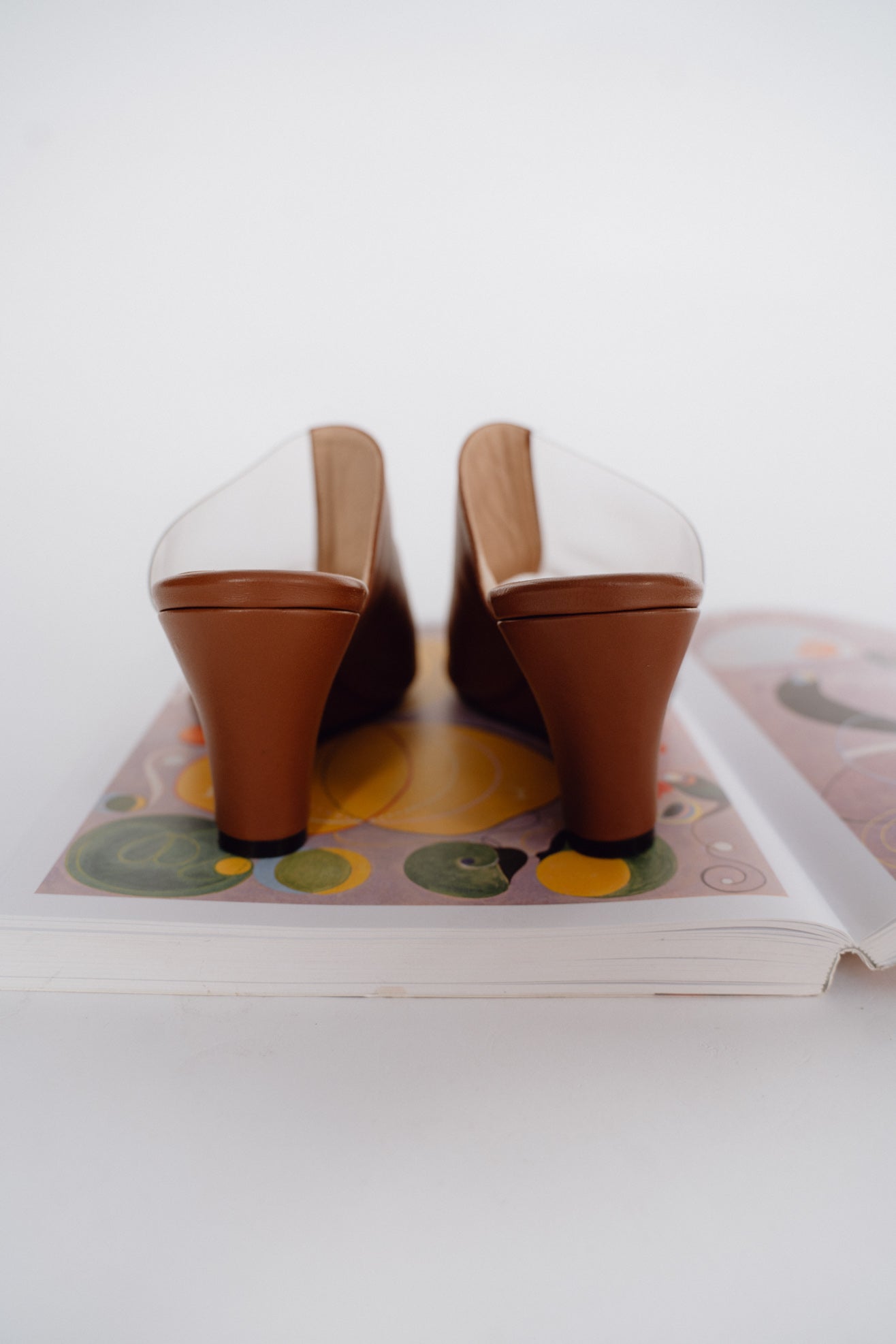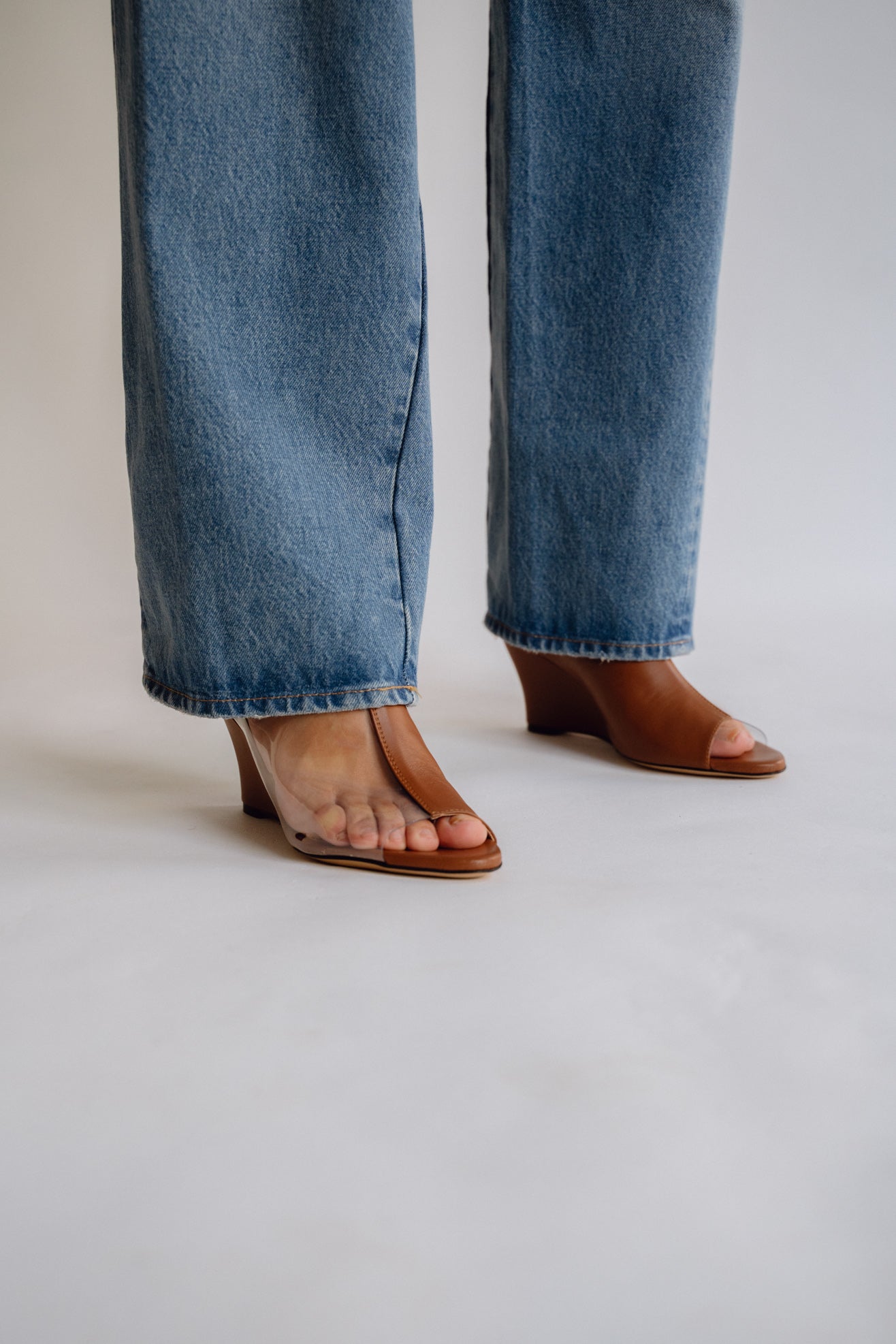 Wedge heel mules in brown nappa leather. Split brown/transparent plastic band. Seaming detail at front. Rounded point toe. Slips on to be worn. Leather lined sole and heel.