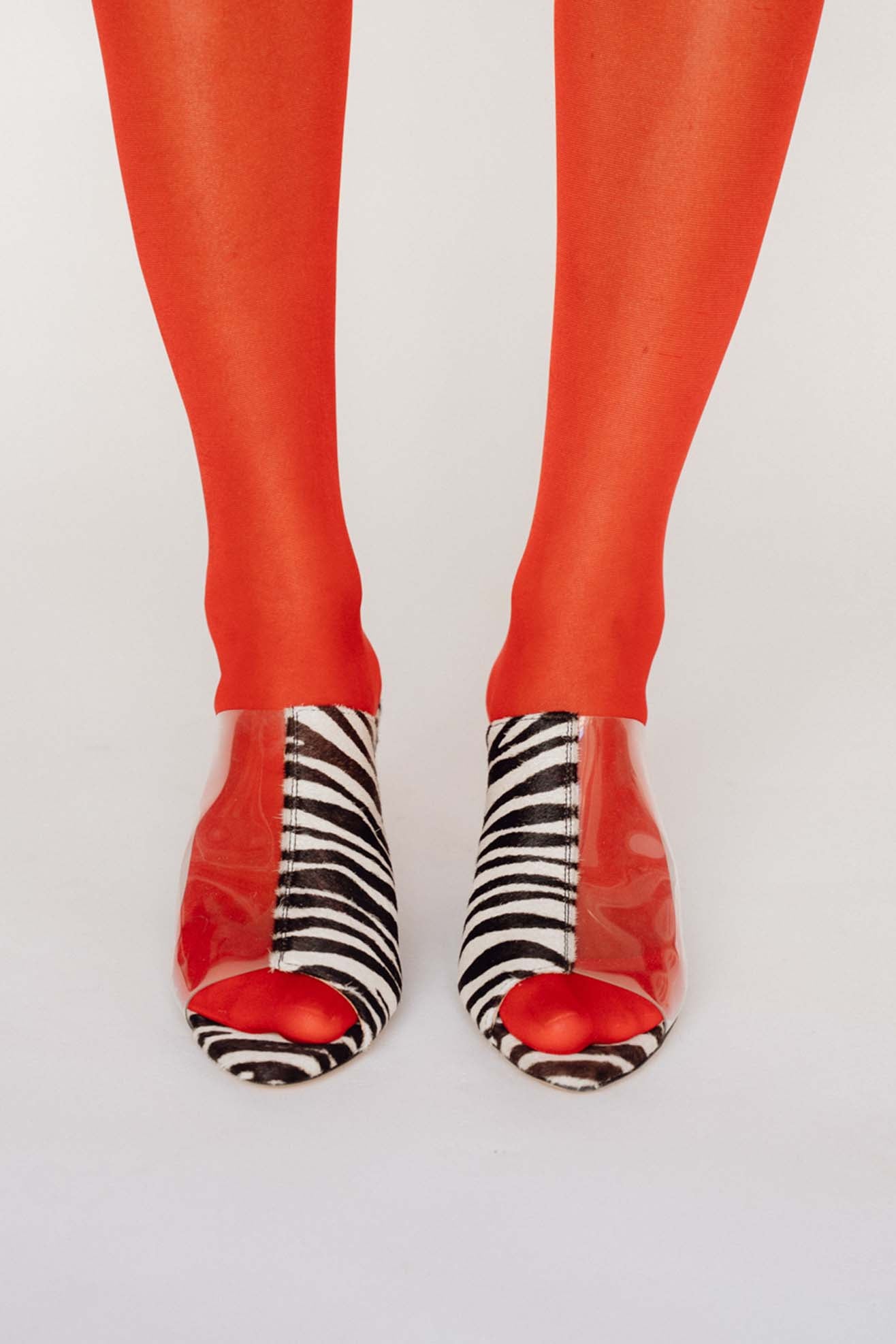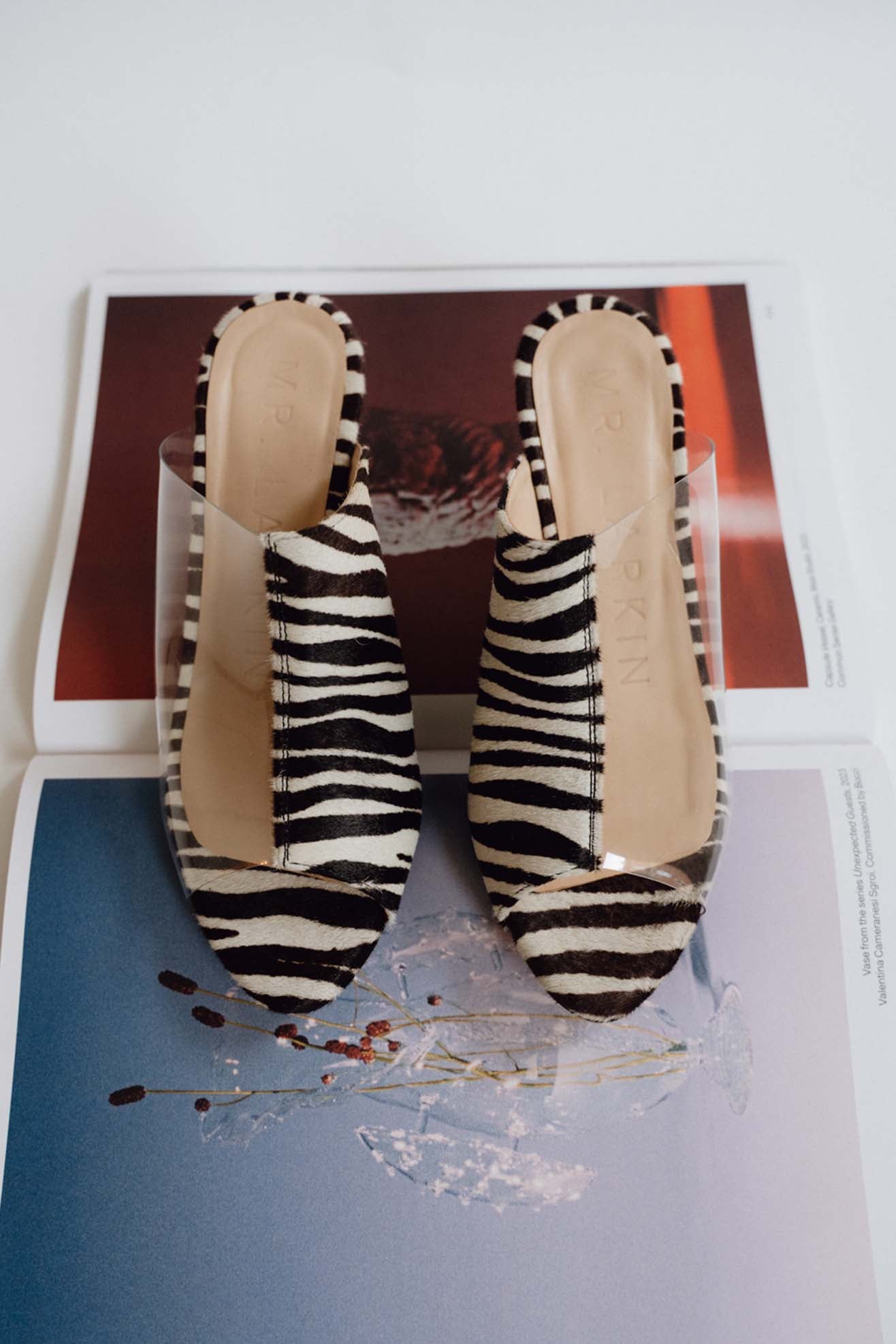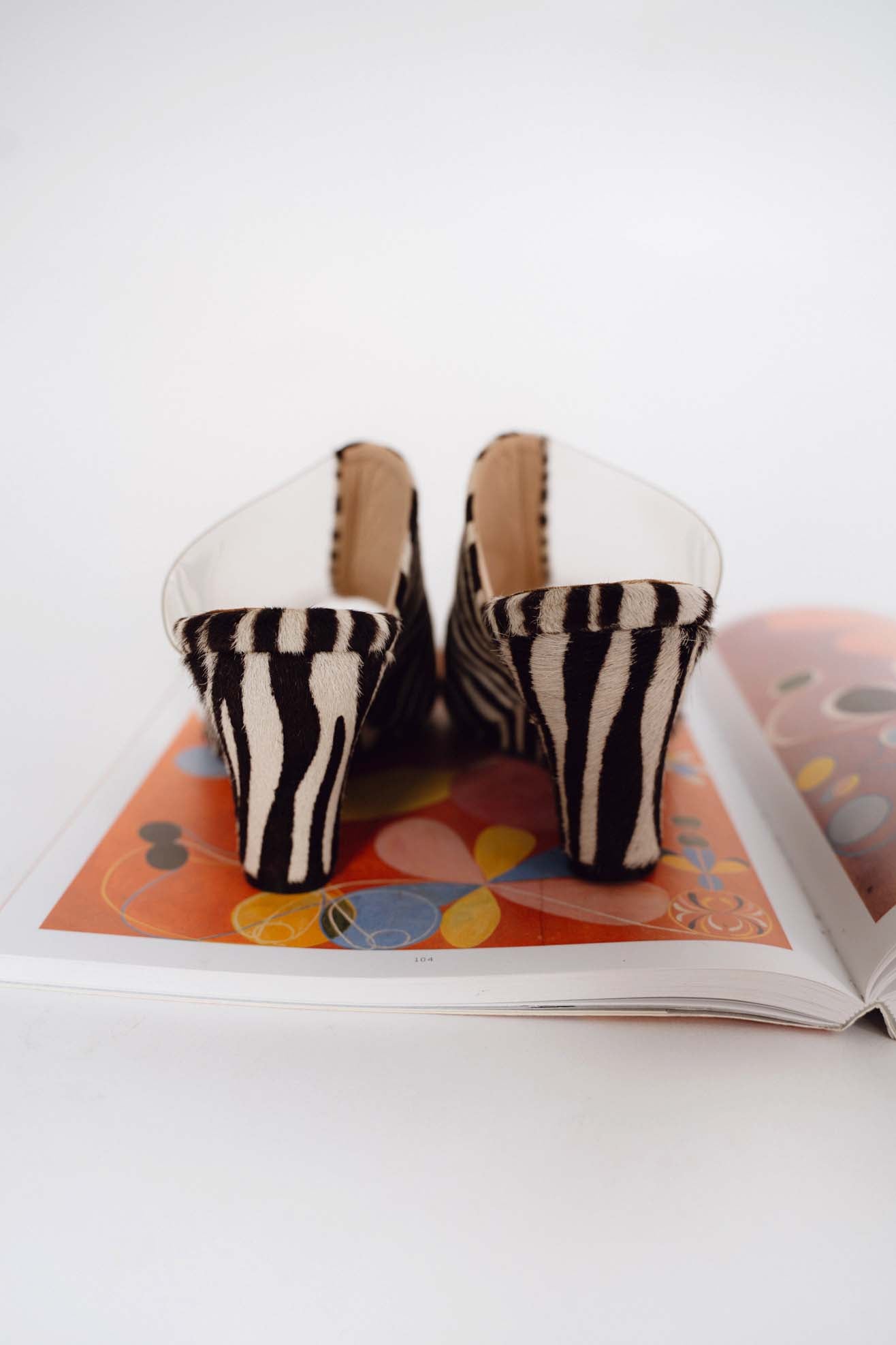 Wedge heel mules in Zebra ponyhair calf leather. Split upper with transparent PVC and zebra ponyhair calf leather. Seaming detail at front. Pointed almond toe. Slips on to be worn. Leather lined sole and heel.