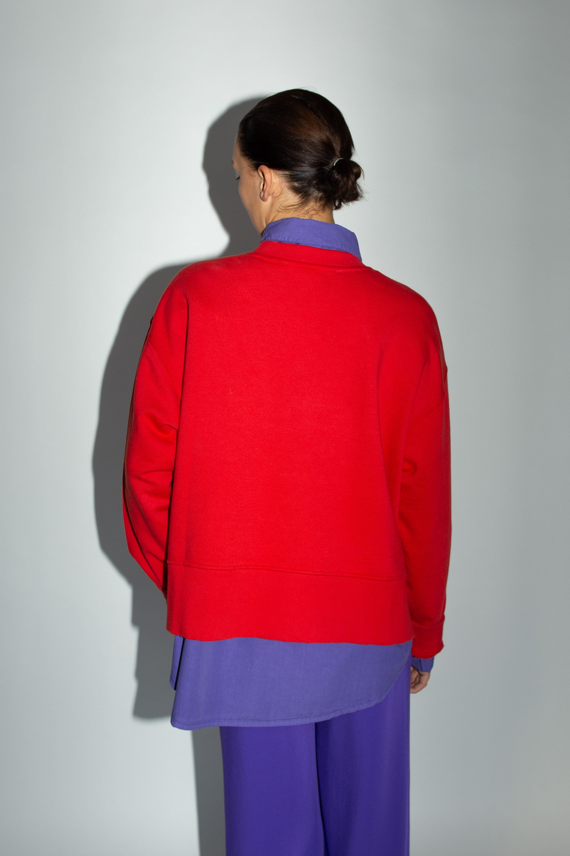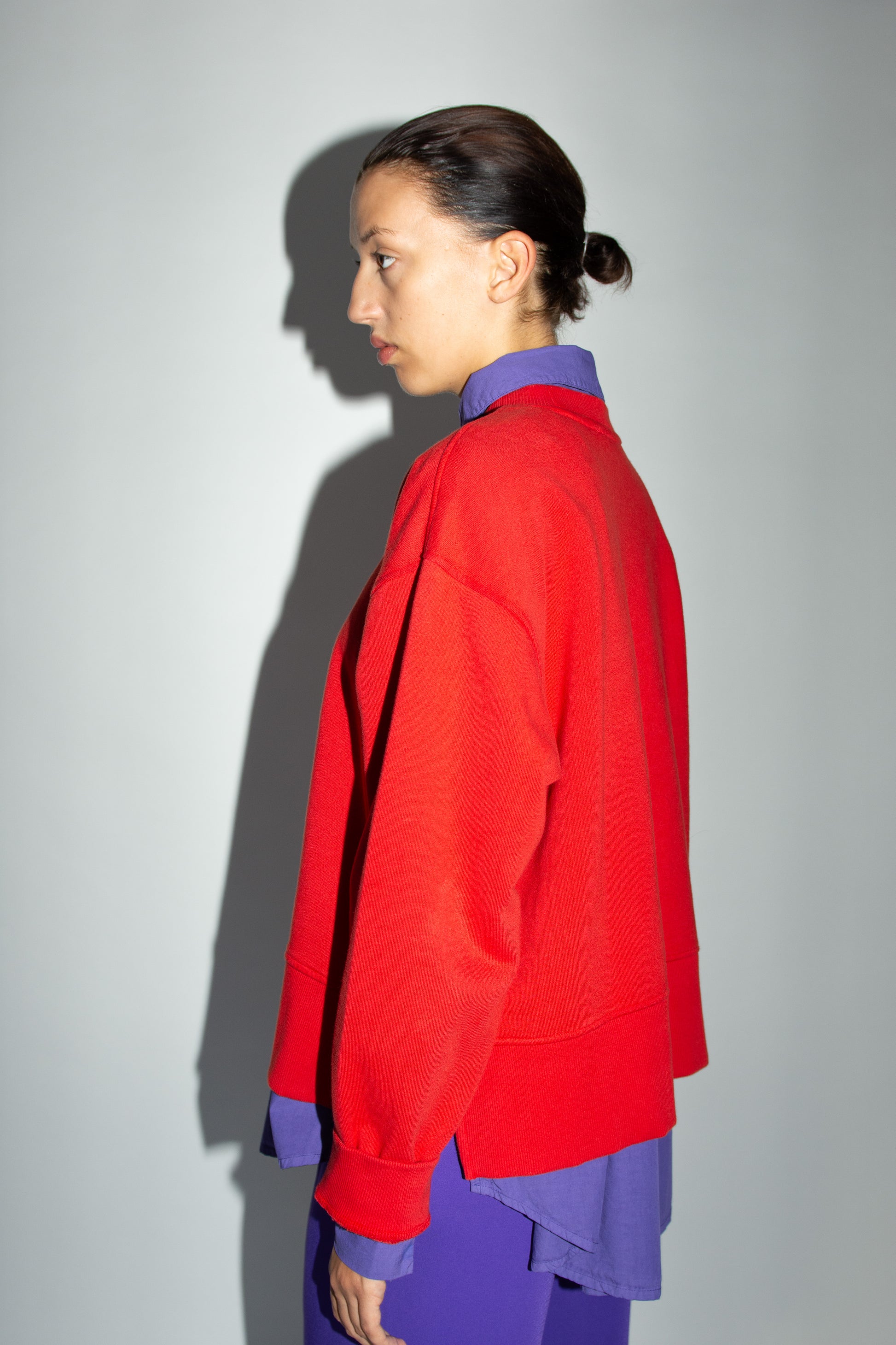 Boxy, slightly oversized crew neck sweatshirt in lipstick red organic cotton french terry. Dropped shoulders. Side slits at hem. Wide rib finish at sleeves and hem. Slips on overhead to be worn.