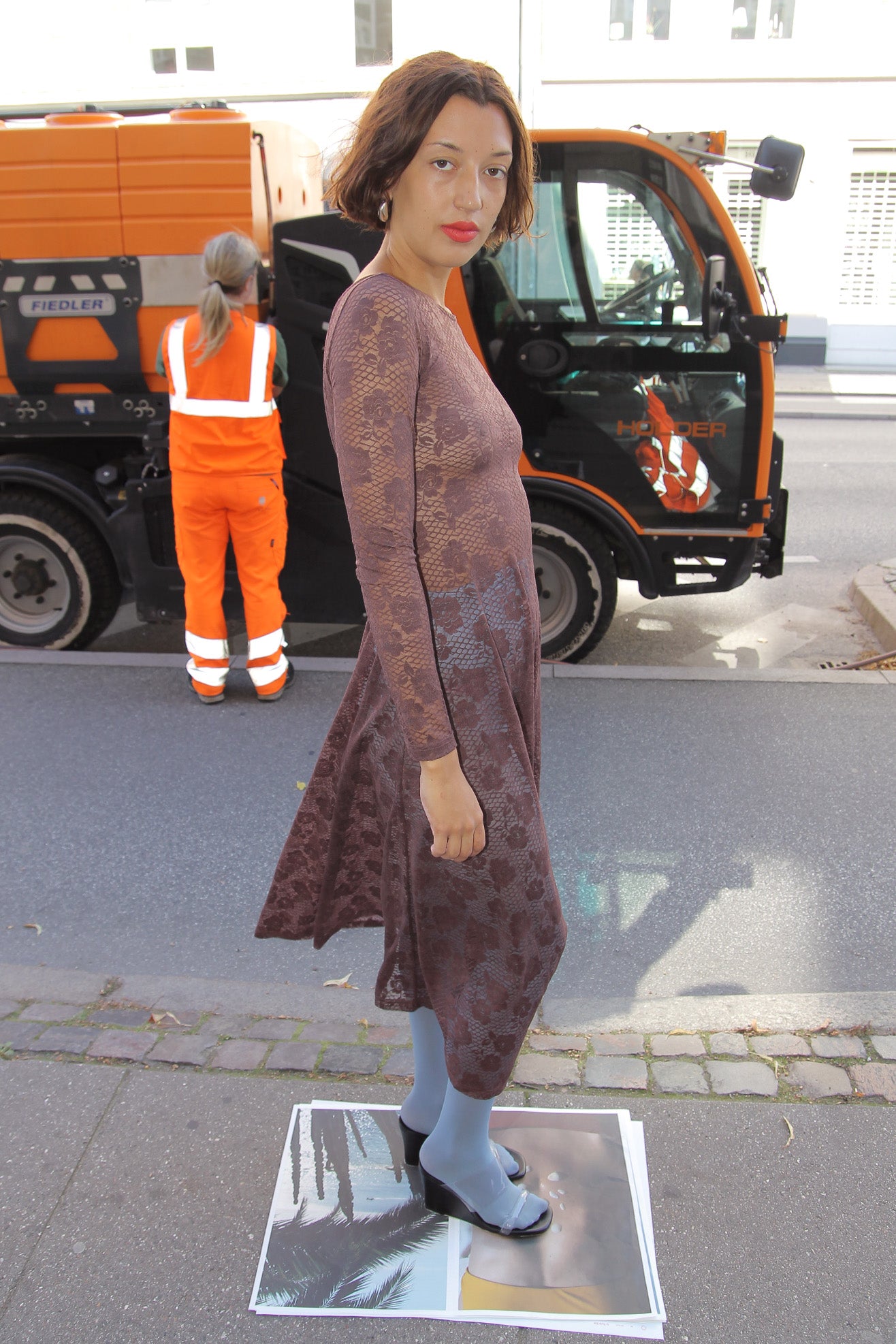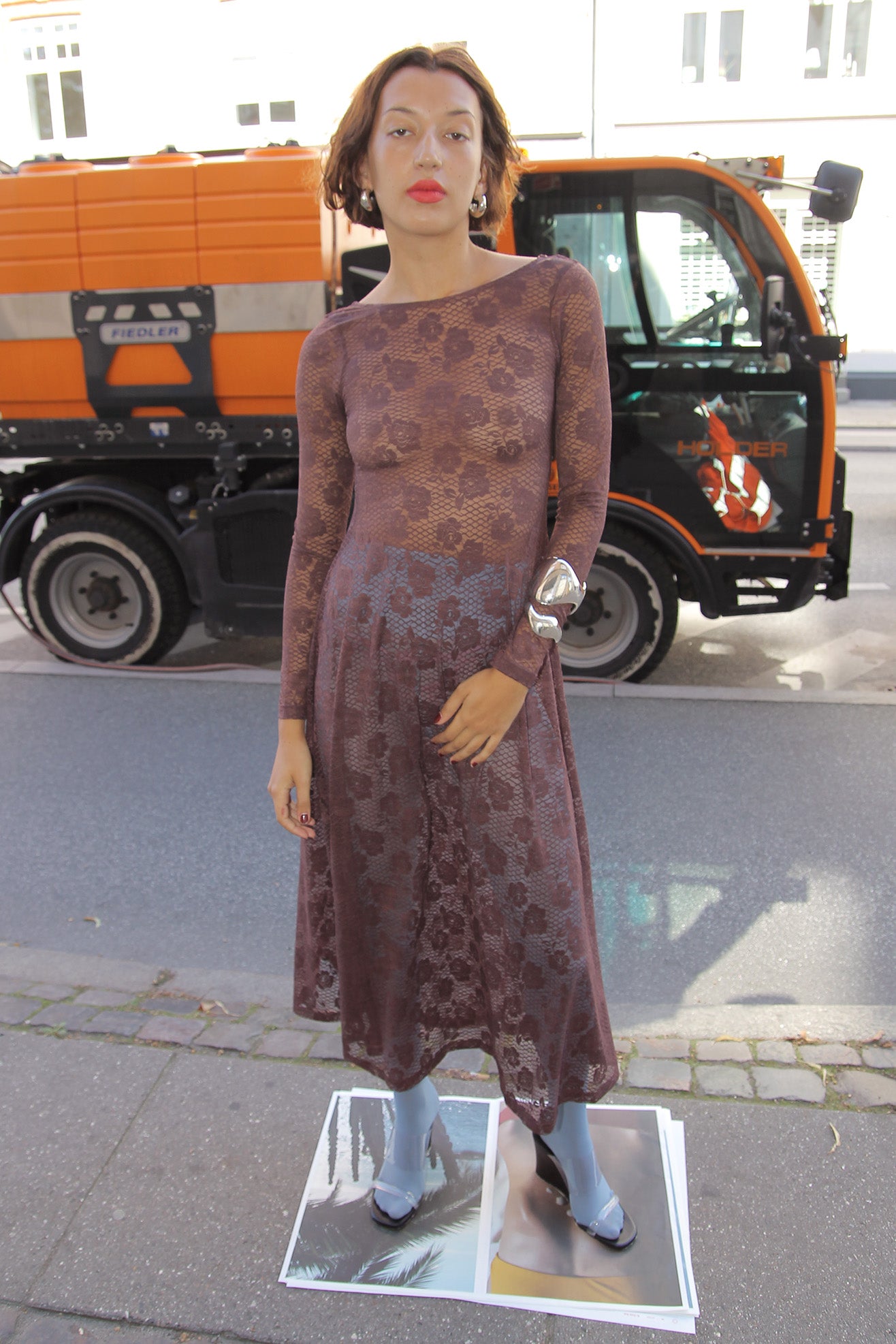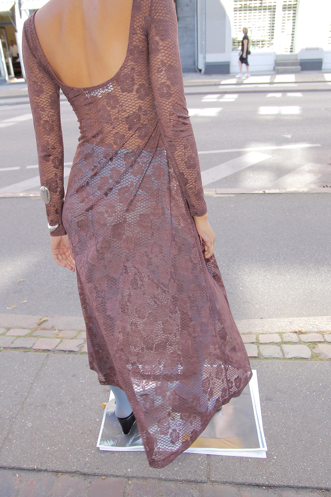 Long-sleeved jersey lace dress in mocha brown color. Scoop neck. Low back. Flared hem. Unlined.