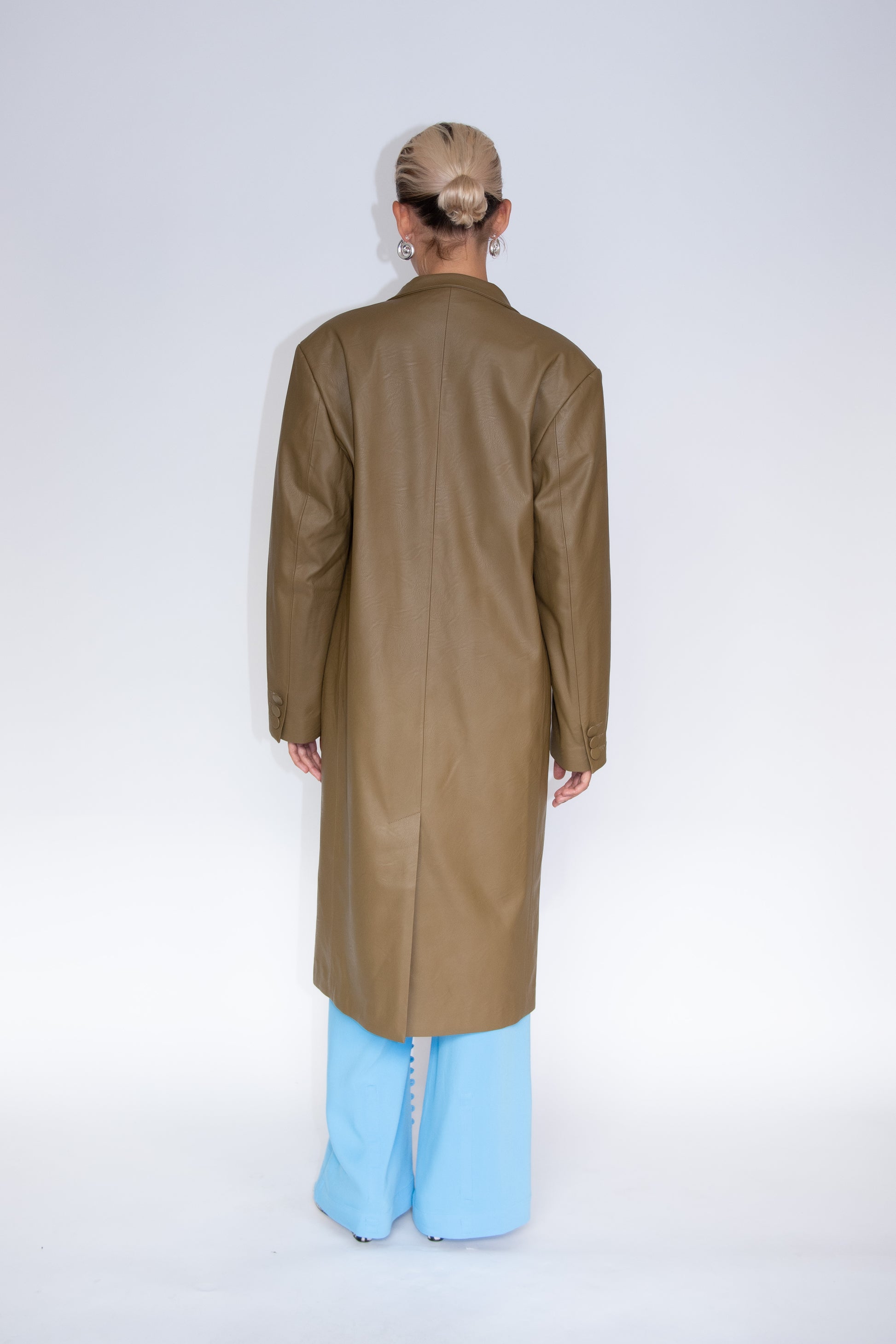 A longer version of our signature Harper Blazer in olive green faux nappa leather. Front welt pockets with flaps. Two fabric covered buttons at waist. Notch collar and peak lapels. Inner pocket. Fully lined.
