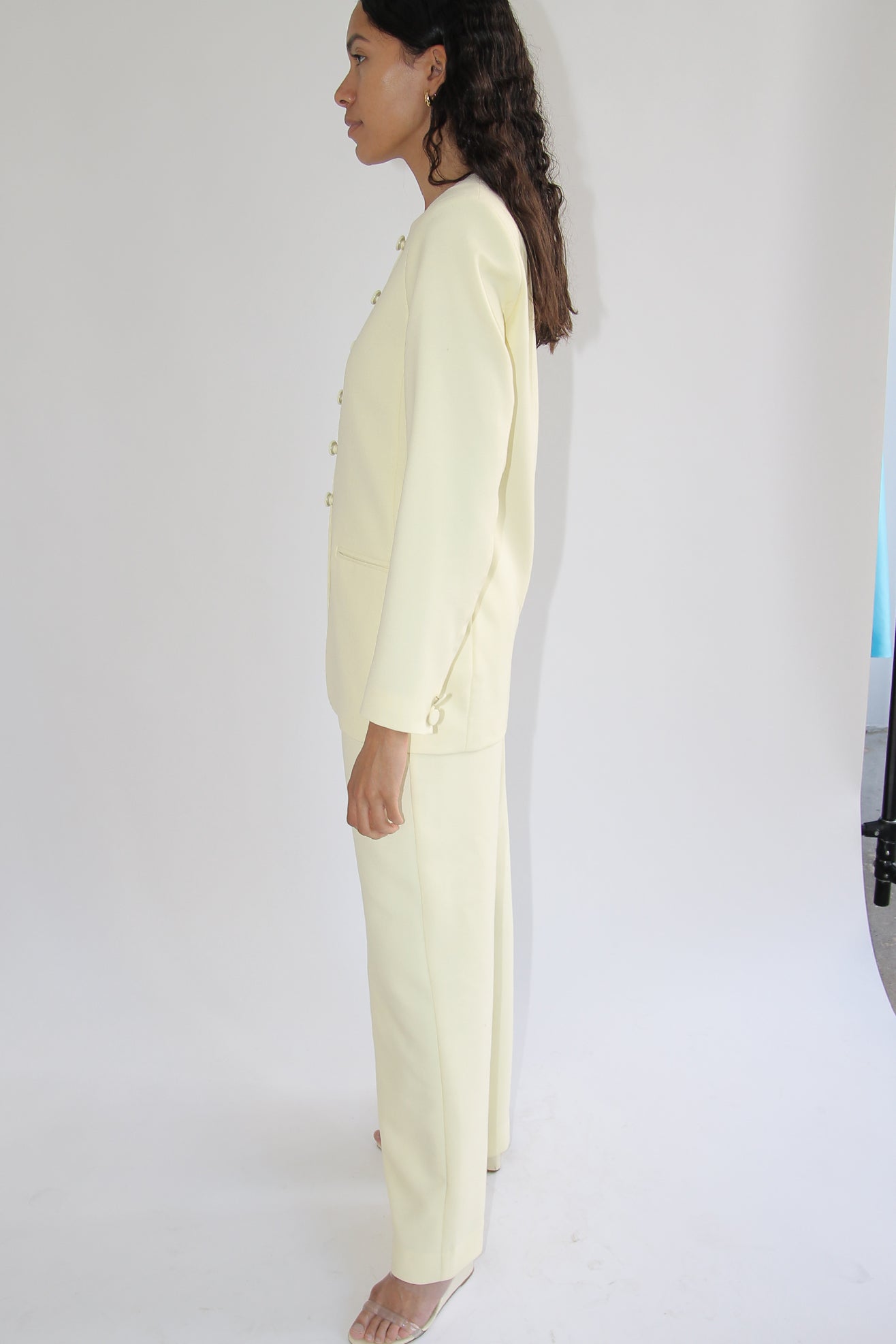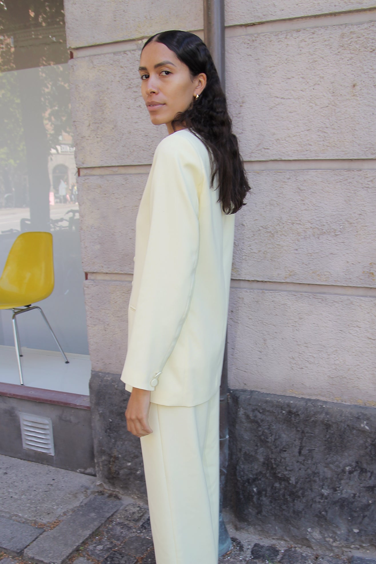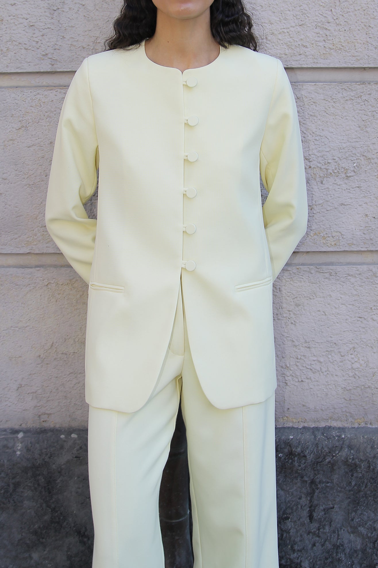 Collarless tailored blazer in butter yellow poly blend suiting from deadstock. Six fabric covered buttons with loop closure at front. Two double welt pockets at hip. Fully lined.