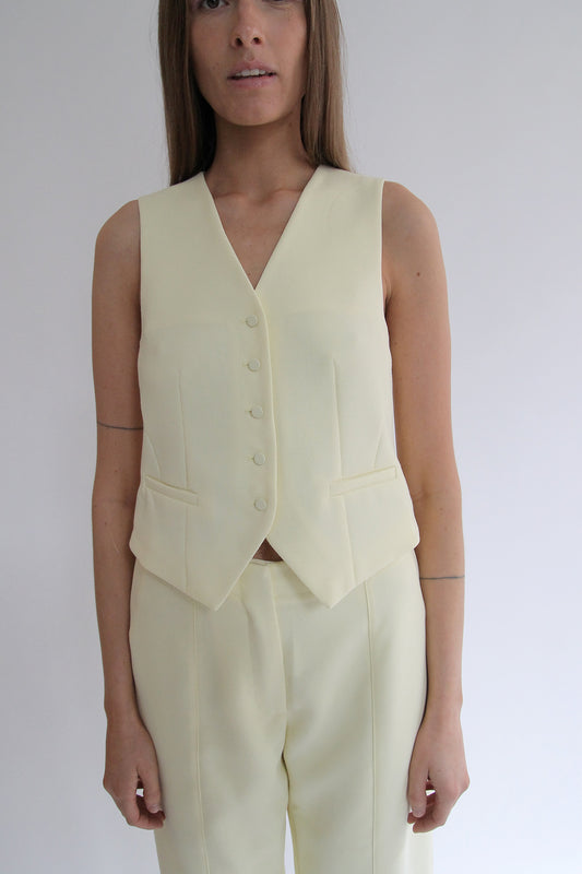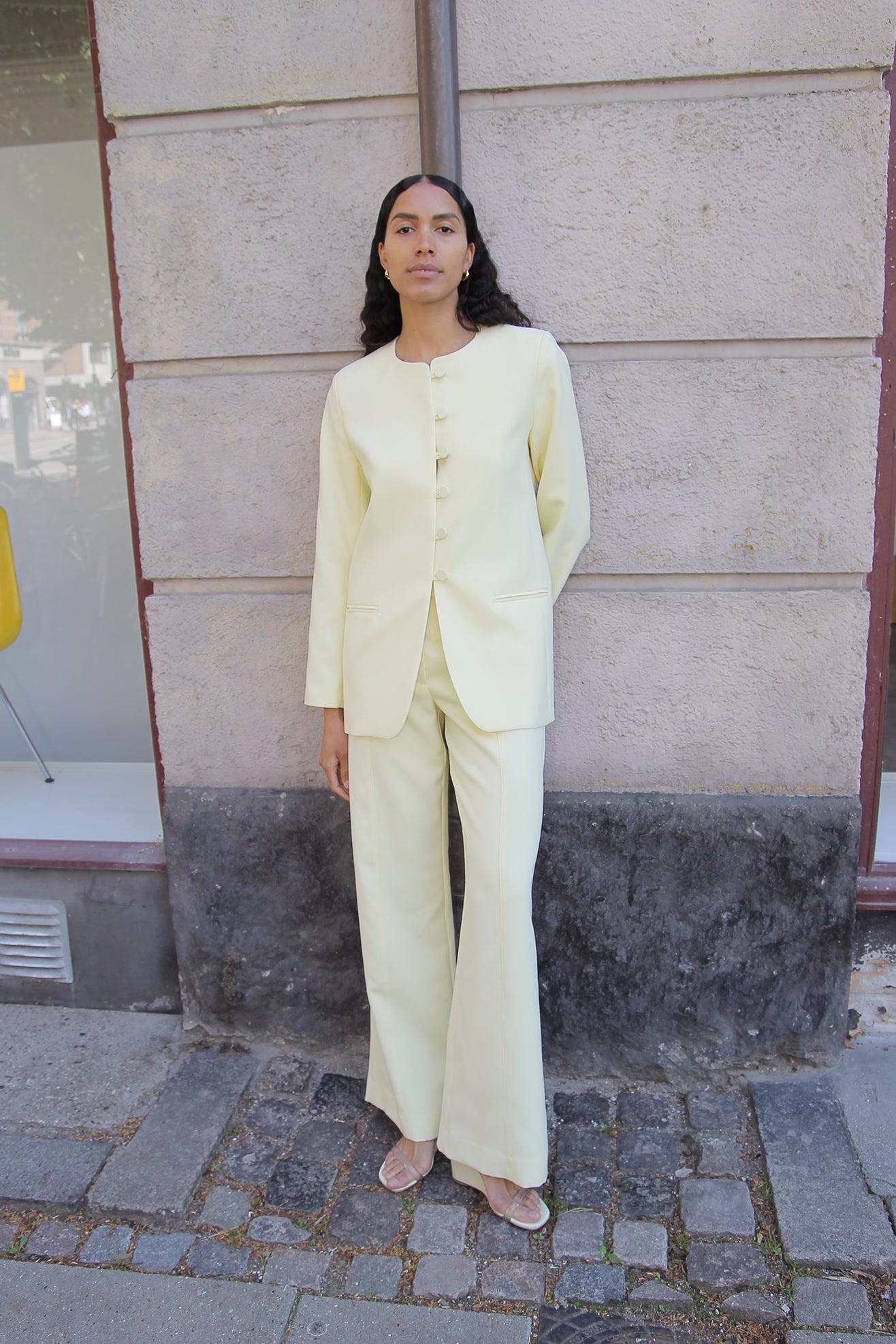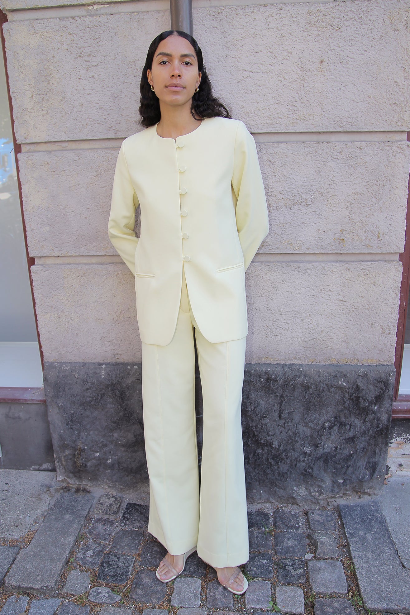 Collarless tailored blazer in butter yellow poly blend suiting from deadstock. Six fabric covered buttons with loop closure at front. Two double welt pockets at hip. Fully lined.