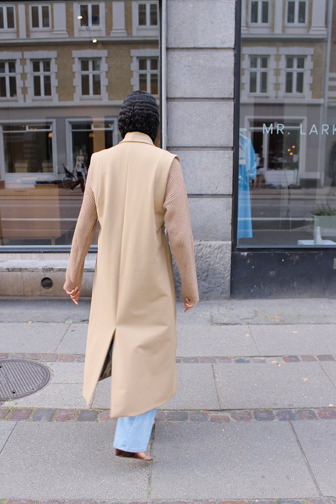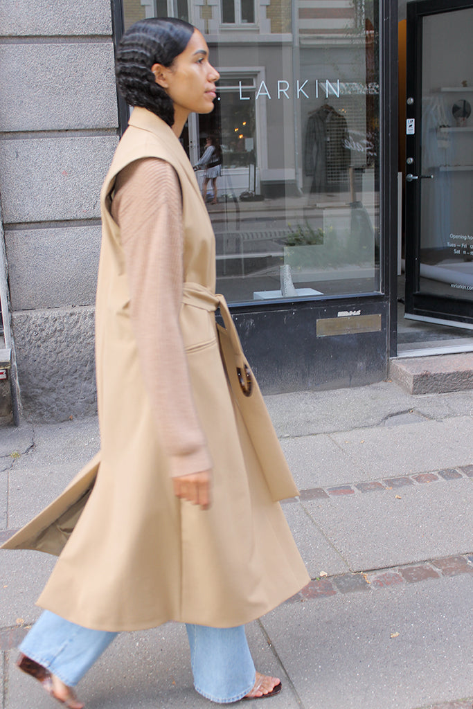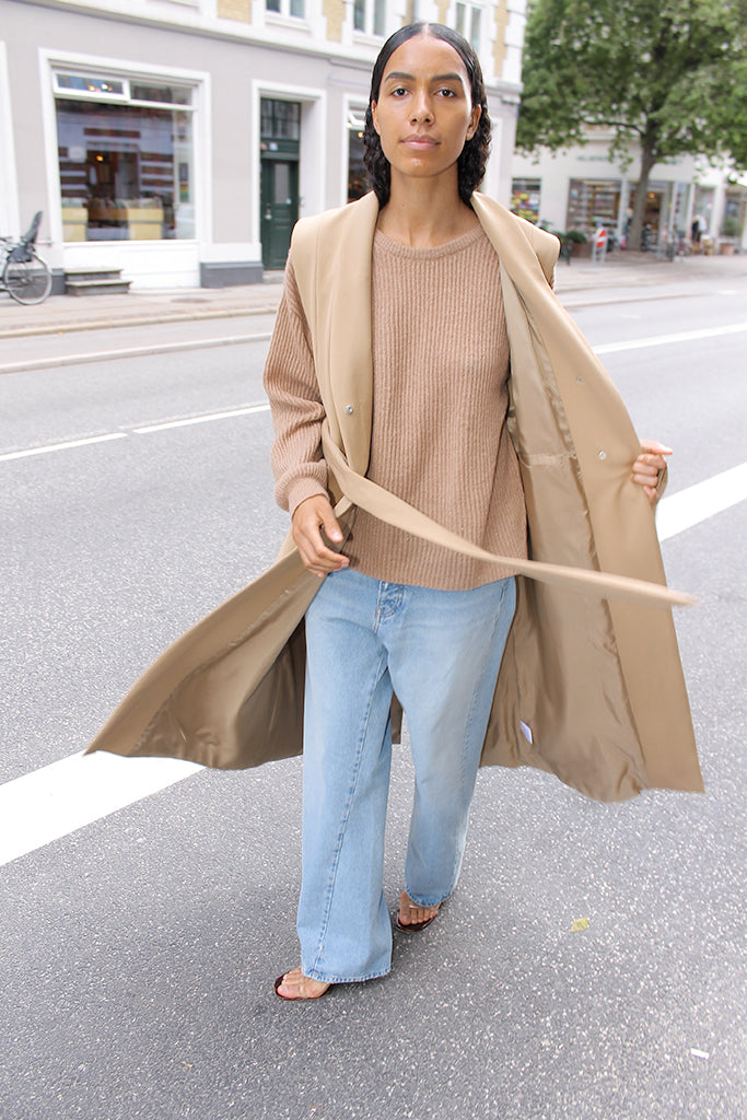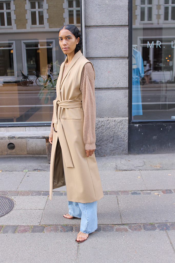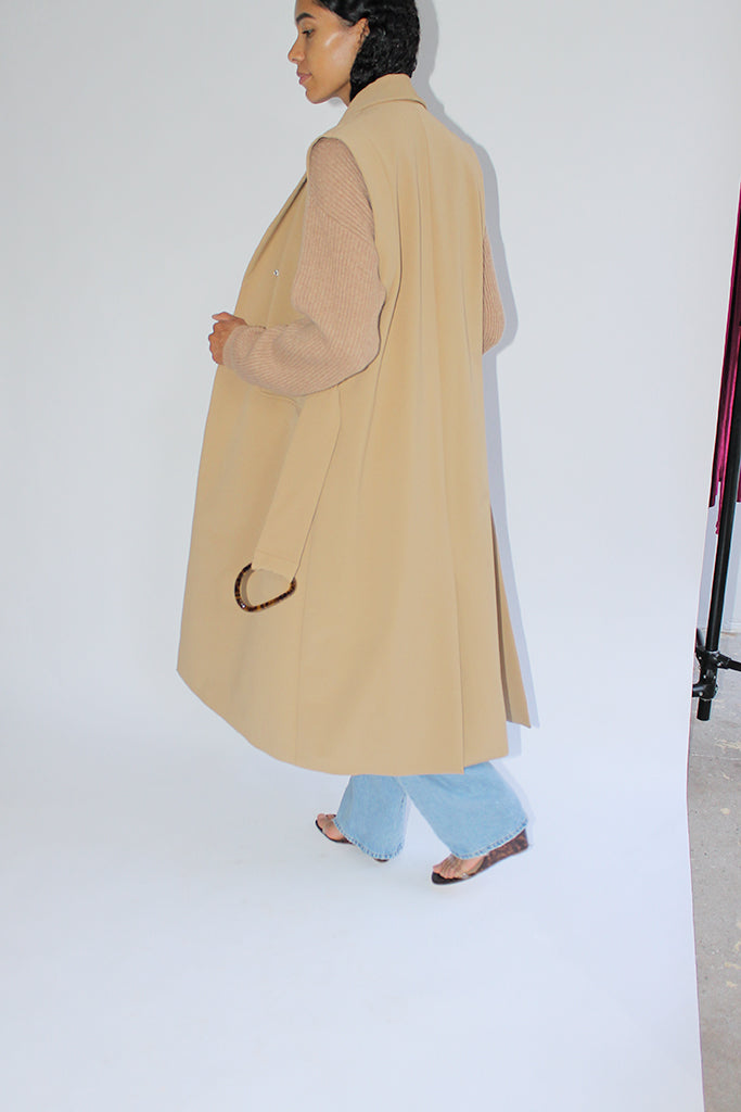 Michelle wears a size M, for a more oversized fit. Runs true to size. Hits at calf to ankle depending on height. Removable belt. an be worn as a jacket or dress.