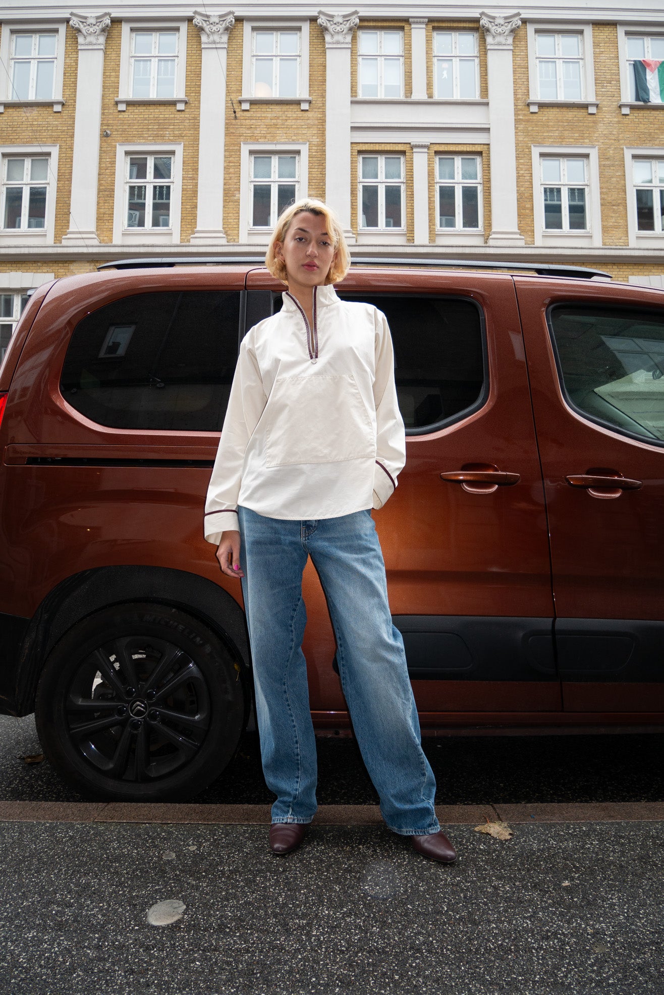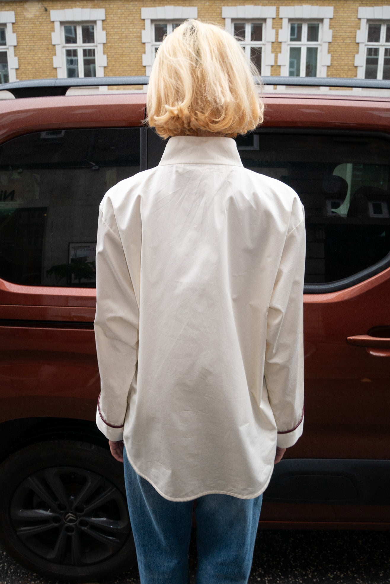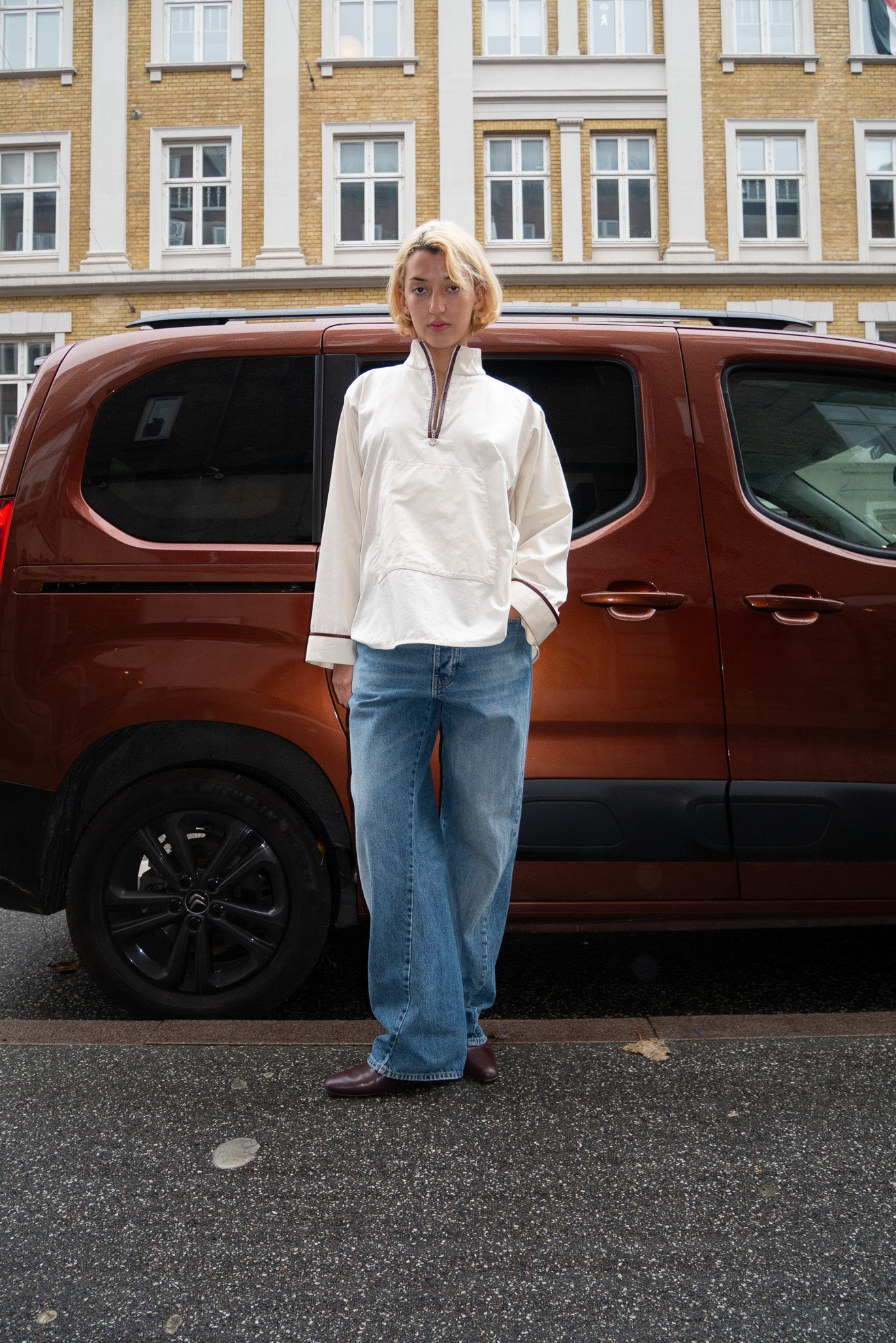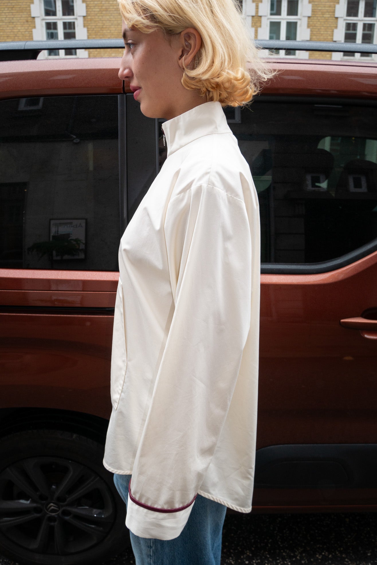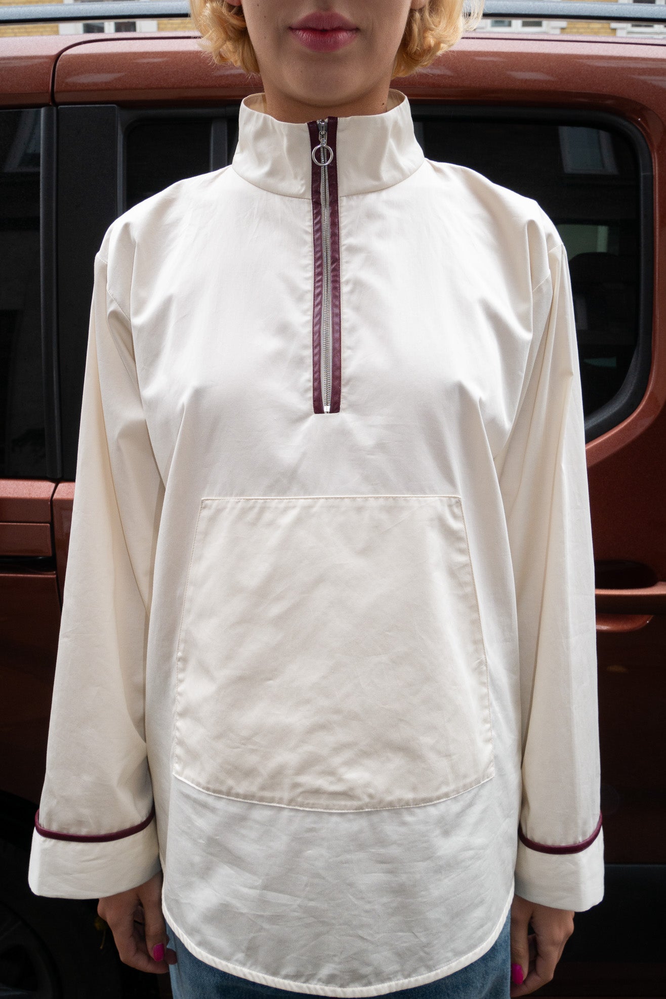 Boxy, anorak-inspired pullover with high neck in poplin off white cotton. Riri zipper in shiny silver at half-zip front placket. Burgundy faux leather trim detail Front kangaroo pocket with flap. Long wide sleeves.