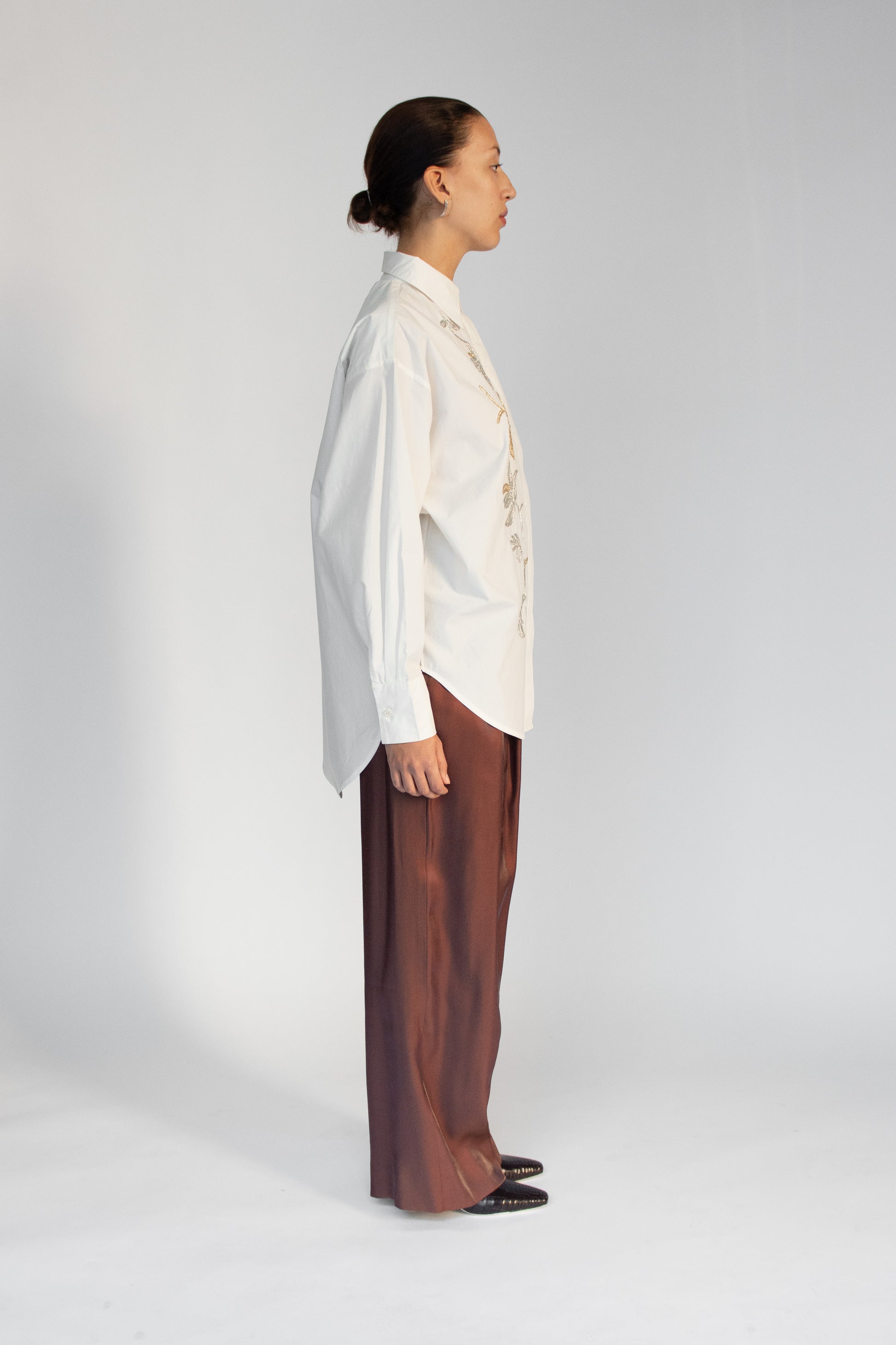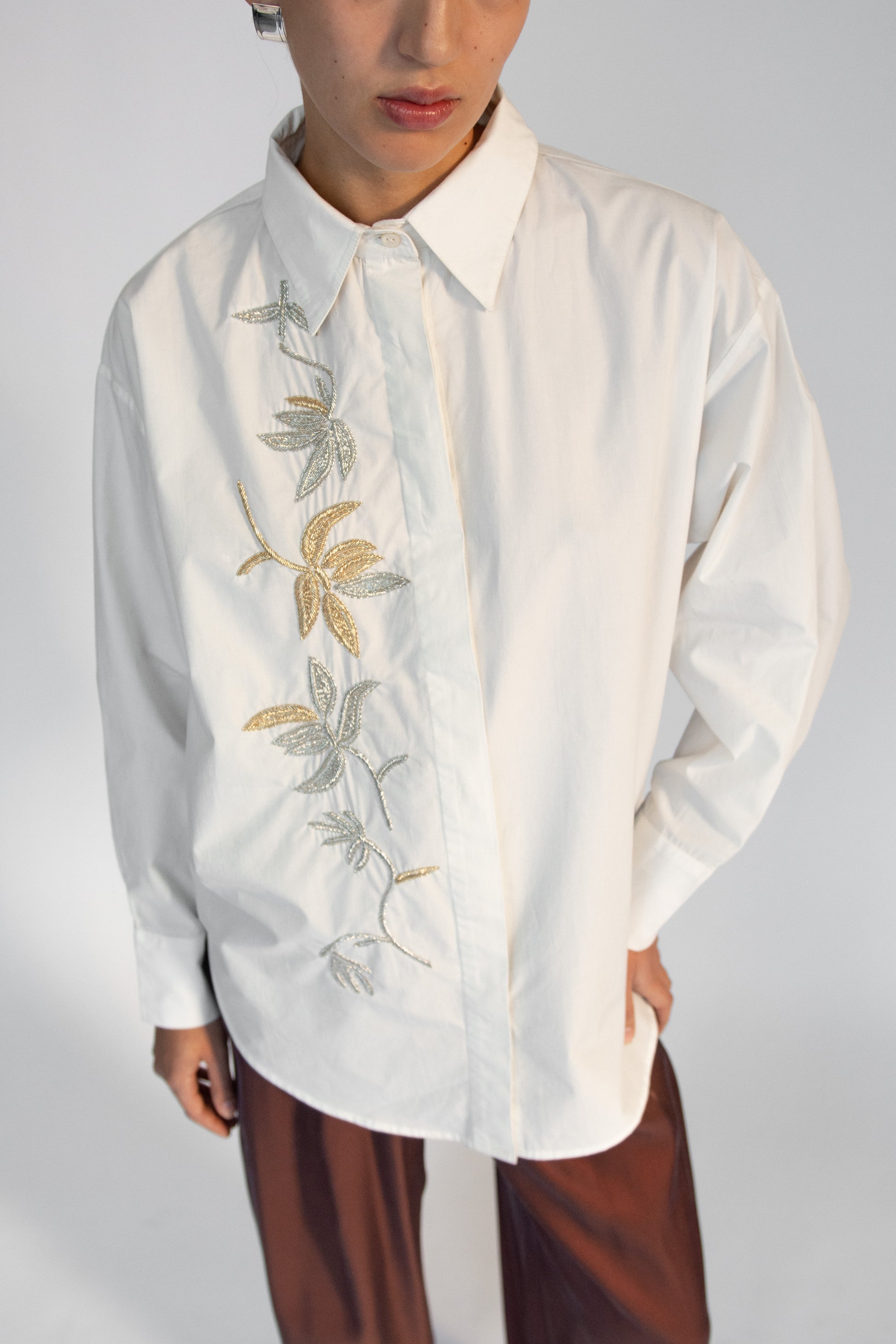 Menswear-inspired collared shirt in crisp BCI cotton poplin with tambour hooked hand embroidered floral design in silver and gold mylar threads along the front. Classic collar. Hidden front placket with button front. Curved hem. Buttoned cuffs.