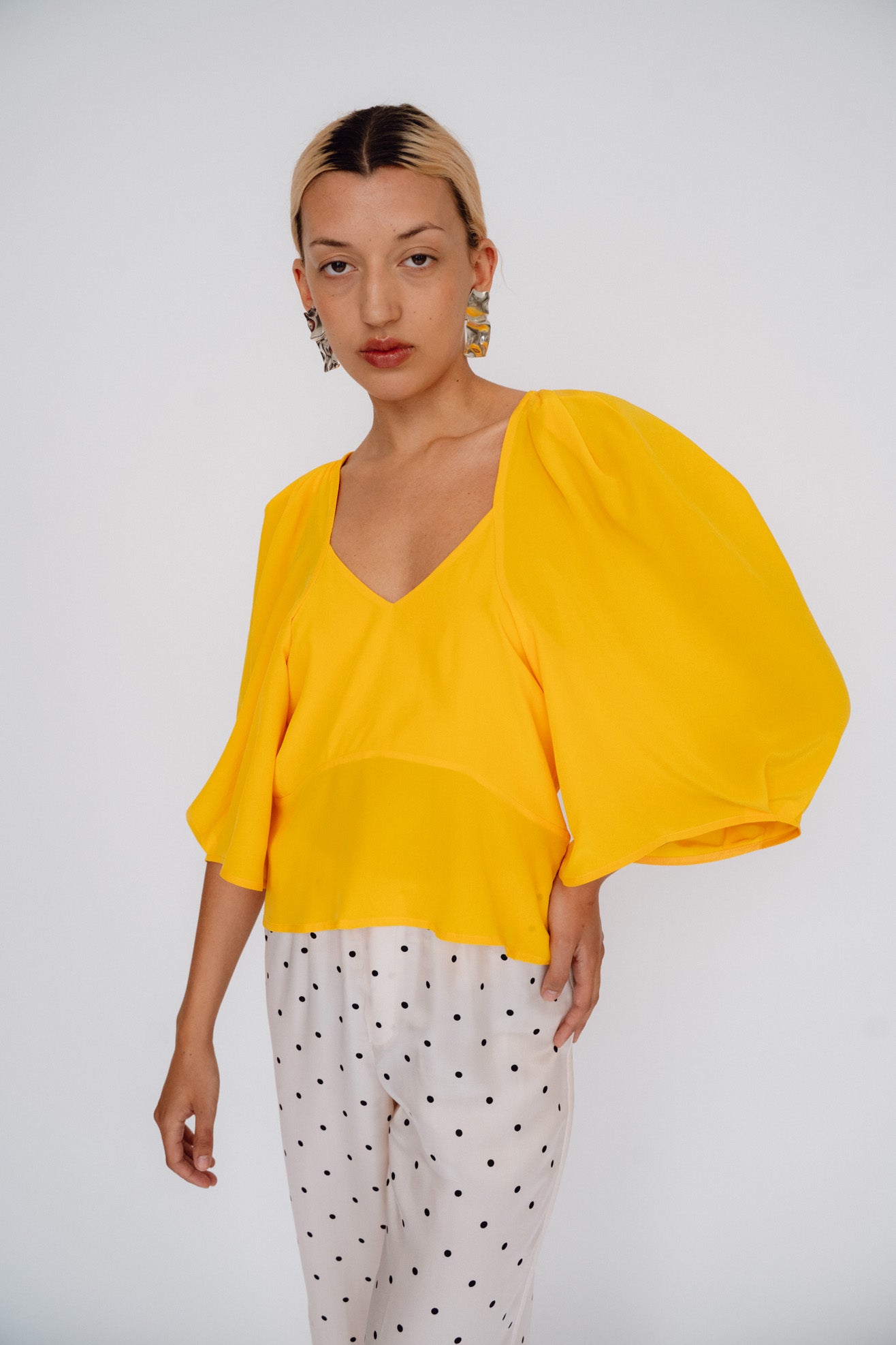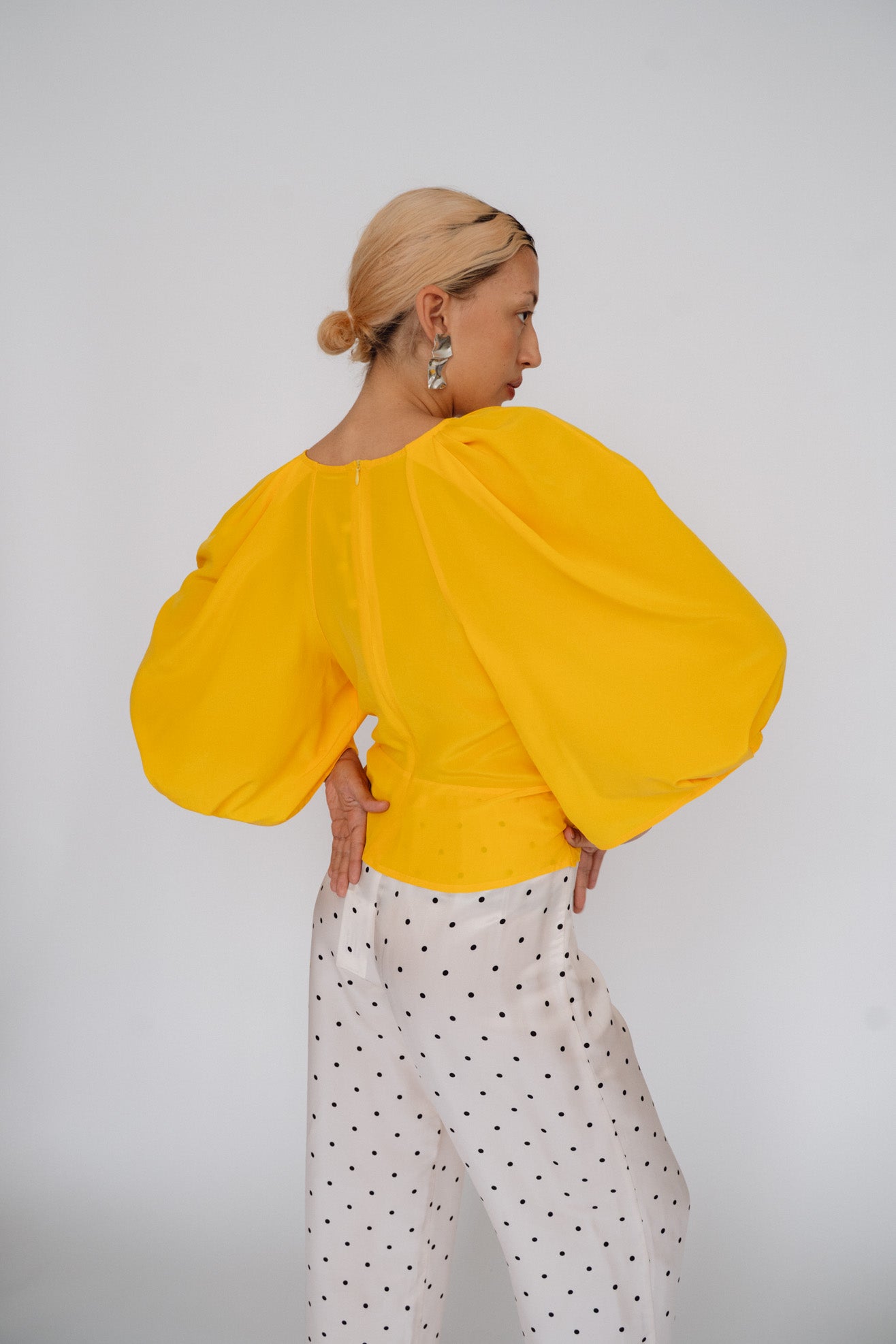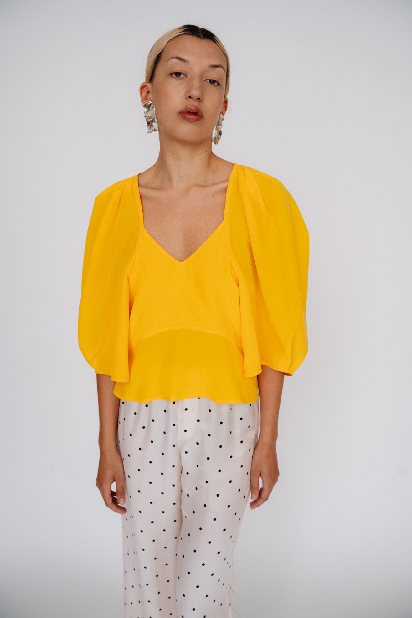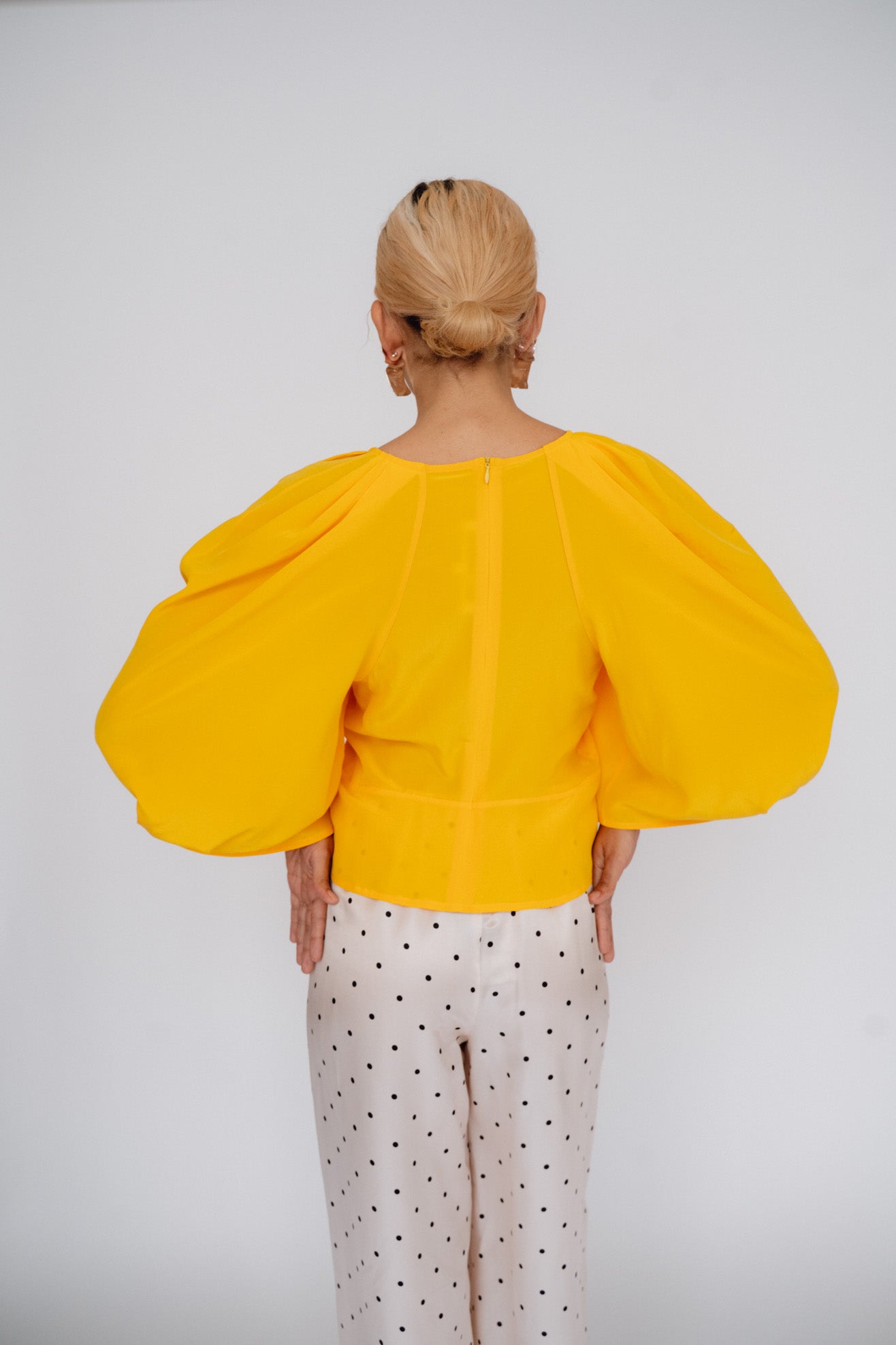 Sculptural top with exaggerated round sleeves. Made in a bright citrus orange 100% washed silk. V neck. Center back invisible zipper. Unlined so slightly sheer.