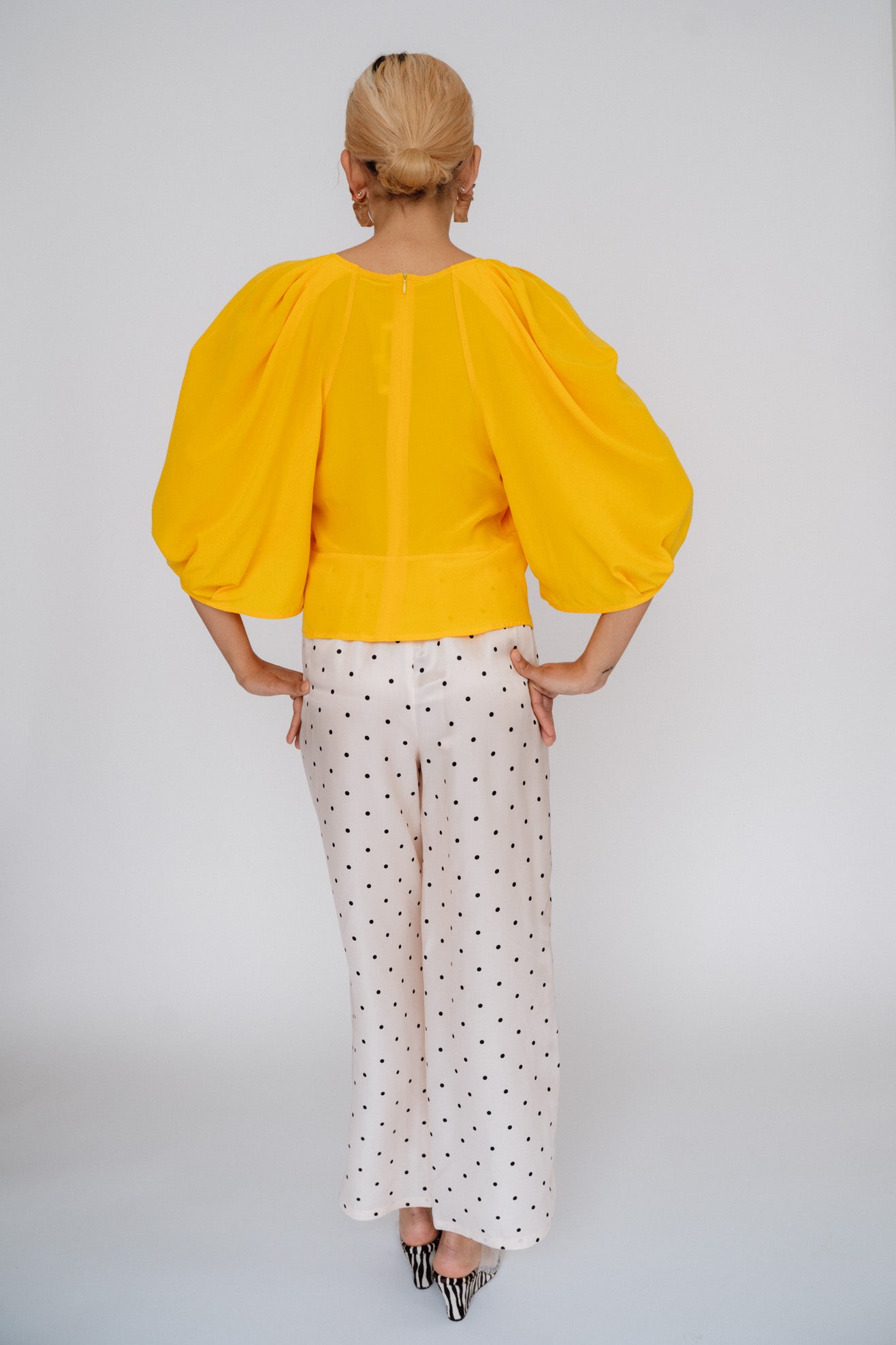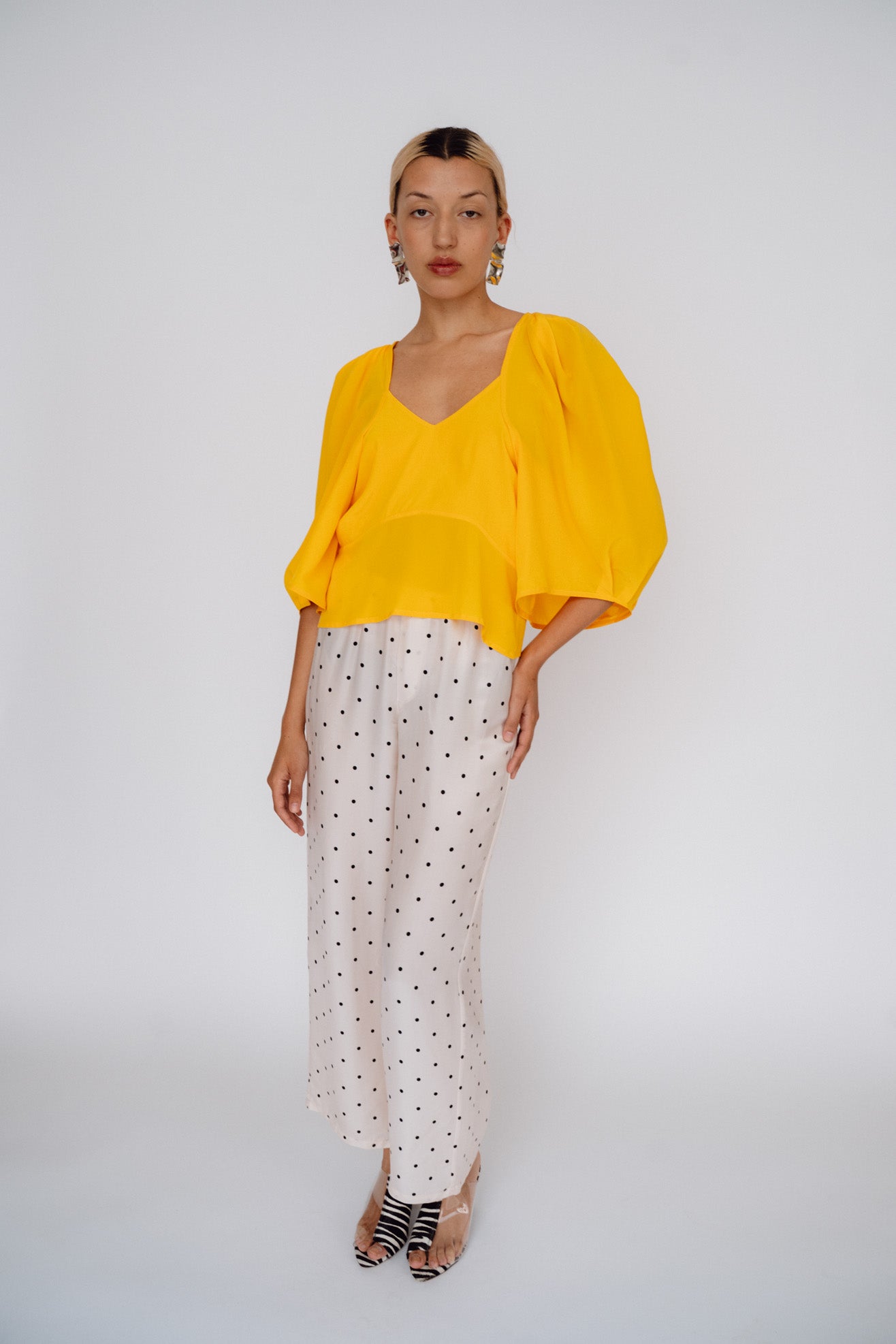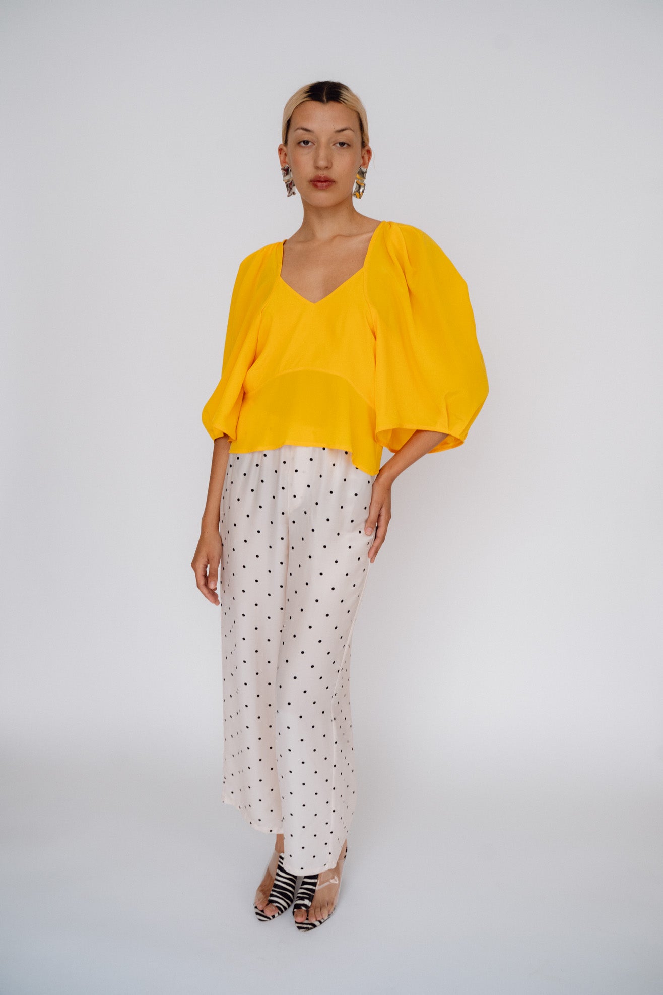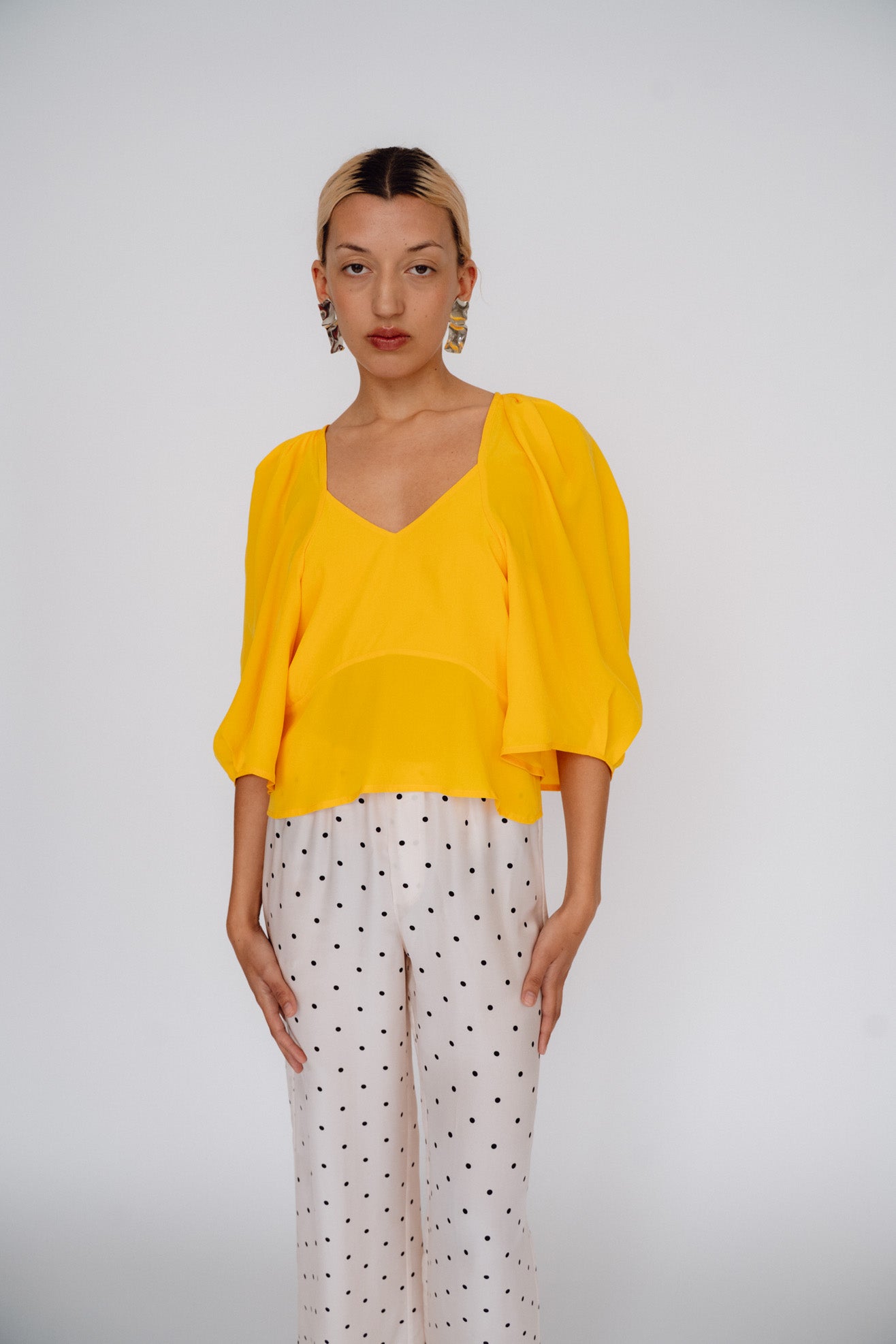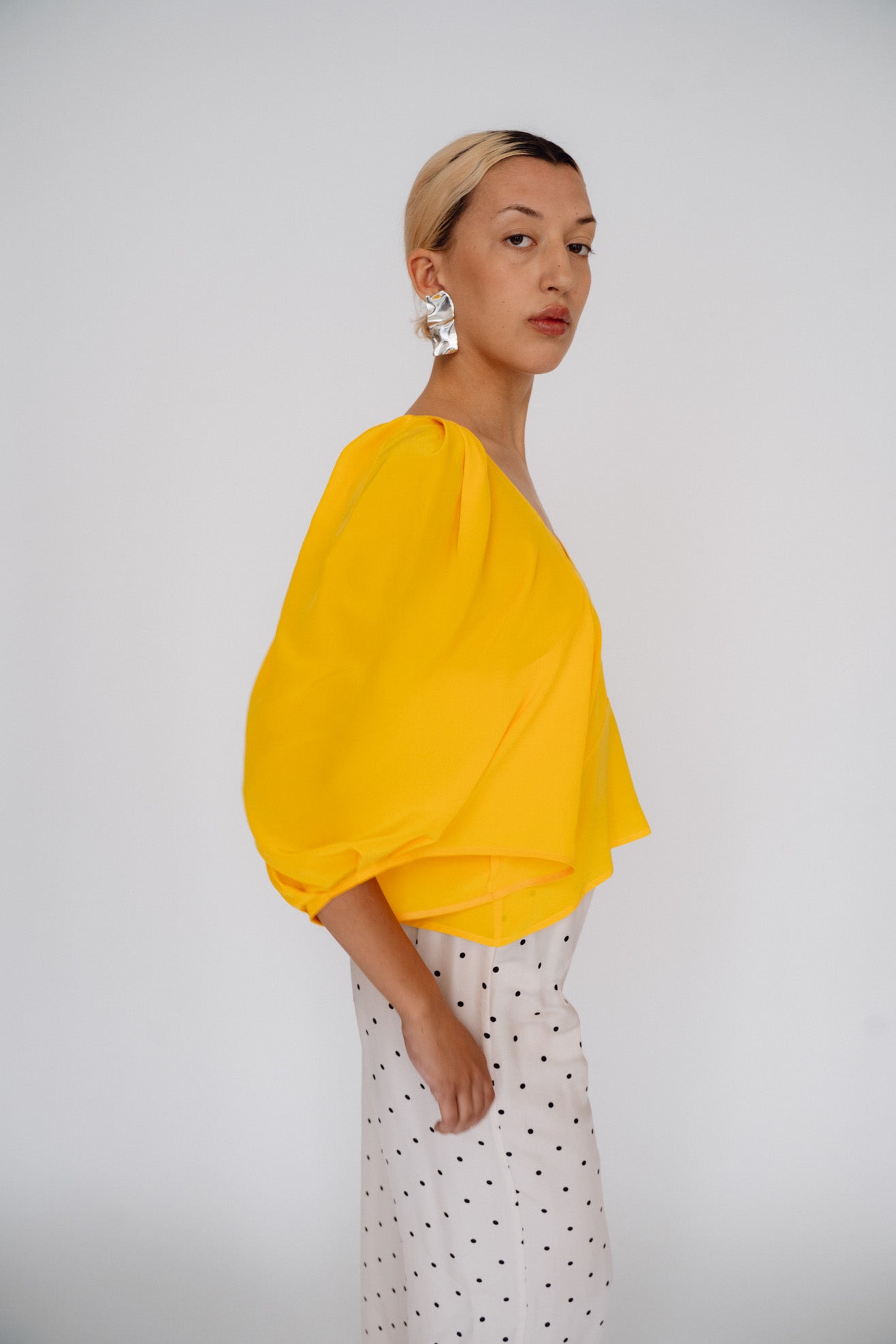 Sculptural top with exaggerated round sleeves. Made in a bright citrus orange 100% washed silk. V neck. Center back invisible zipper. Unlined so slightly sheer.