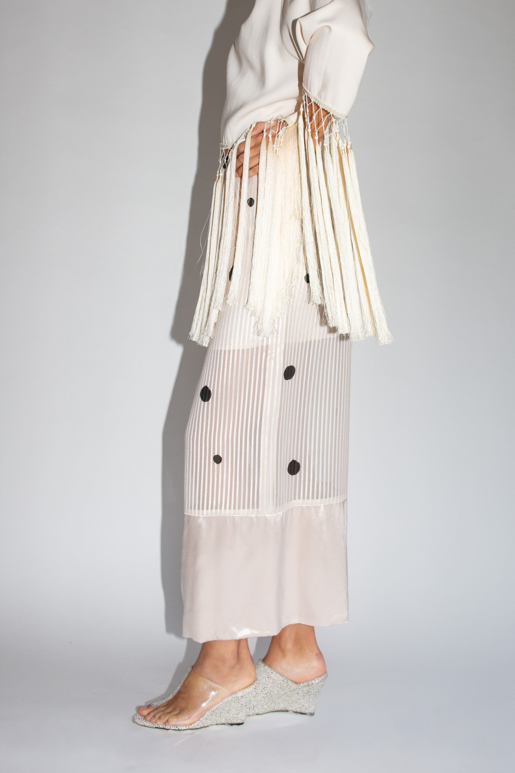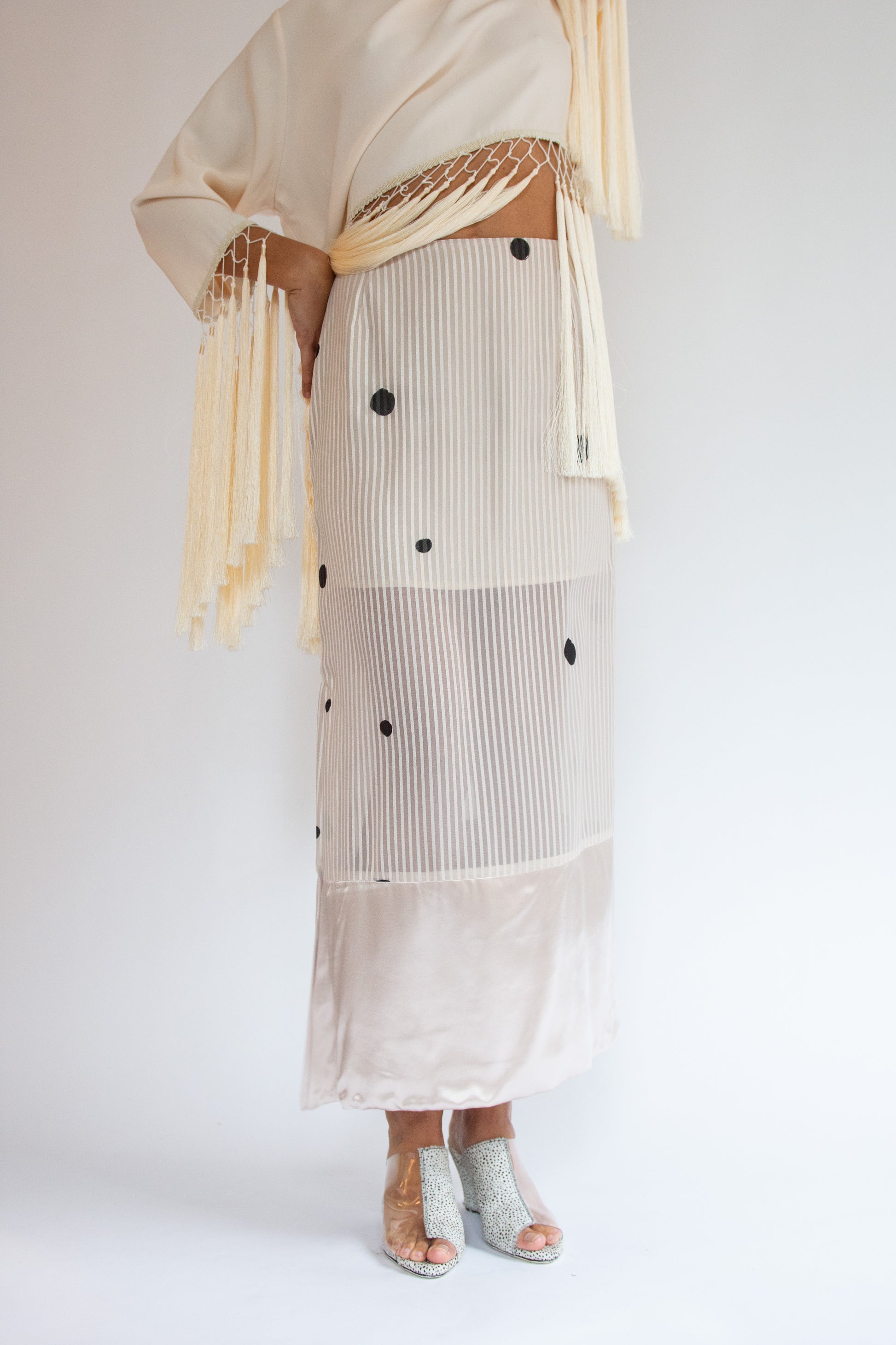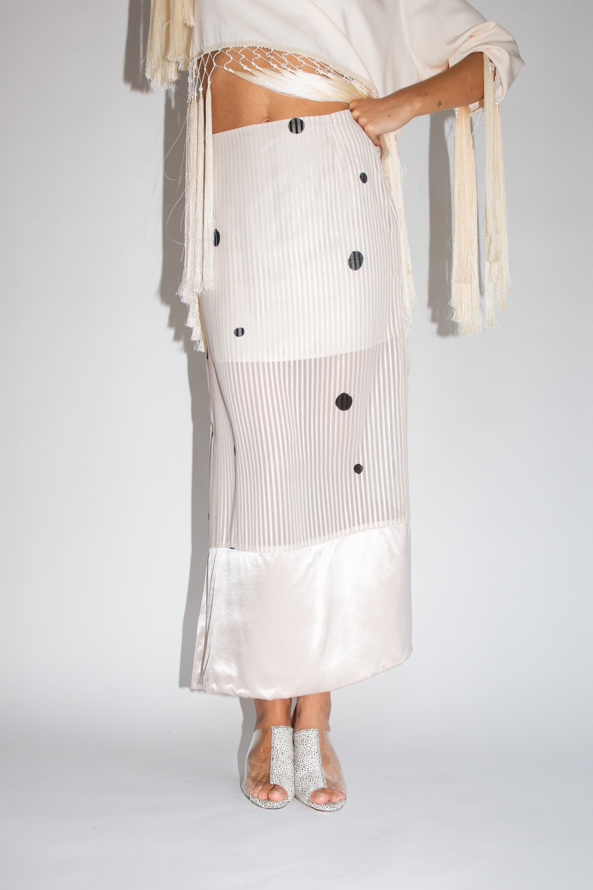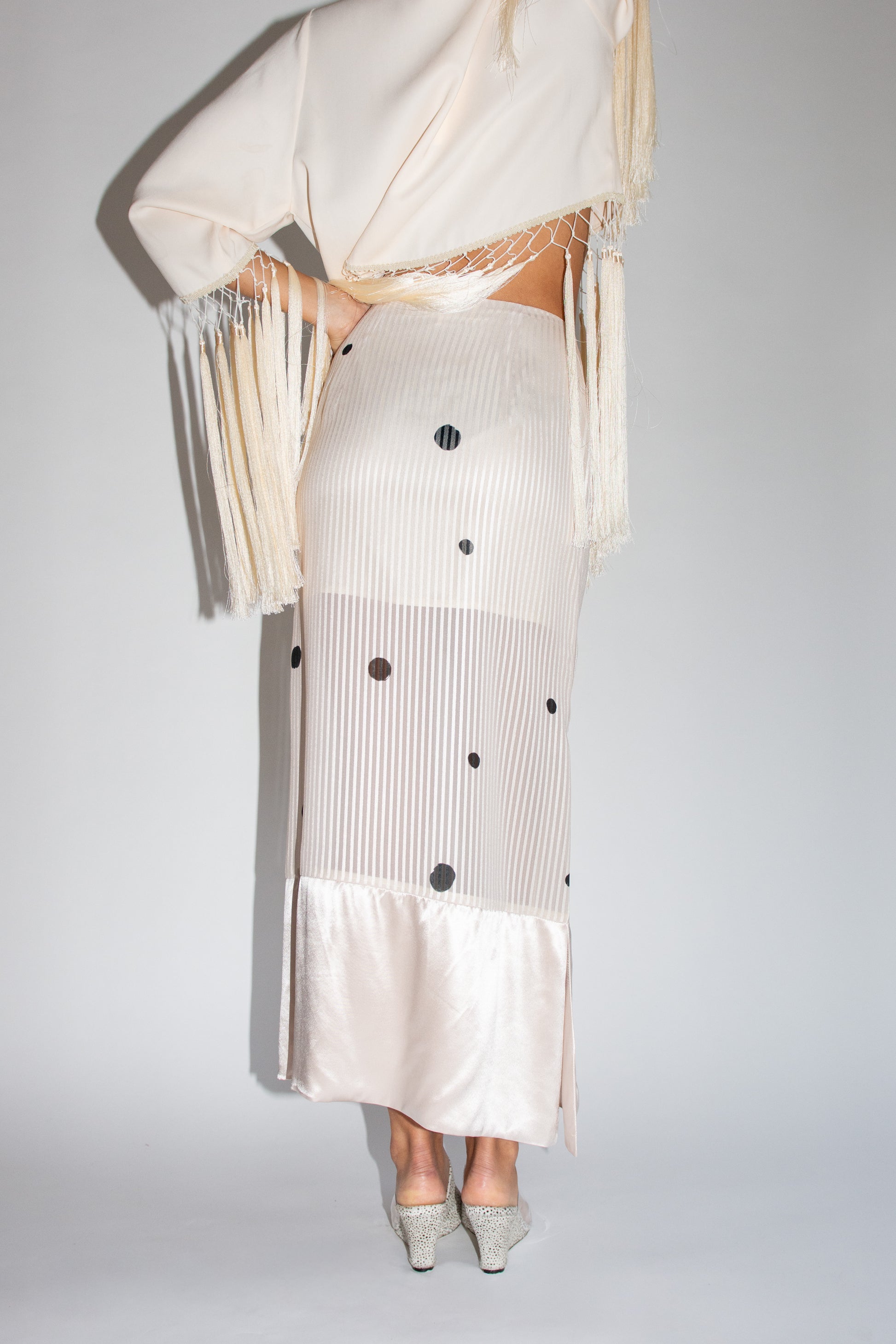 Maxi length straight skirt in our space dot printed burnout stripe organza with contrast satin hem. Partially lined. Side seam invisible zipper closure.