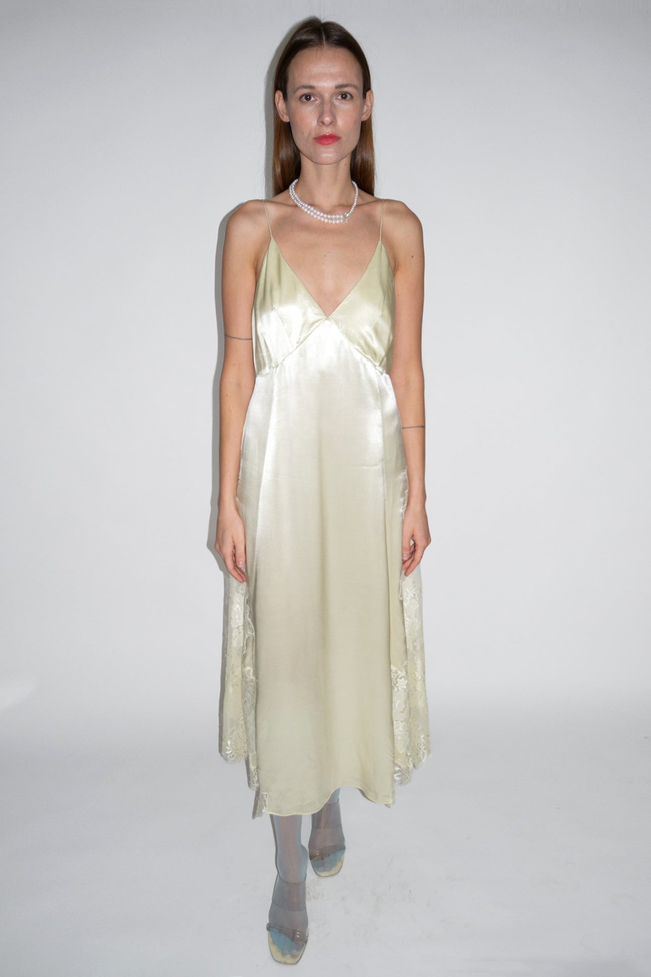 Slip-inspired dress in elderflower viscose satin with high side lace insets. Deep V neck with delicate adjustable spaghetti straps with rhinestone finish. Full skirt. Lined in bodice, but unlined in skirt so lace inset is slightly sheer. Slips on over head to be worn. Fabric covered button with keyhole closure at back.