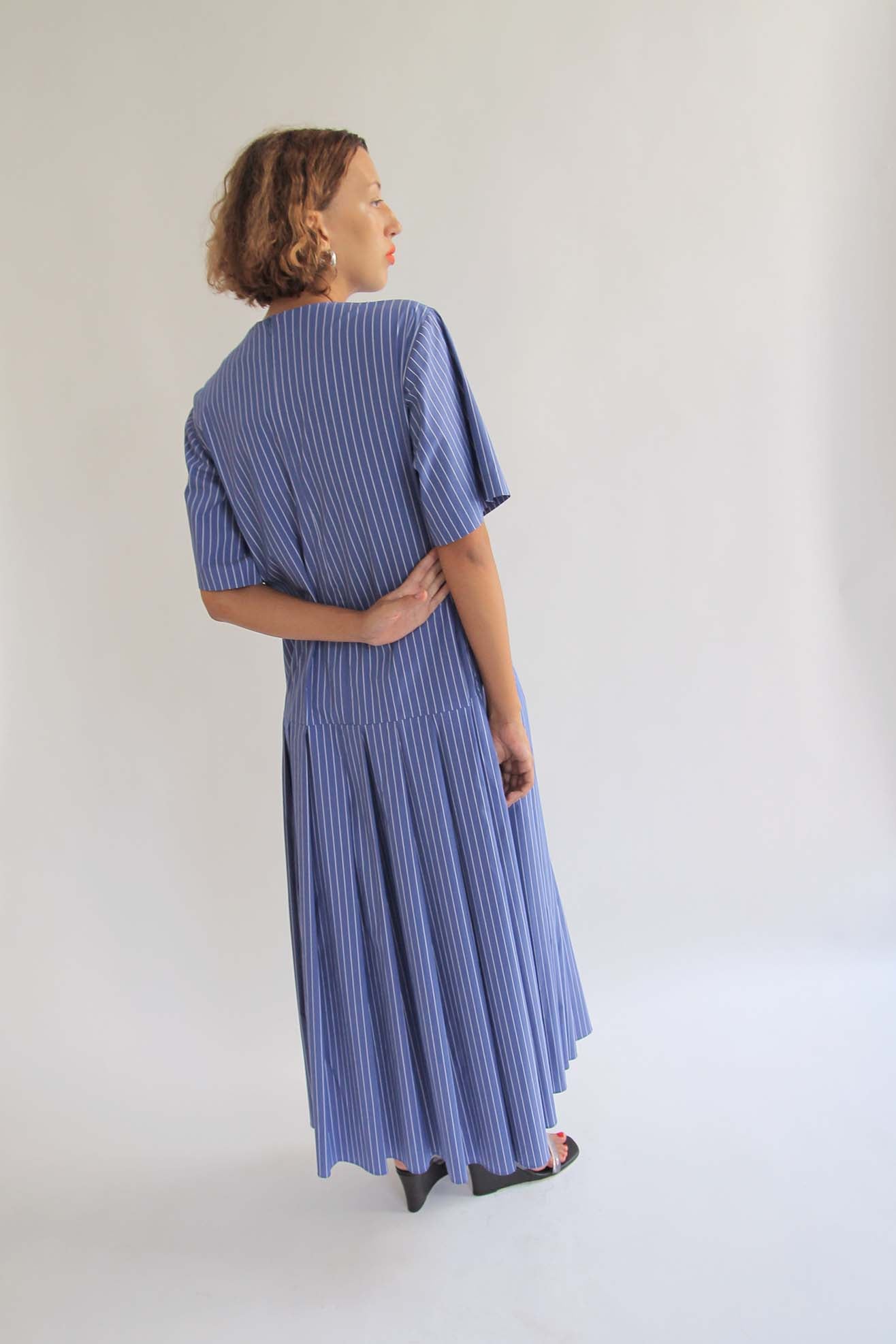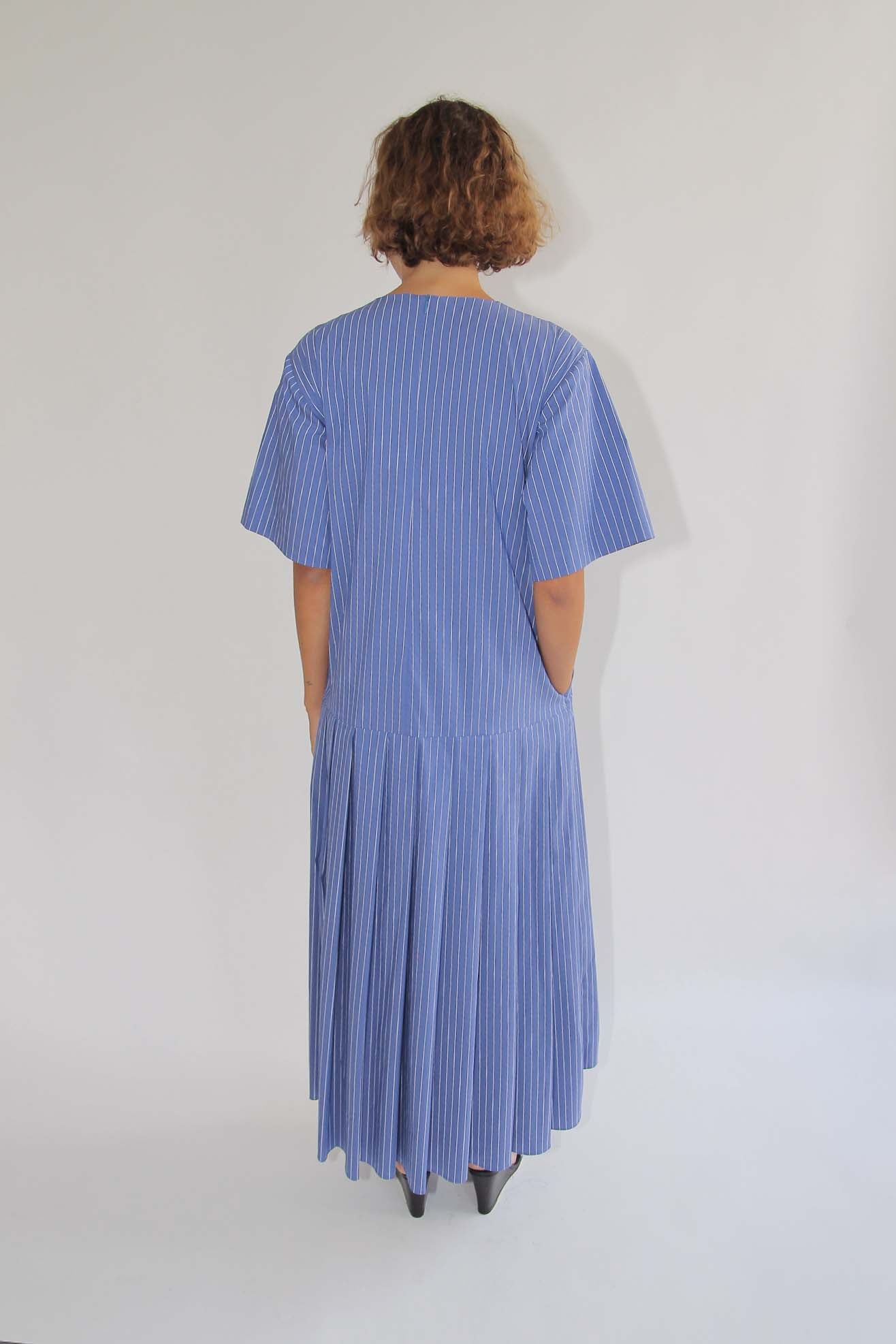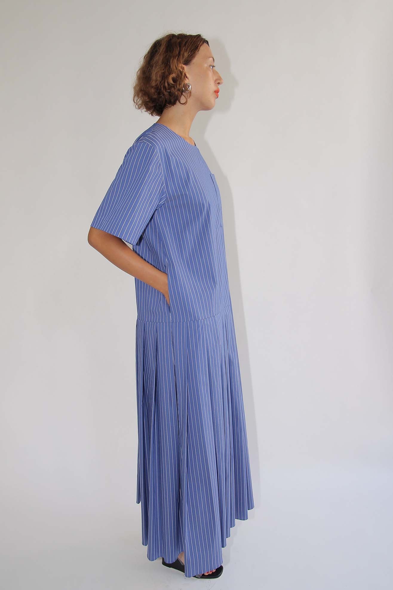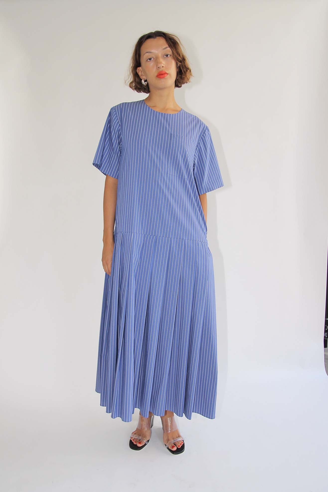 Shortsleeved maxi dress in pinstriped cobalt blue poplin. Front pocket. Full pleated skirt. Slips on overhead to be worn.