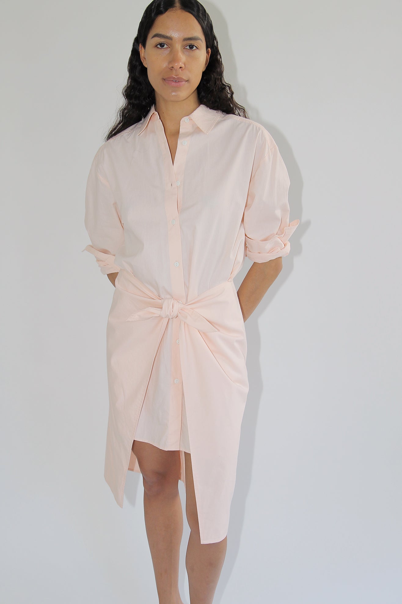 Cotton shirt dress with waist wrap detail. Long sleeved. Classic shirt collar. Matte white buttons. Adjustable wrap detail. Unlined.