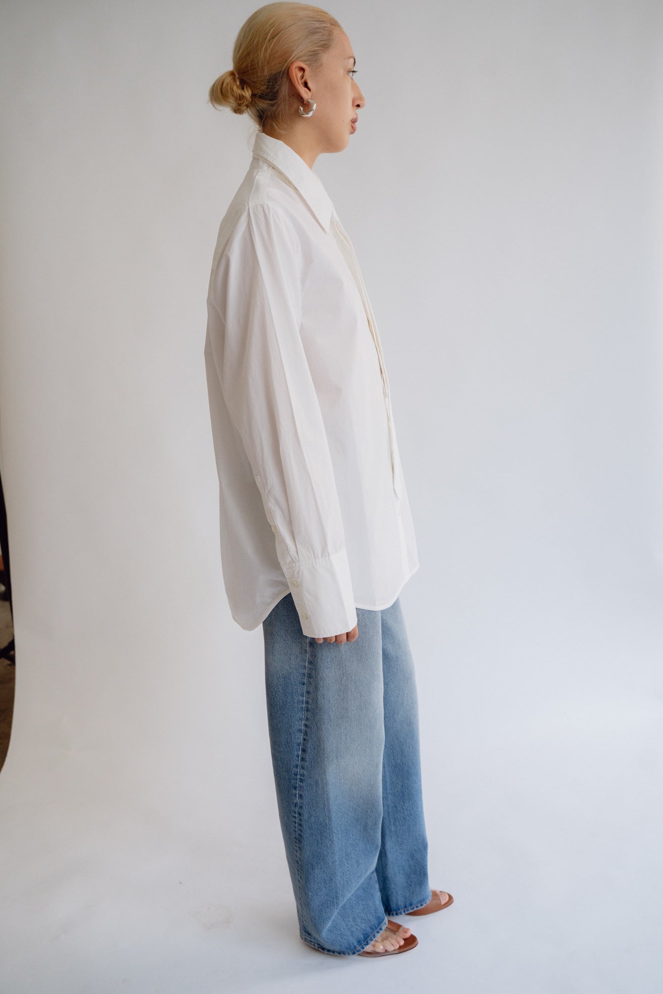 Long collared shirt in off white poplin from BCI cotton. Shirt collar with removable tie. Full length, cuffed sleeves. MOP buttons with logo. Embroidered ML logo at hem.