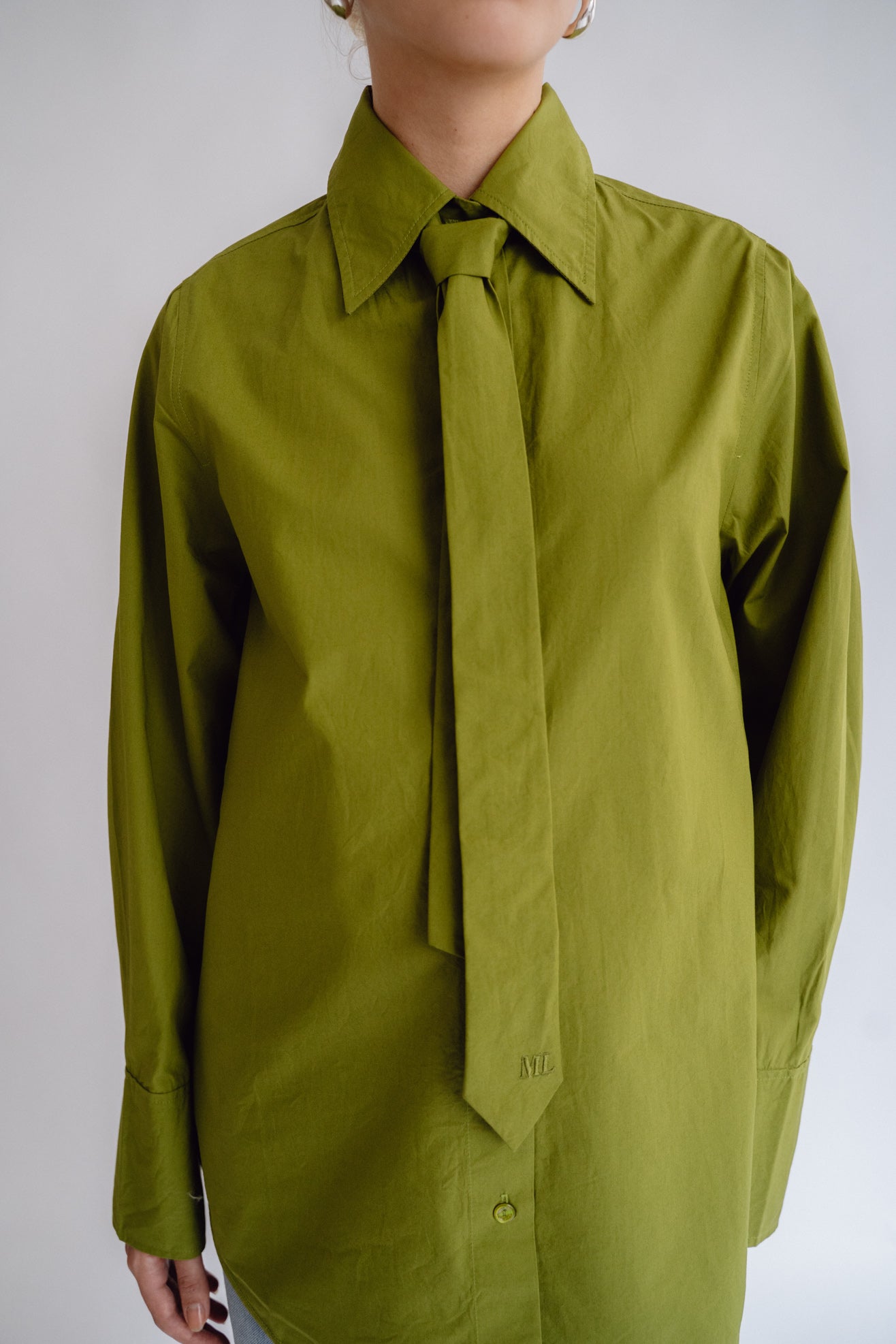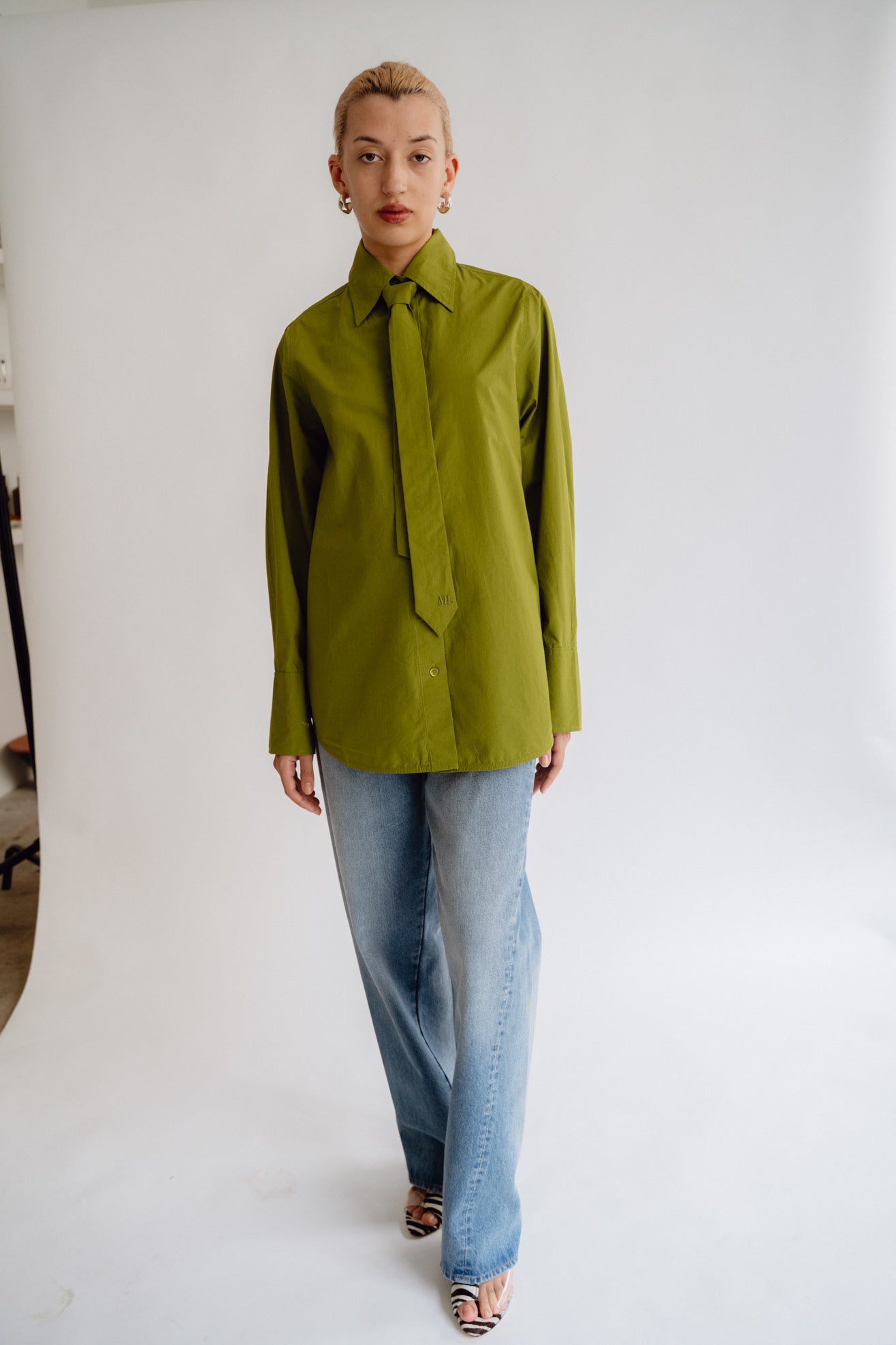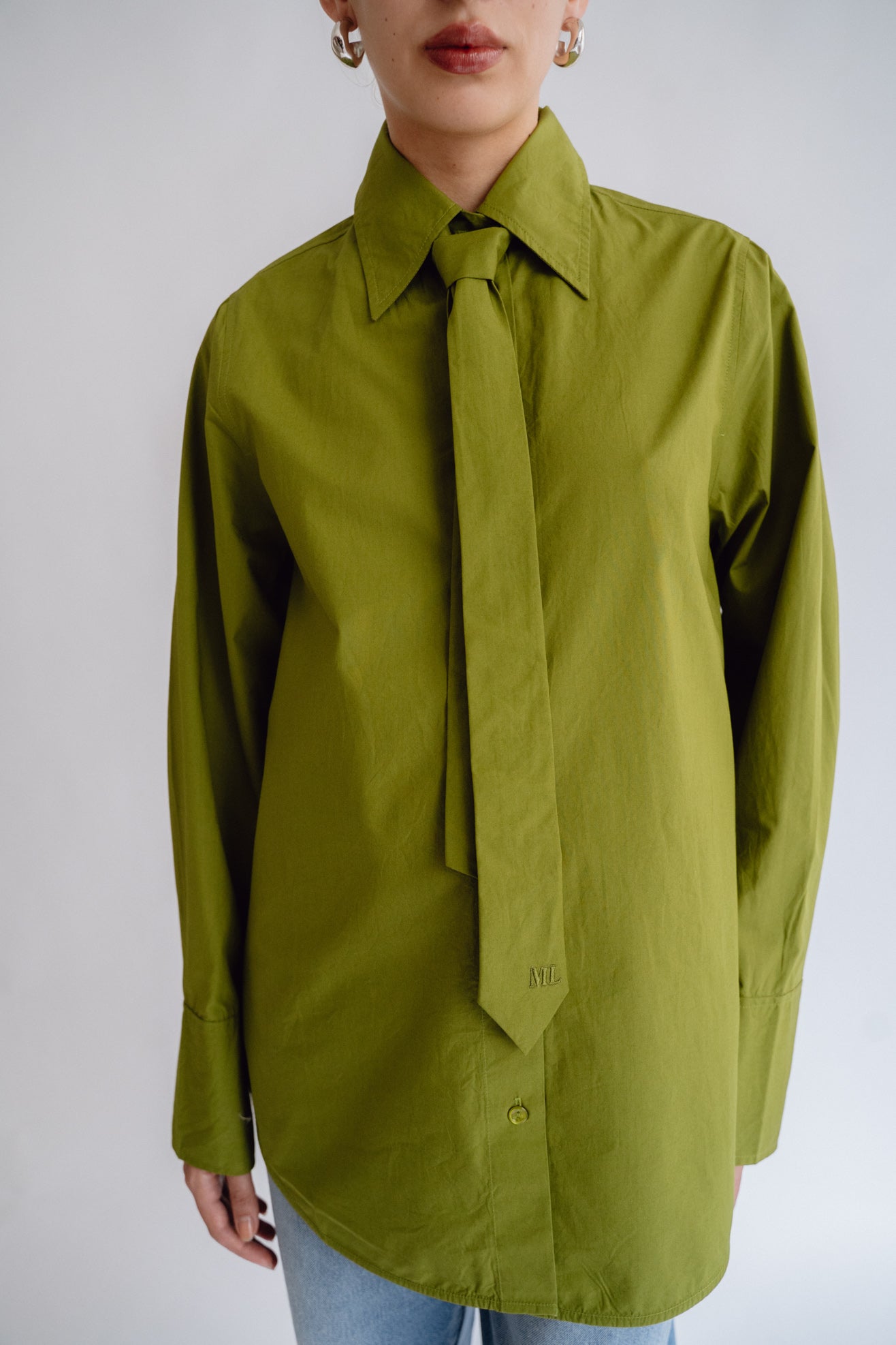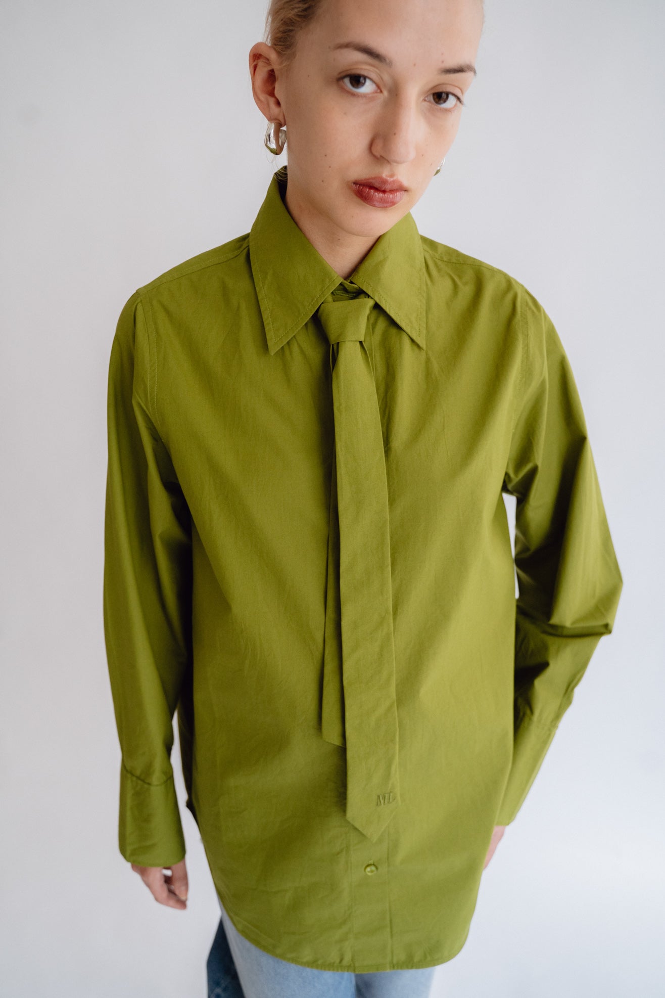 Long collared shirt in olive green poplin from BCI cotton. Shirt collar with removable tie. Full length, cuffed sleeves. MOP buttons with logo. Embroidered ML logo at hem.
