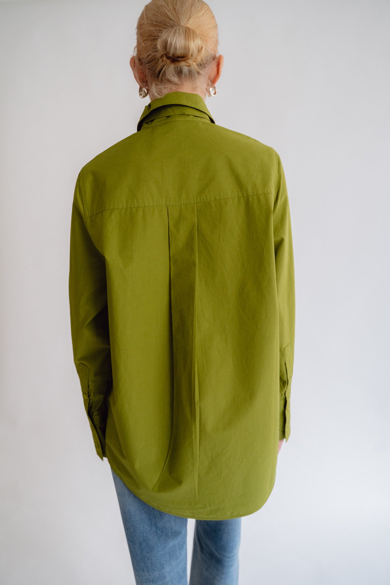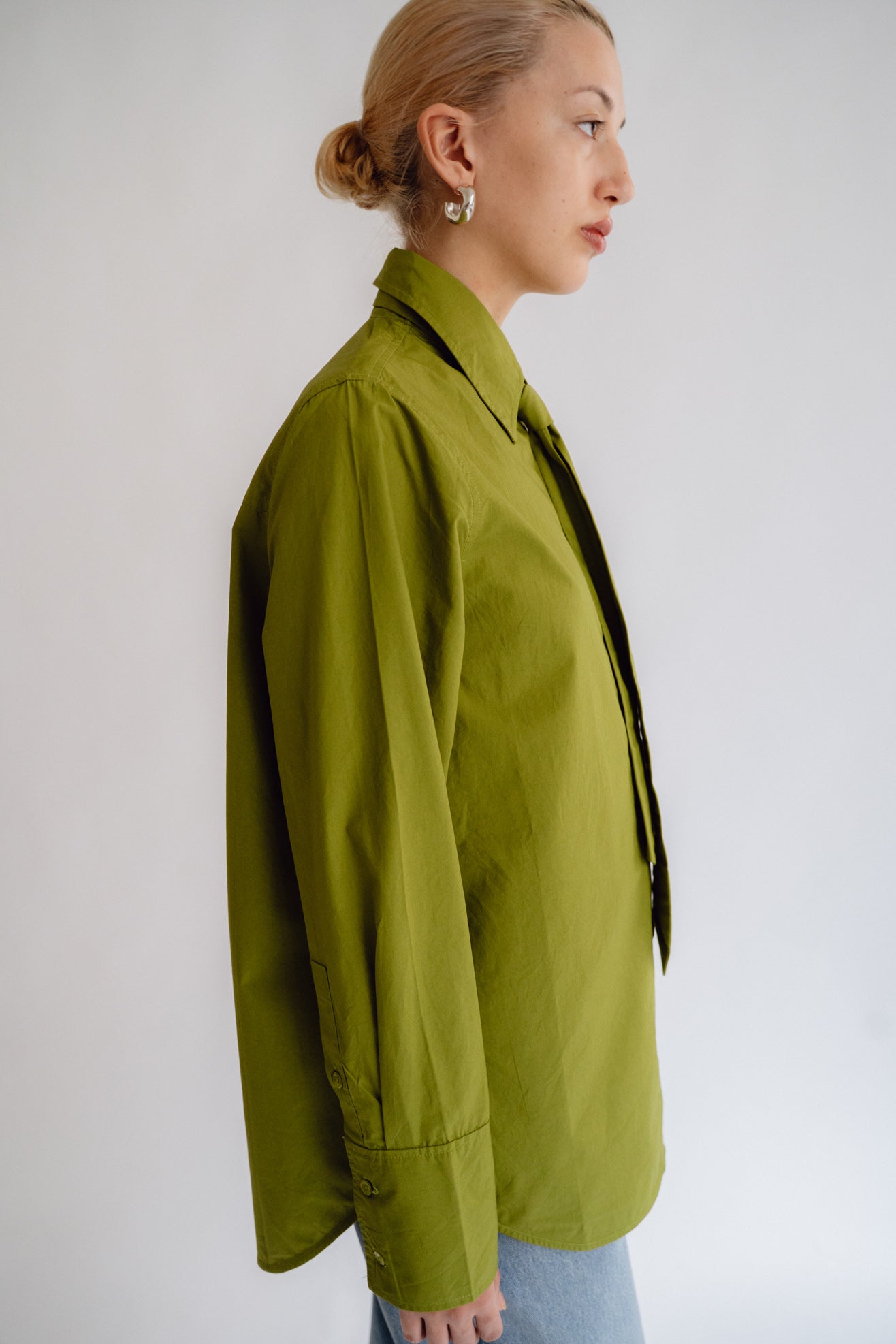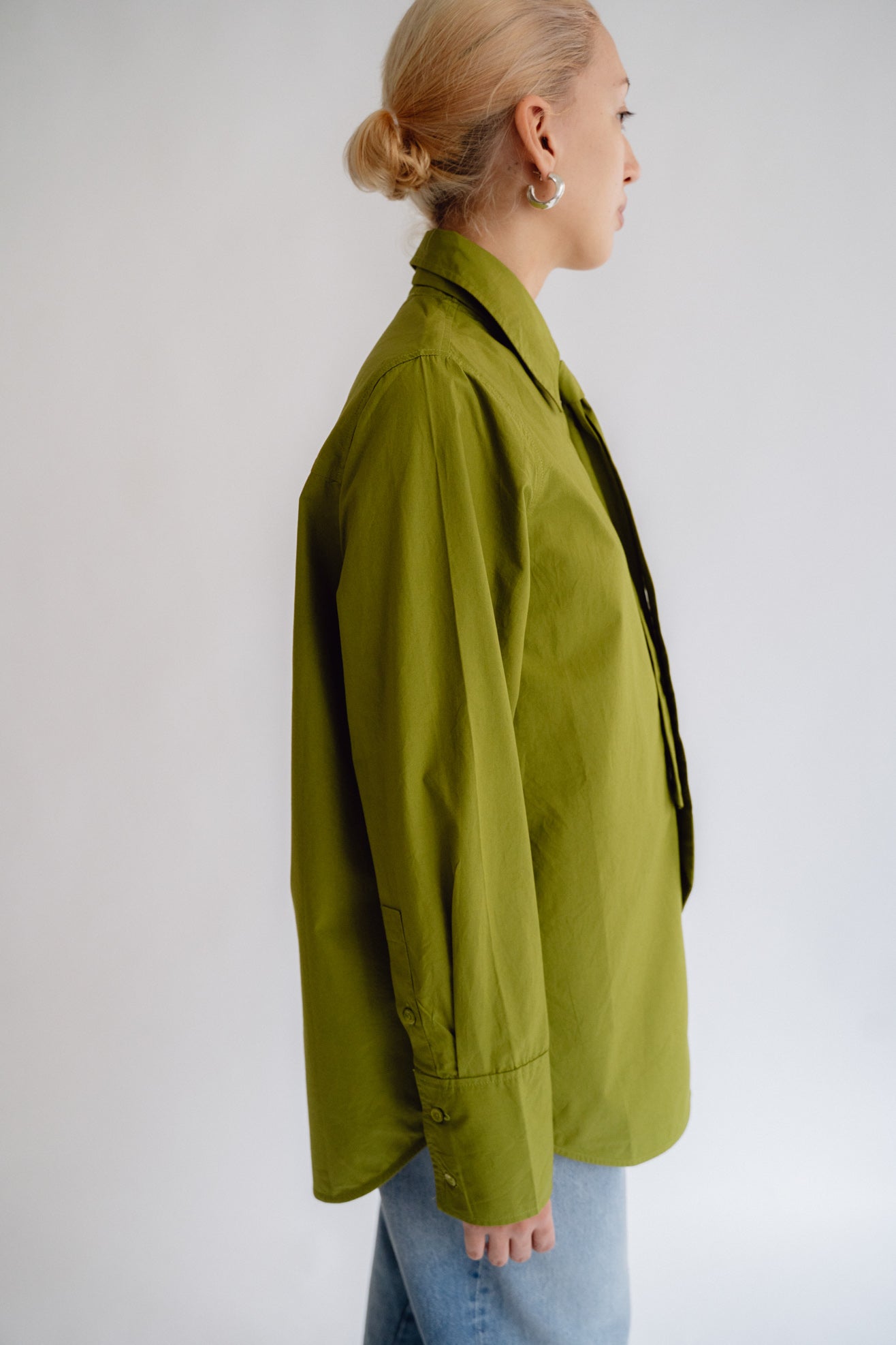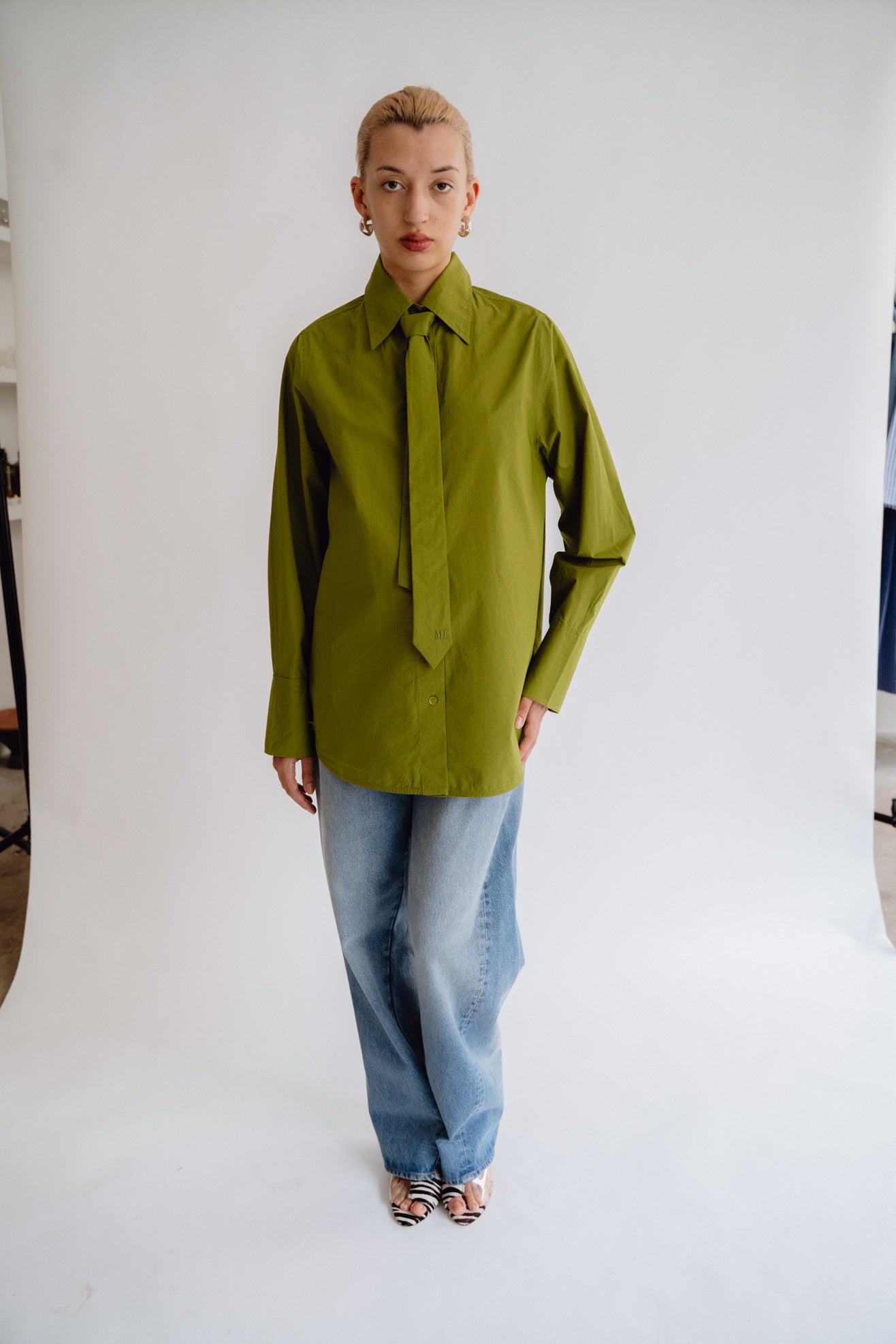 Long collared shirt in olive green poplin from BCI cotton. Shirt collar with removable tie. Full length, cuffed sleeves. MOP buttons with logo. Embroidered ML logo at hem.
