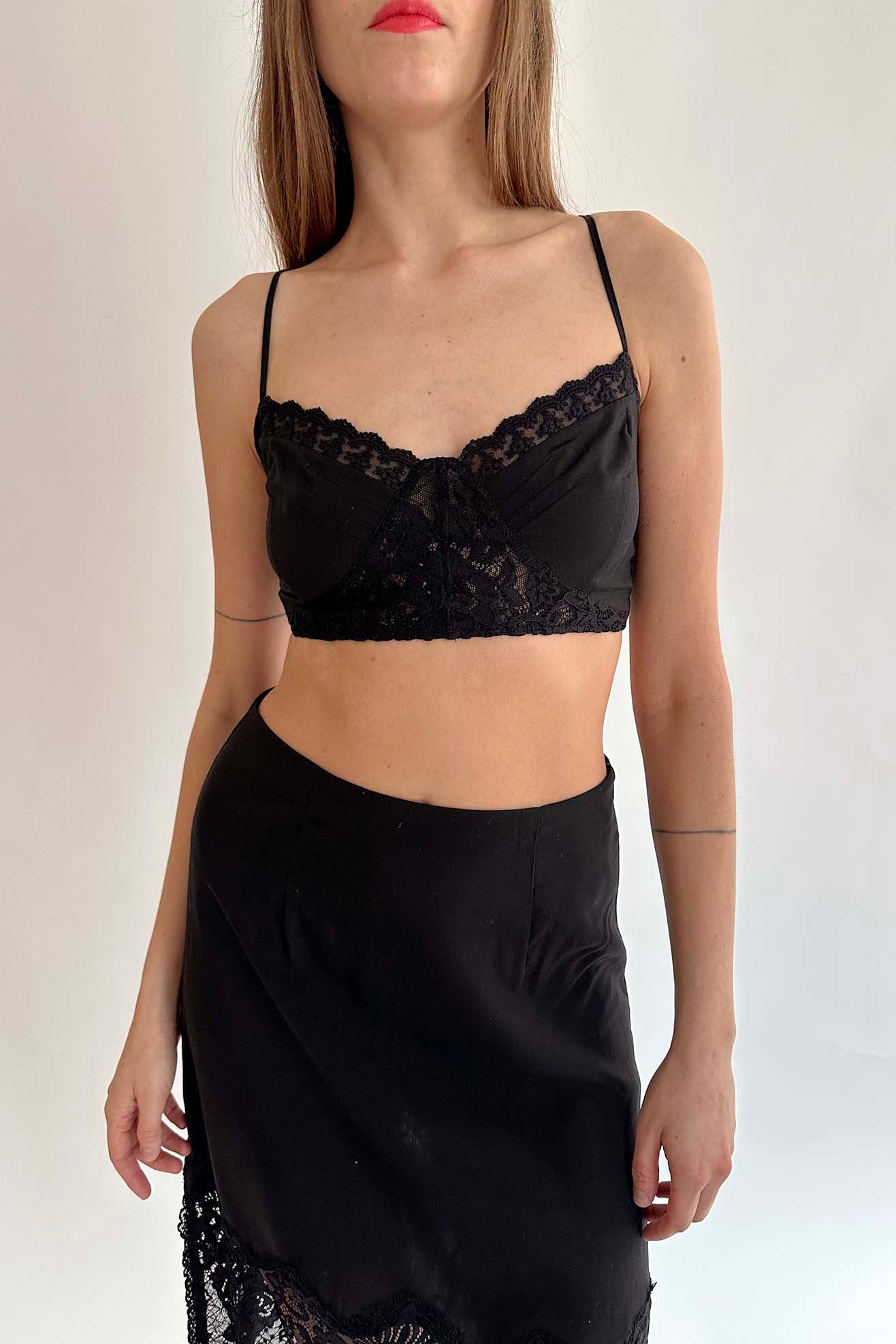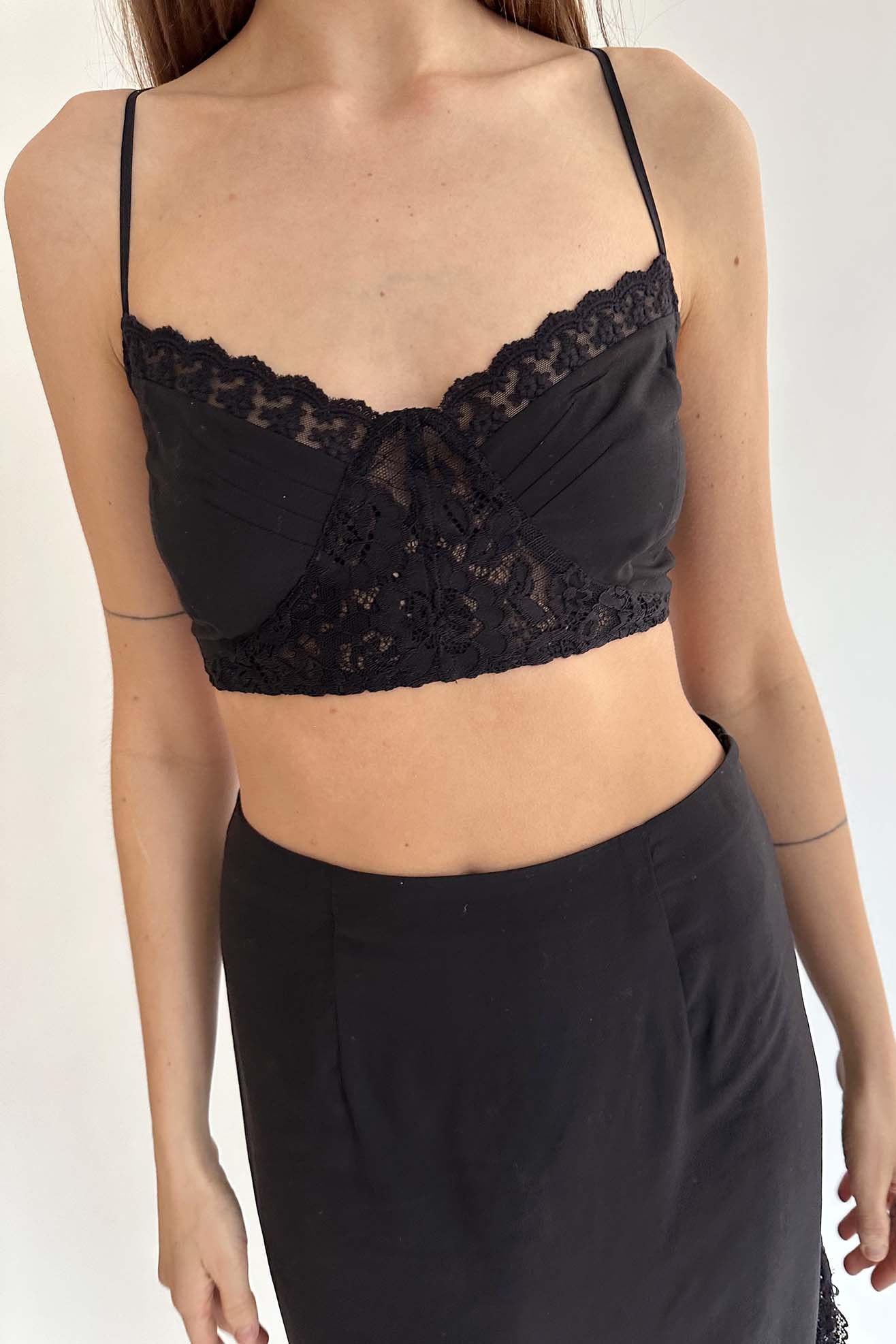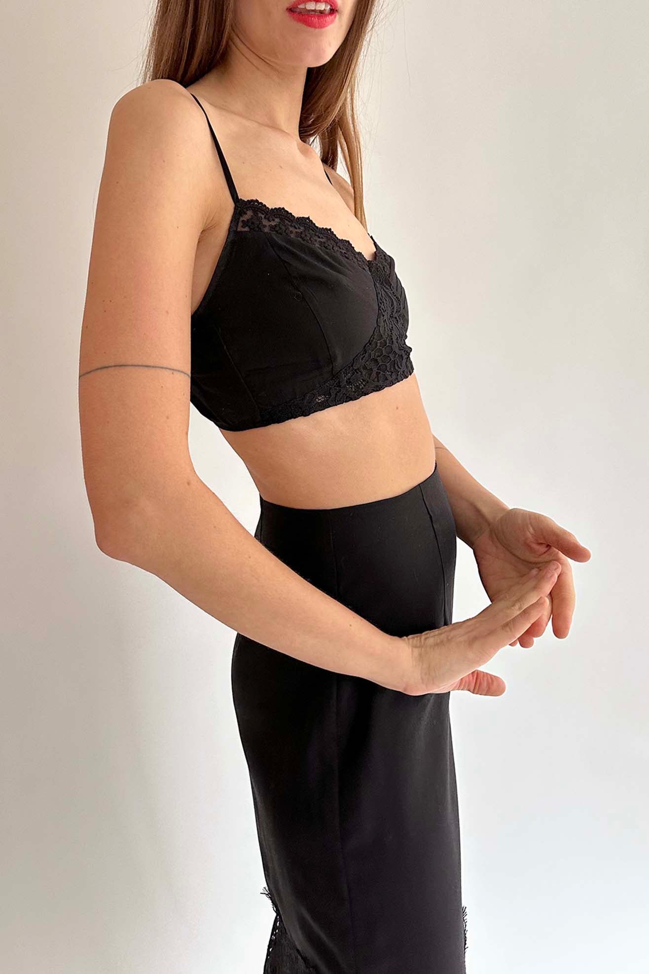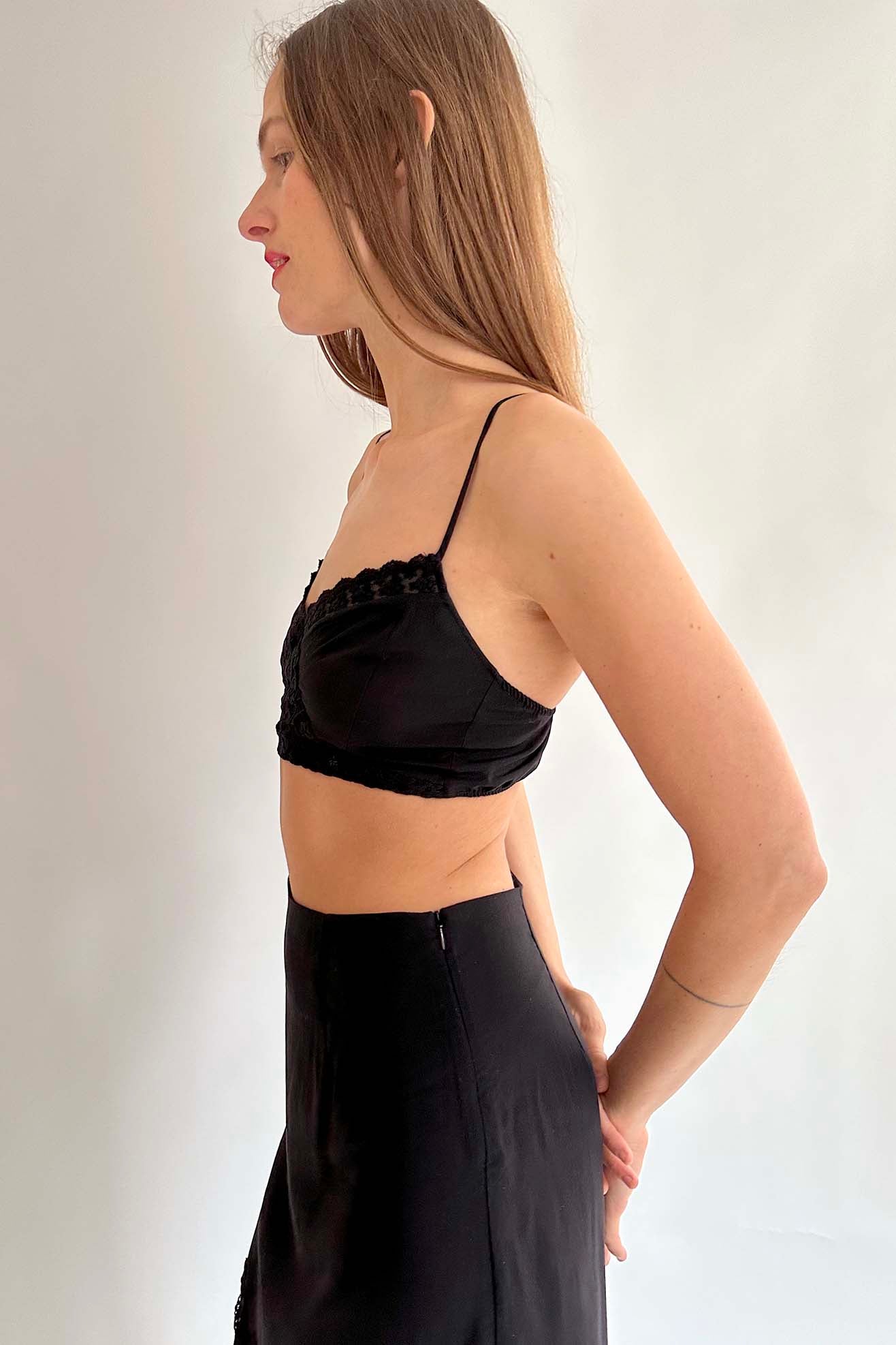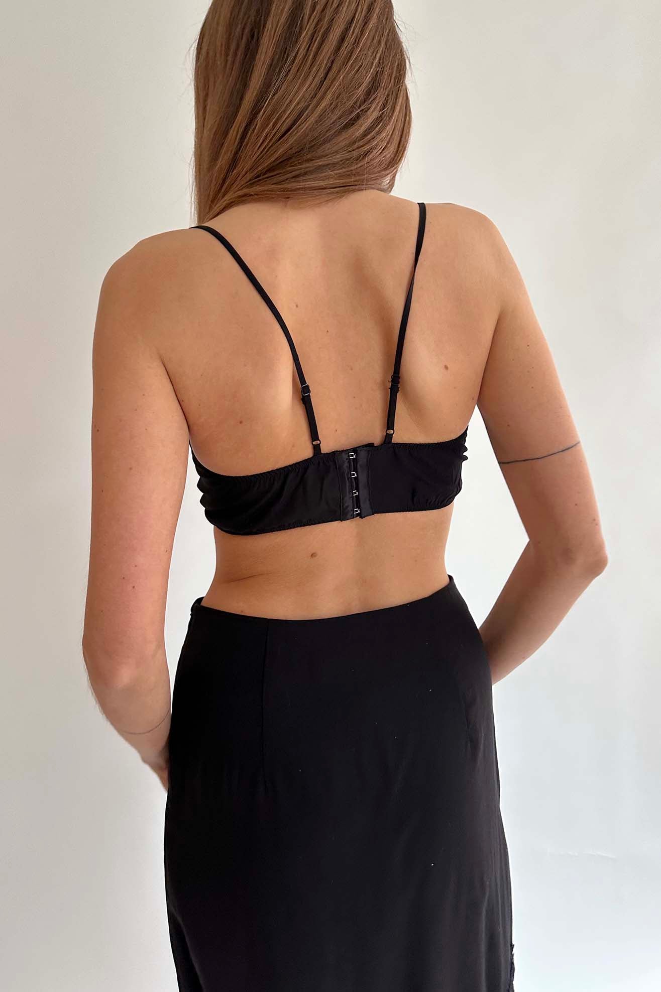 Bralette with lace trim in Black lyocell poplin. Cured seams at bust. Not intended as a supportive bra. Adjustable hook fastening at back. Adjustable shoulder straps.
