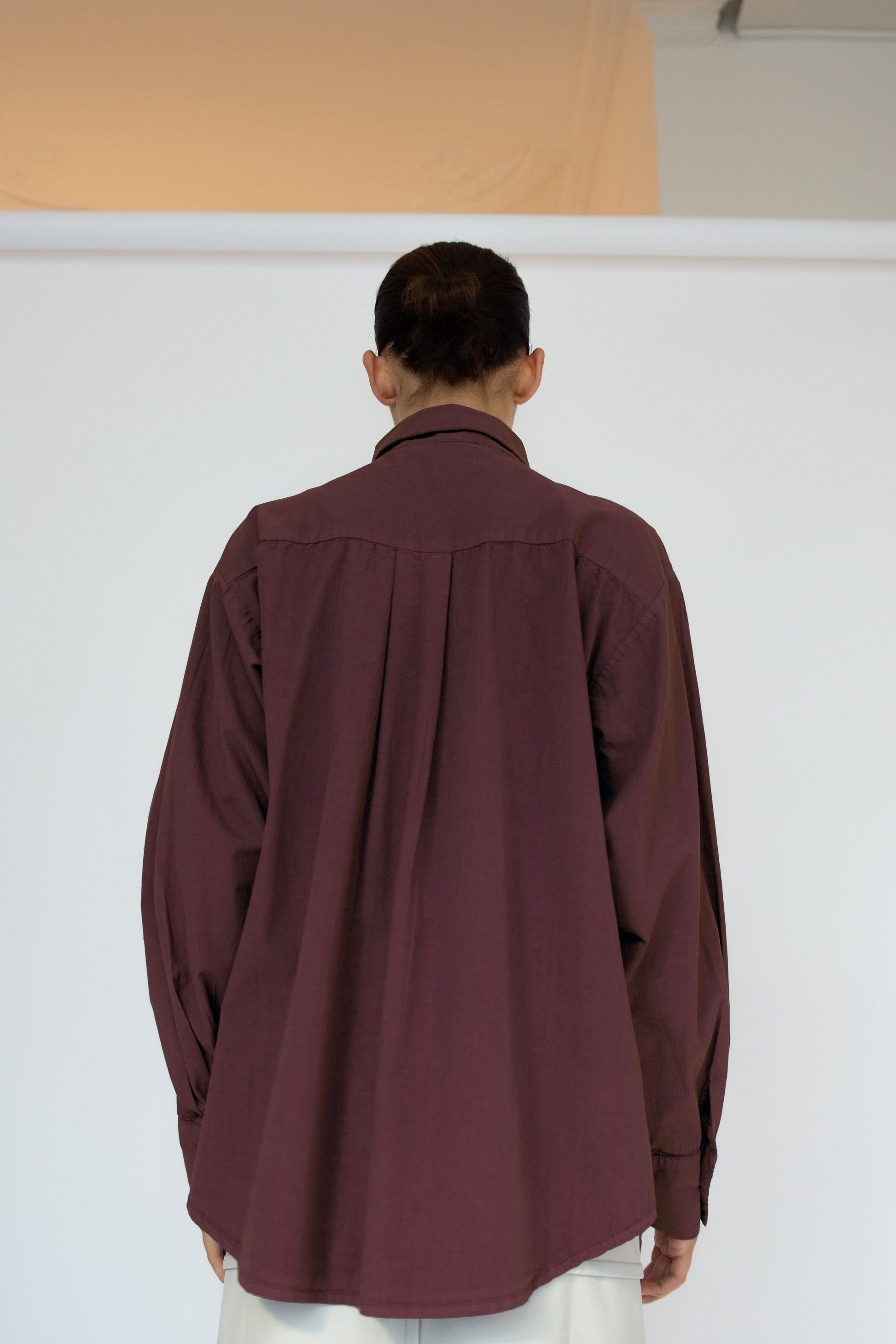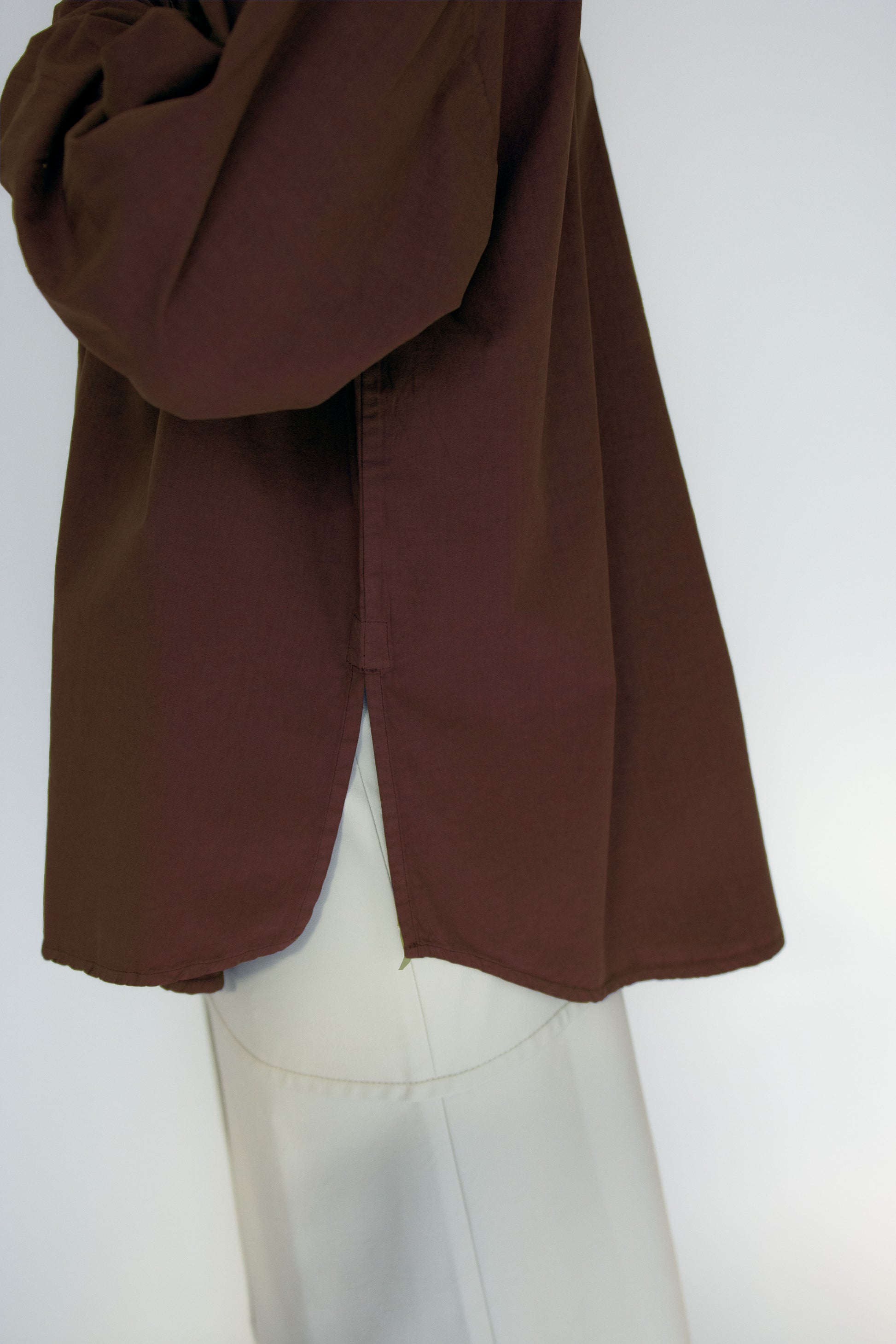 Oversized poet shirt in bark brown BCI cotton poplin. Point collar with half placket at front with tab detail. Long sleeves with wide cuff and placket. Curved hem.