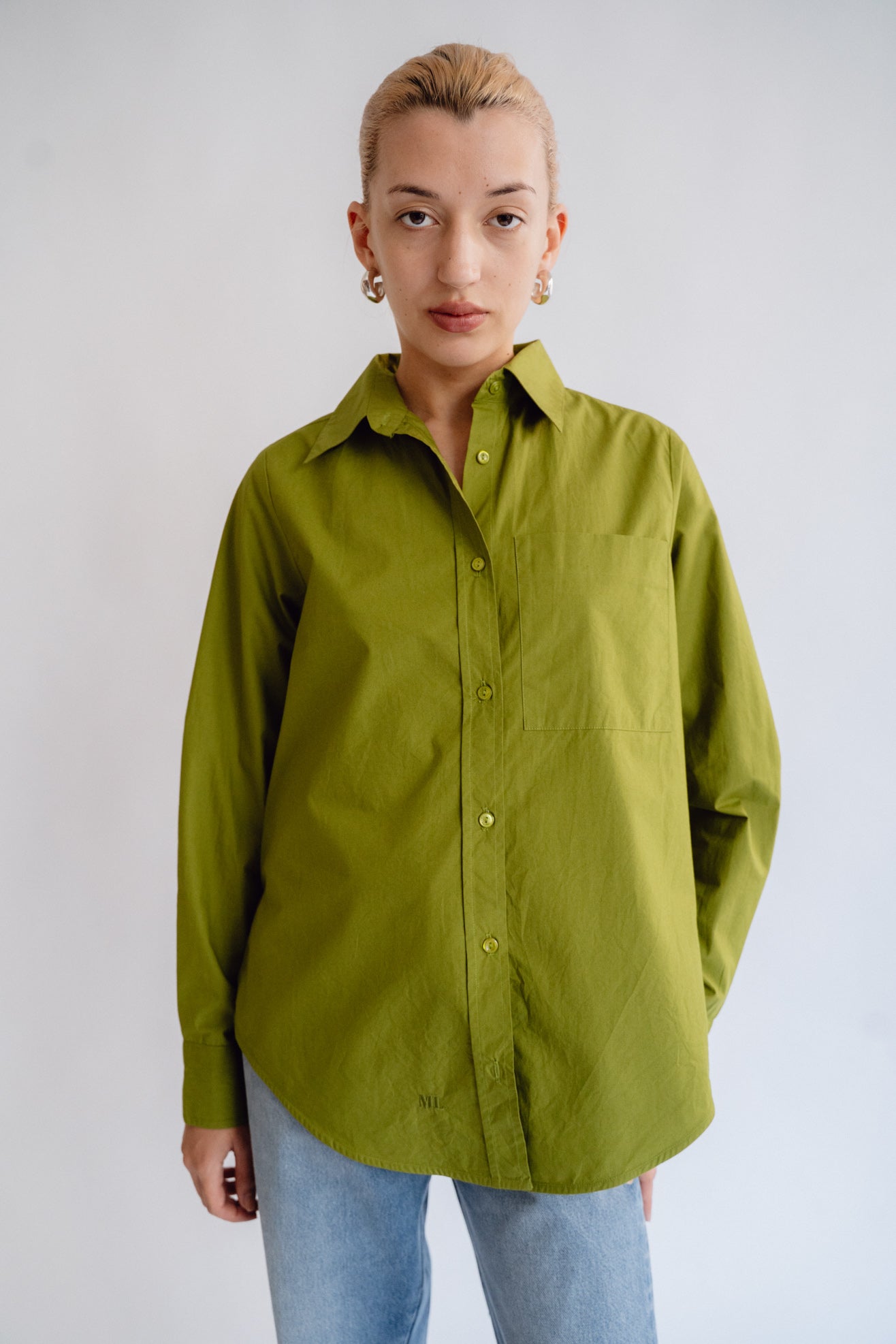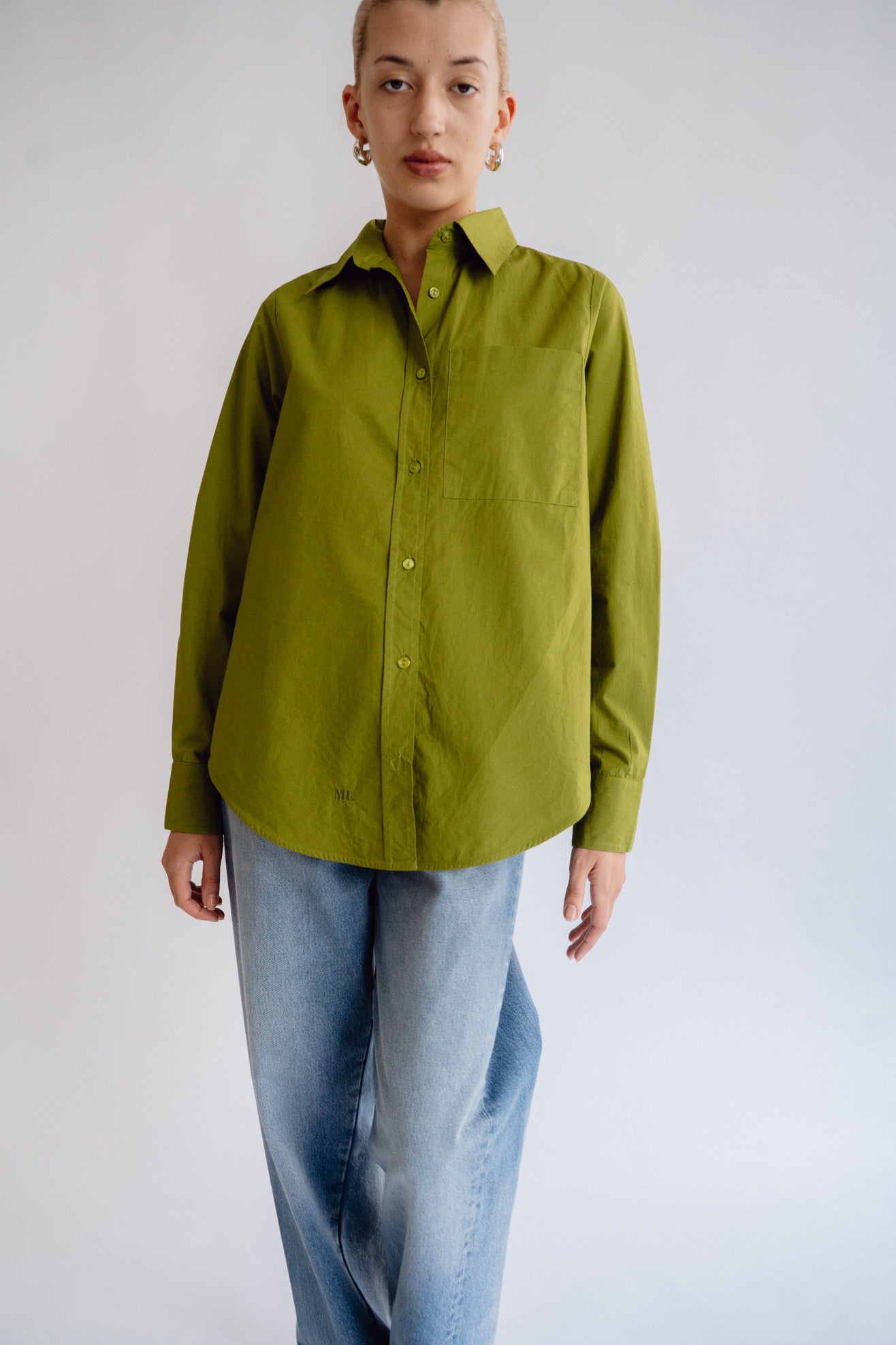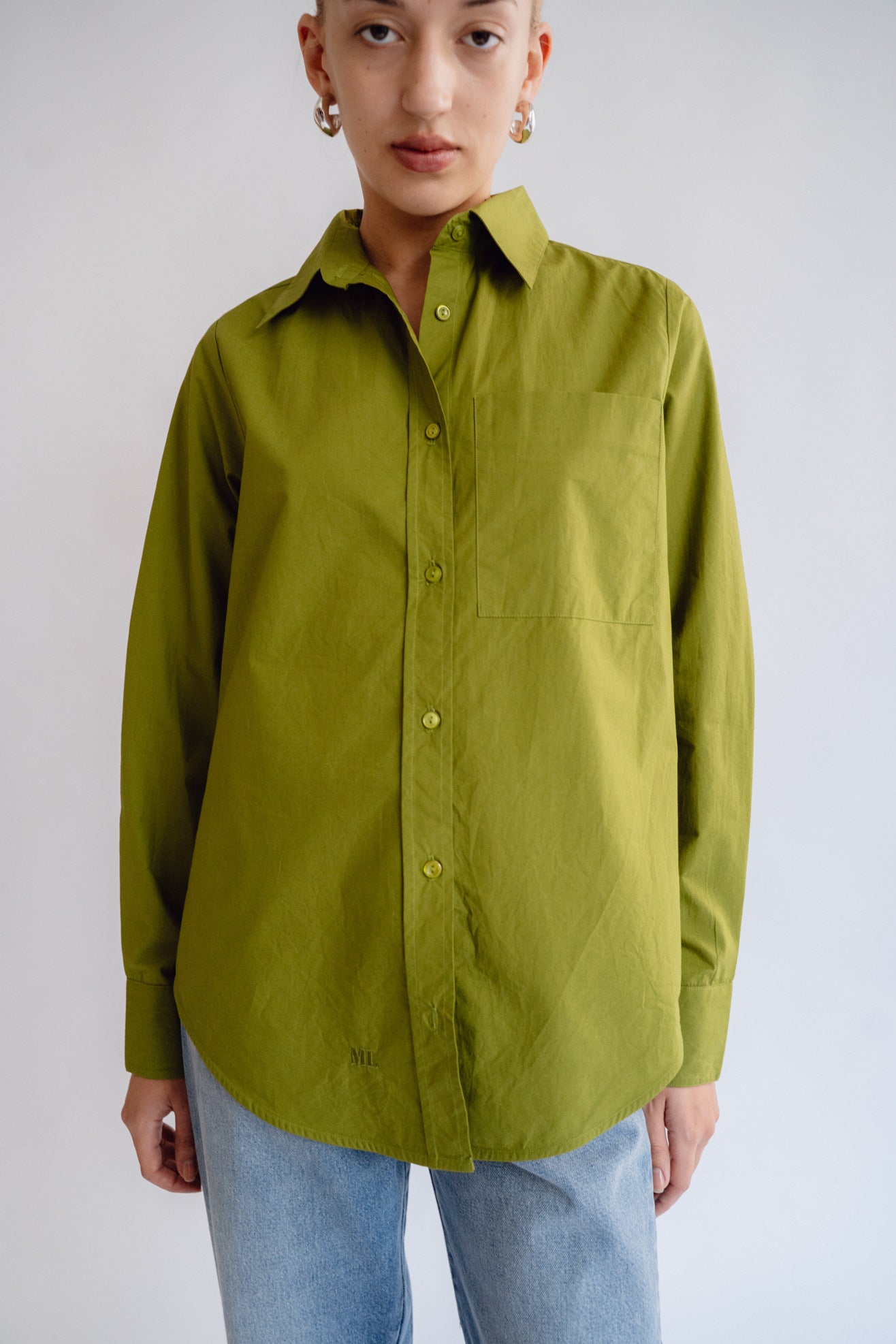 Collared shirt in olive green poplin from BCI cotton. Shirt collar. Full length, cuffed sleeves. Front pocket. MOP buttons with logo. Slits at side seam. Embroidered ML logo at hem.