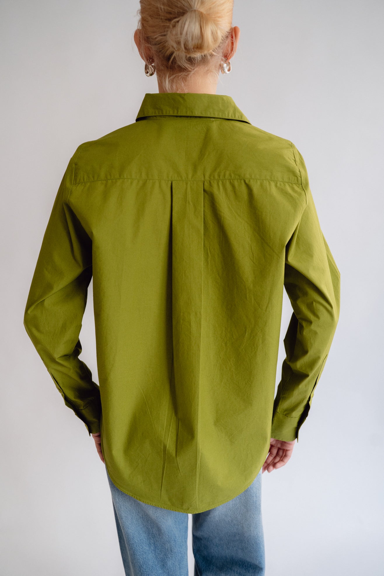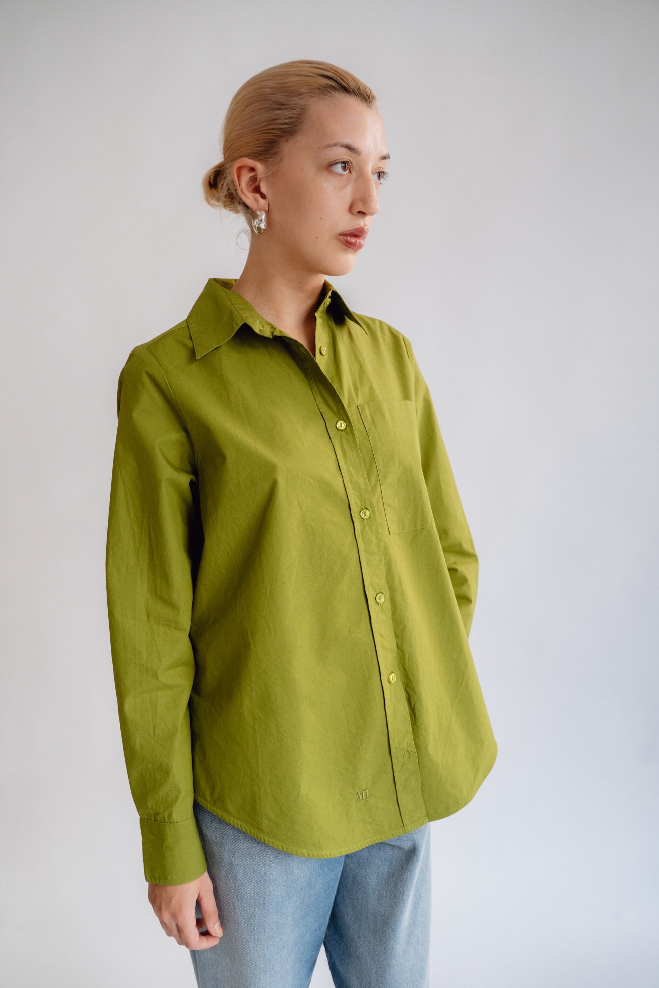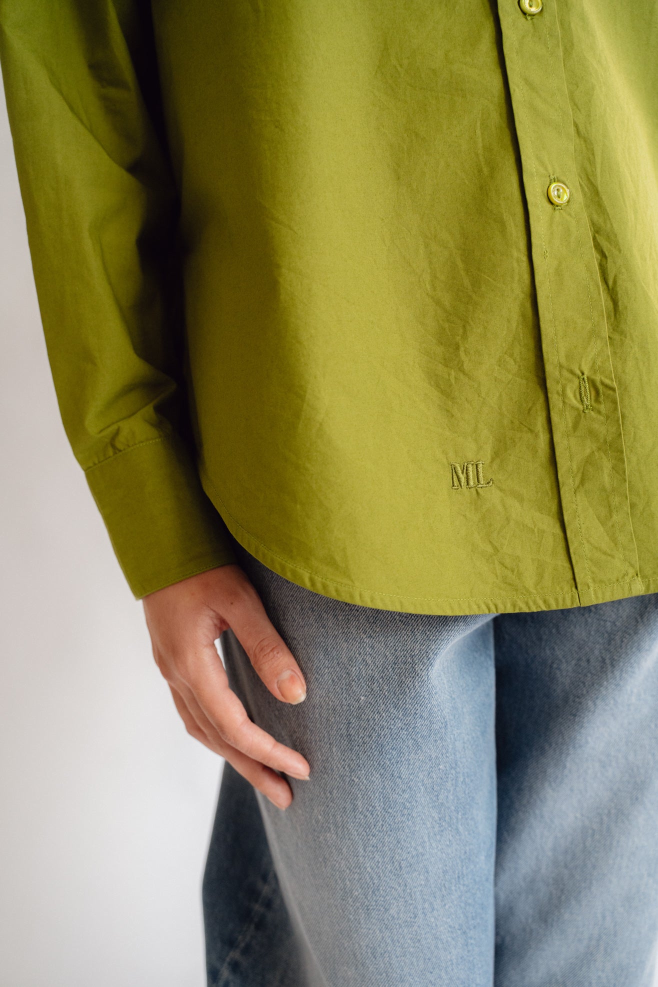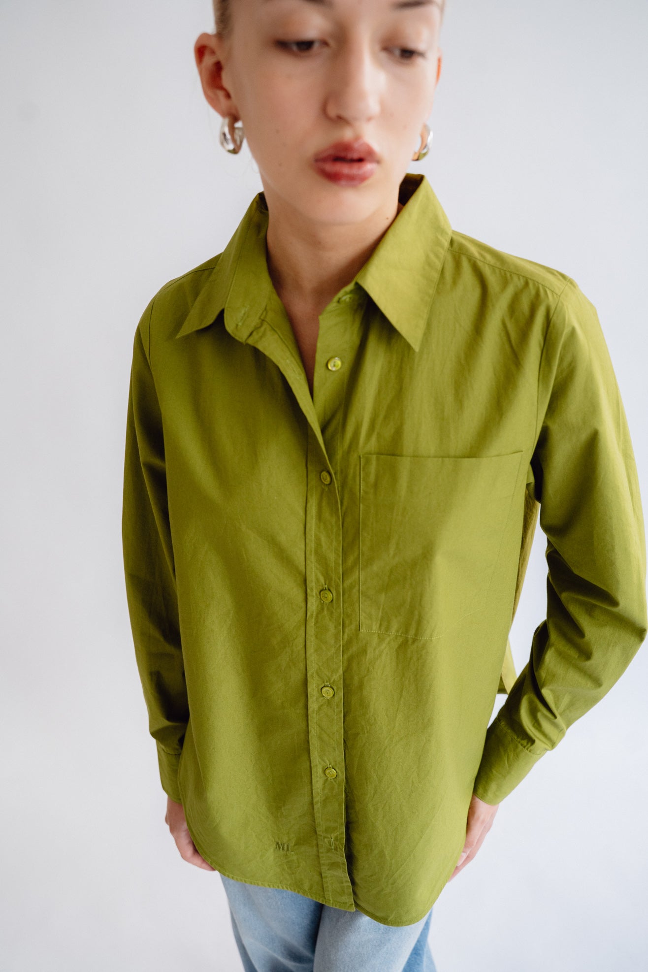 Collared shirt in olive green poplin from BCI cotton. Shirt collar. Full length, cuffed sleeves. Front pocket. MOP buttons with logo. Slits at side seam. Embroidered ML logo at hem.