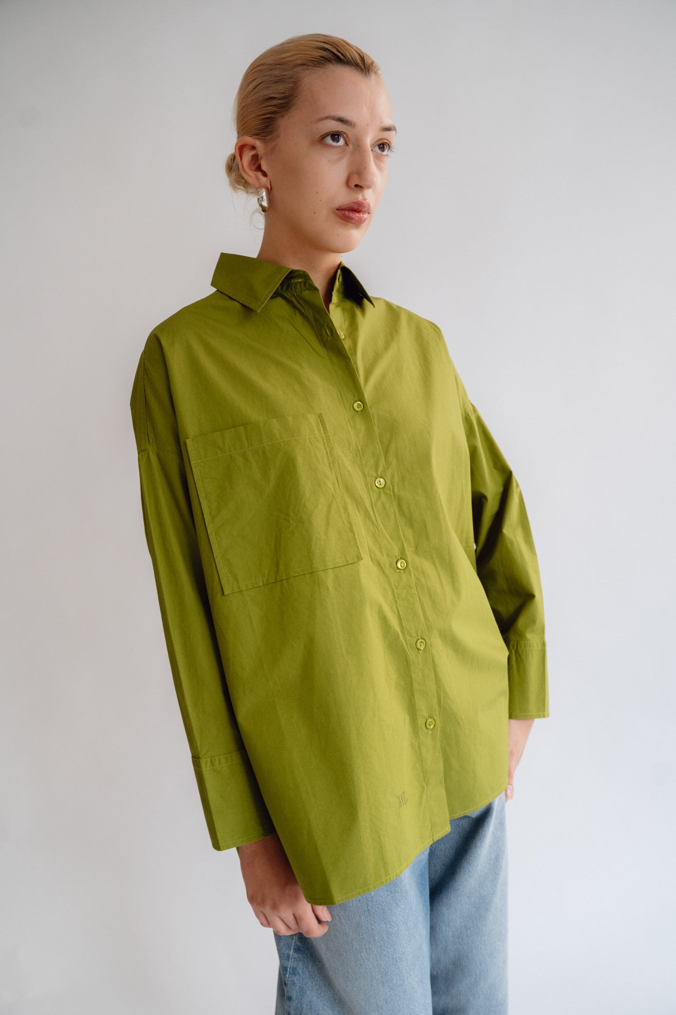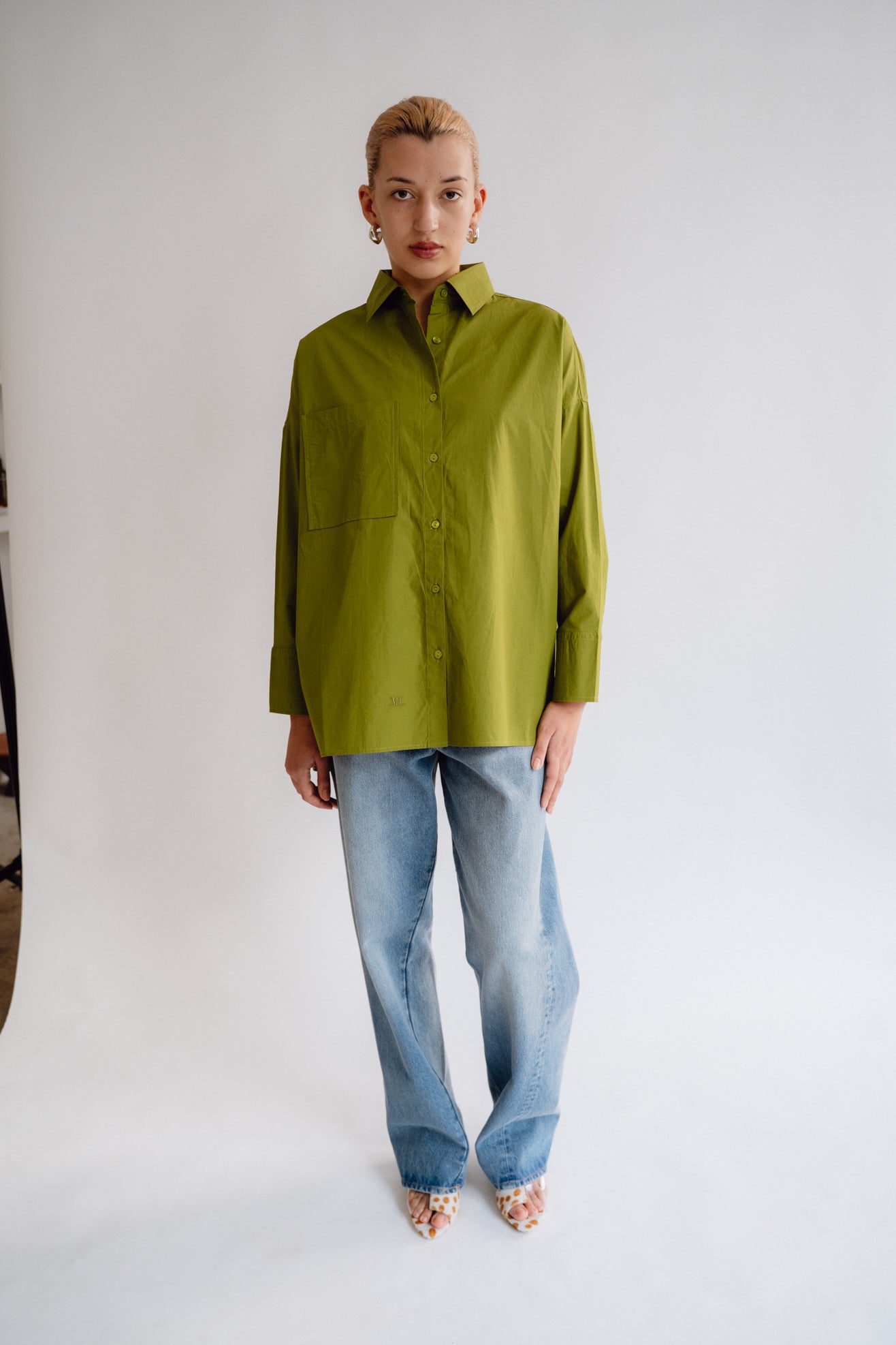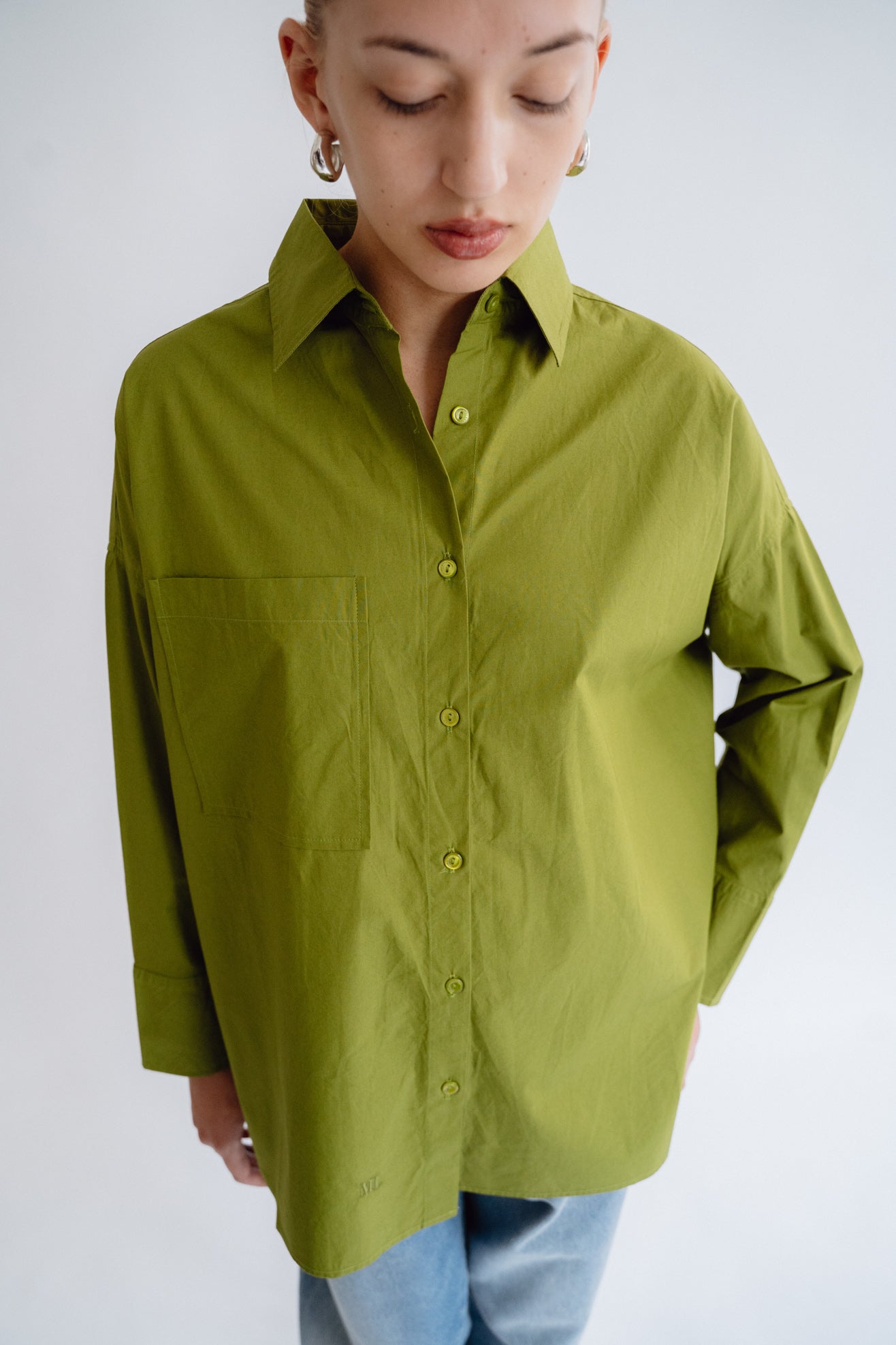 Oversized collared shirt in olive green poplin from BCI cotton. Shirt collar. Full length, cuffed sleeves. Front pocket. MOP buttons with logo. Embroidered ML logo at hem.