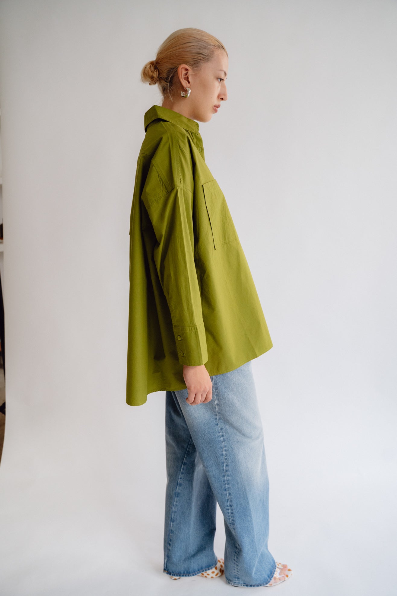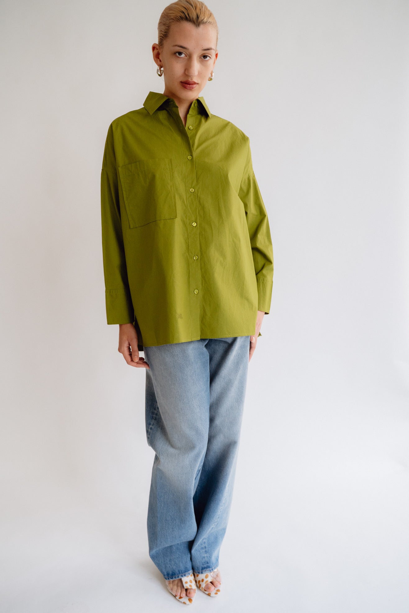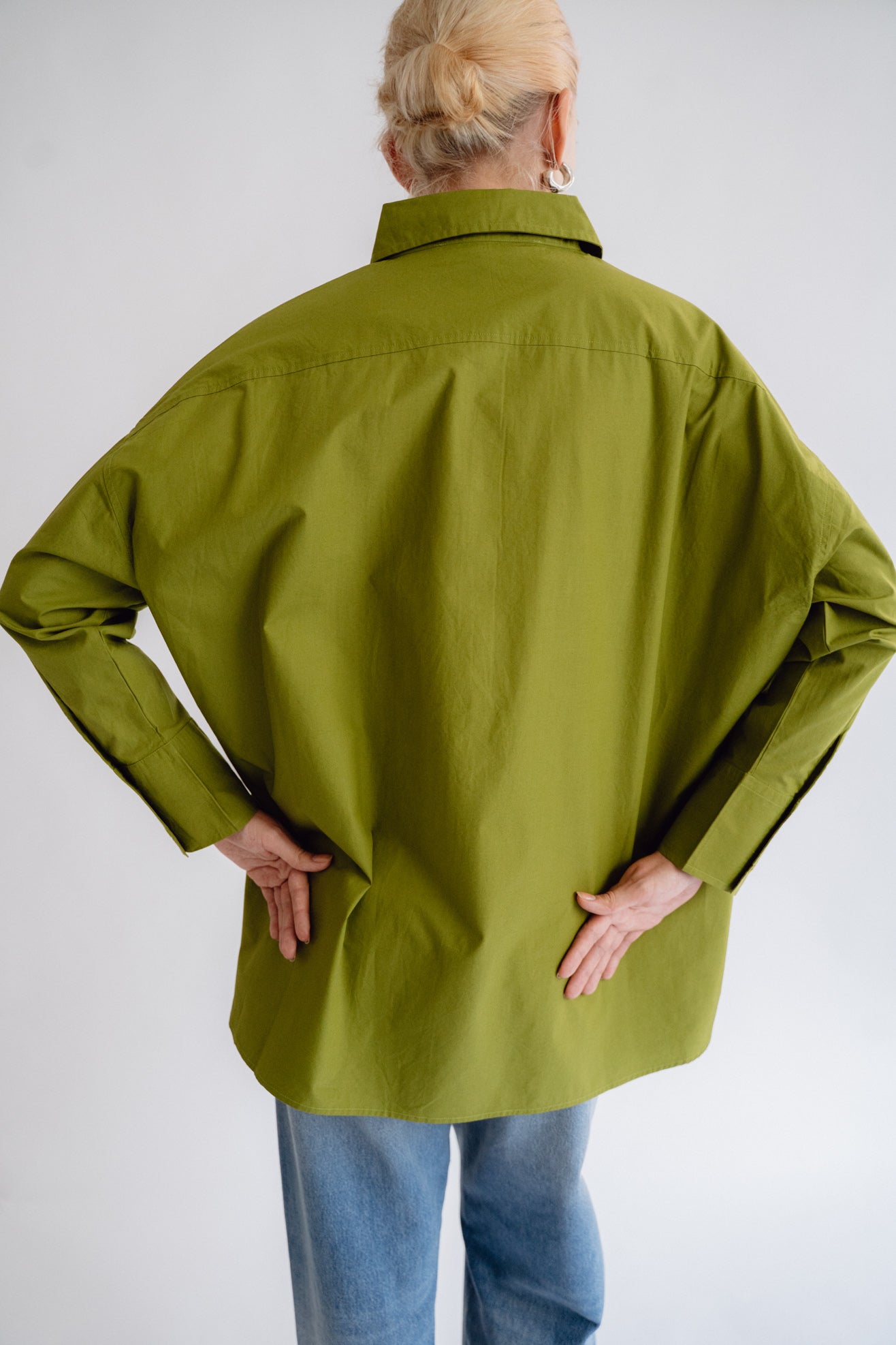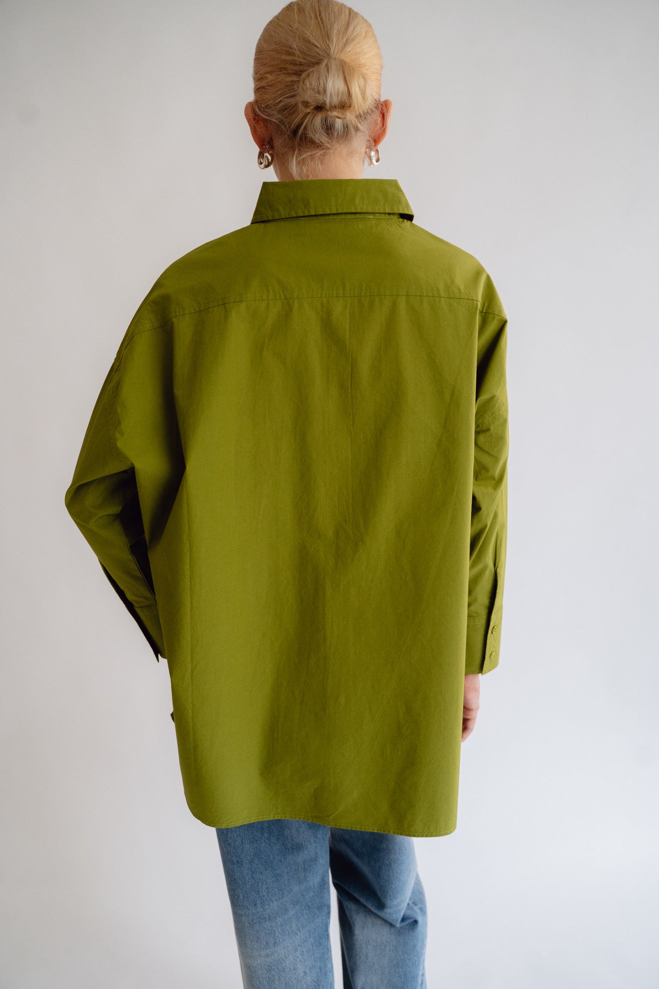 Oversized collared shirt in olive green poplin from BCI cotton. Shirt collar. Full length, cuffed sleeves. Front pocket. MOP buttons with logo. Embroidered ML logo at hem.